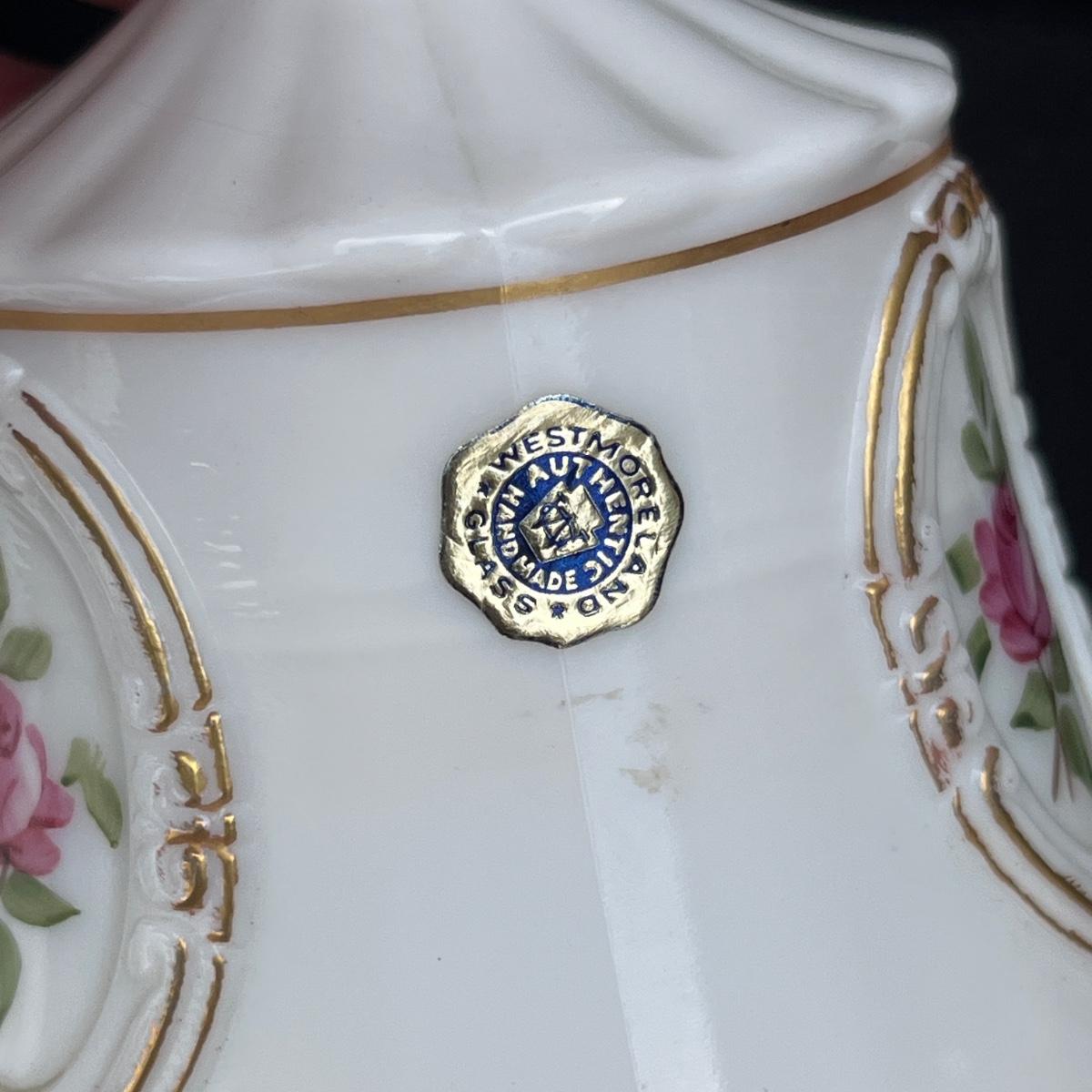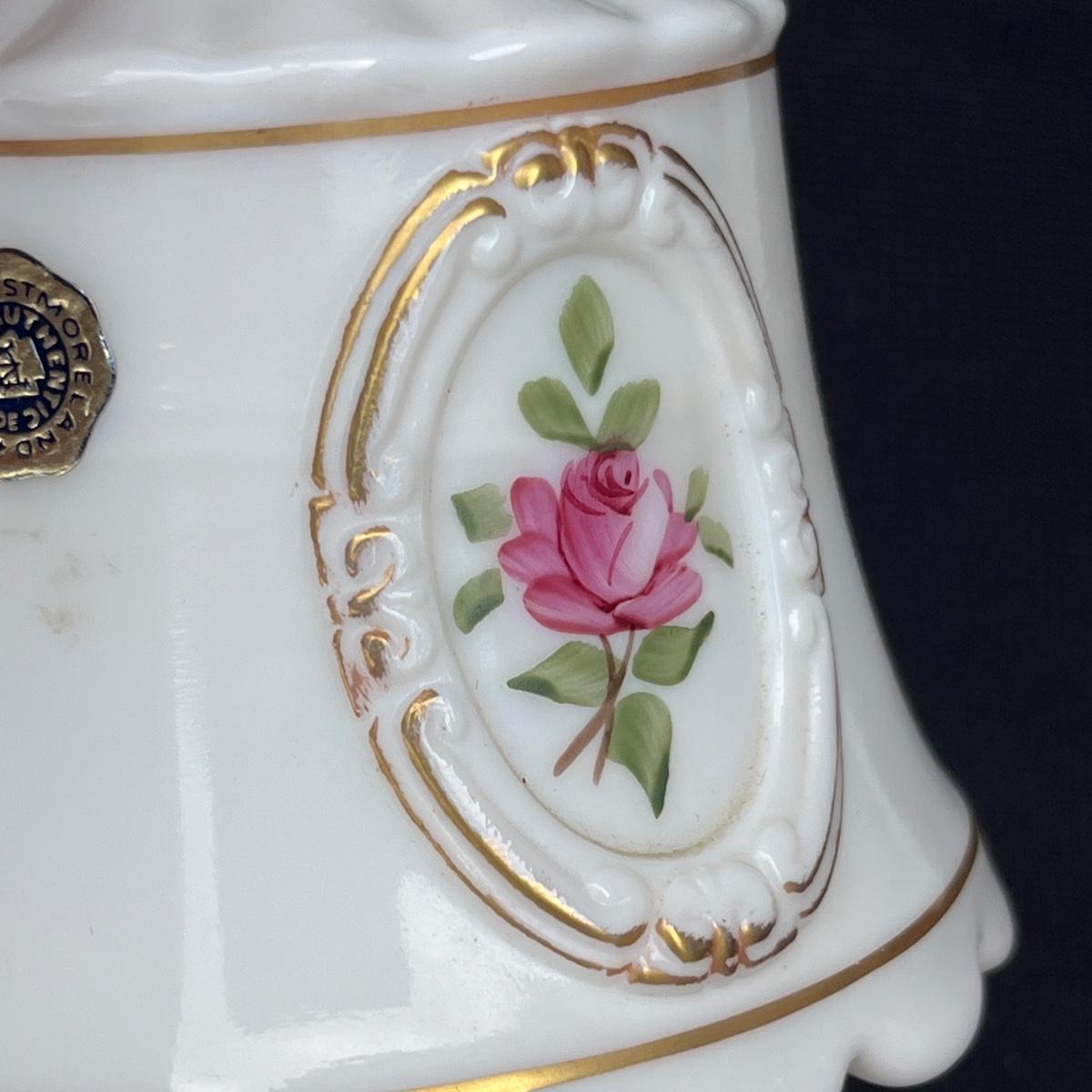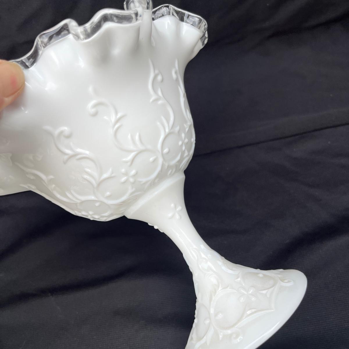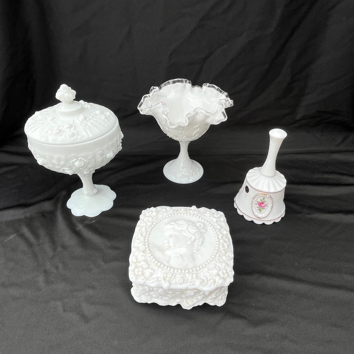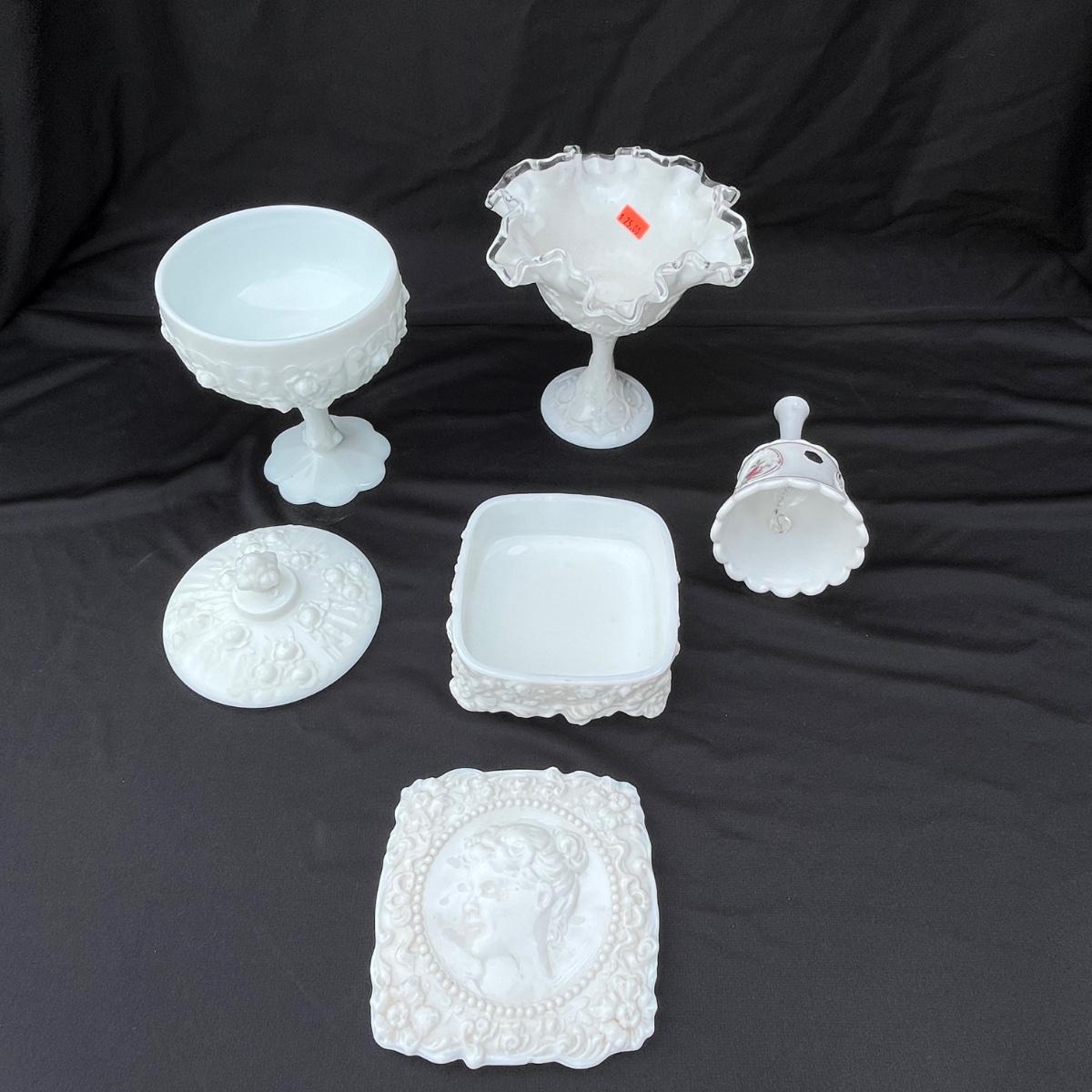 Fenton candy & compote. Westmoreland bell. Fostoria Jenny Lind box. Box has some lid chips, hidden when lid is on base.