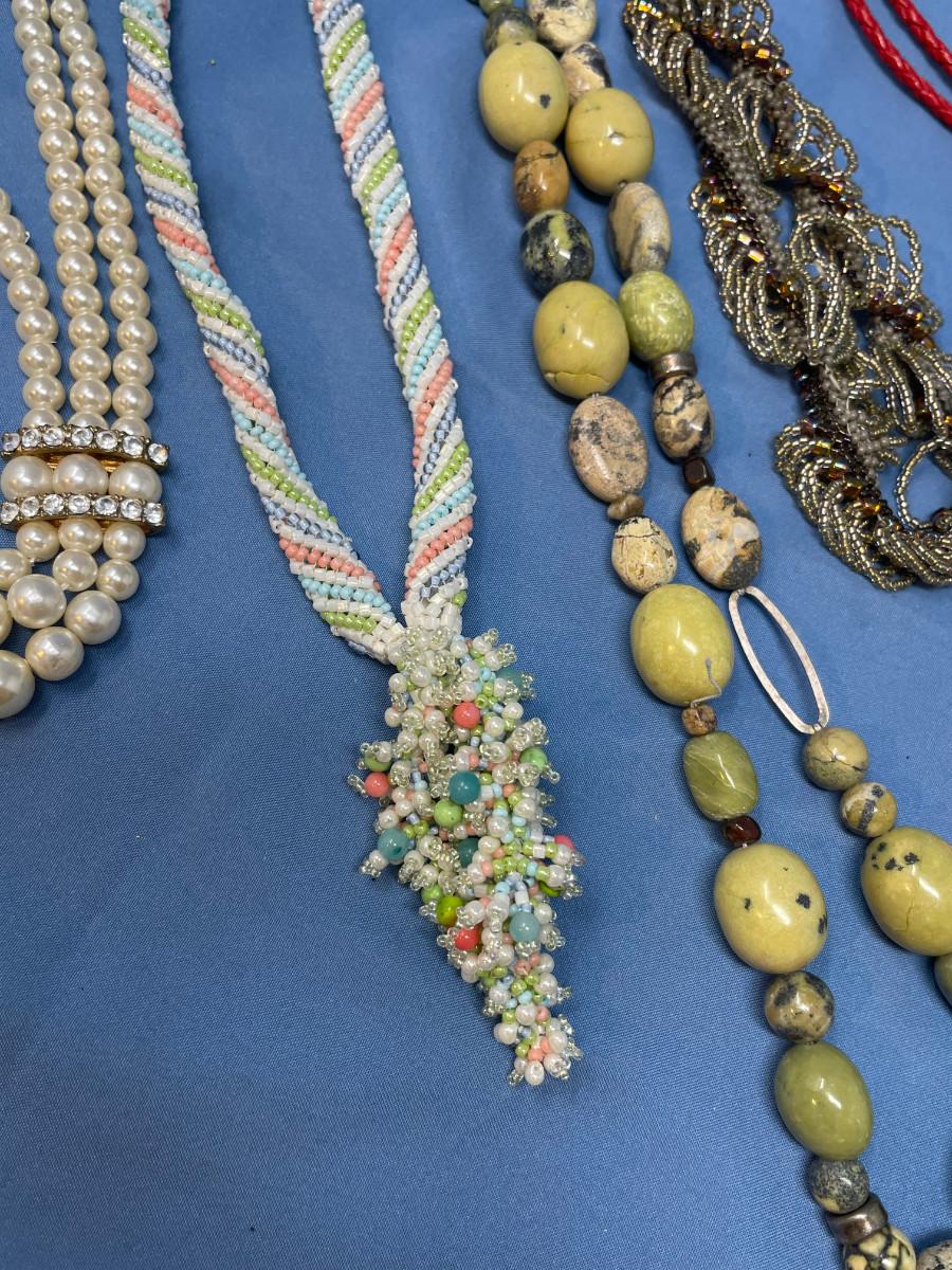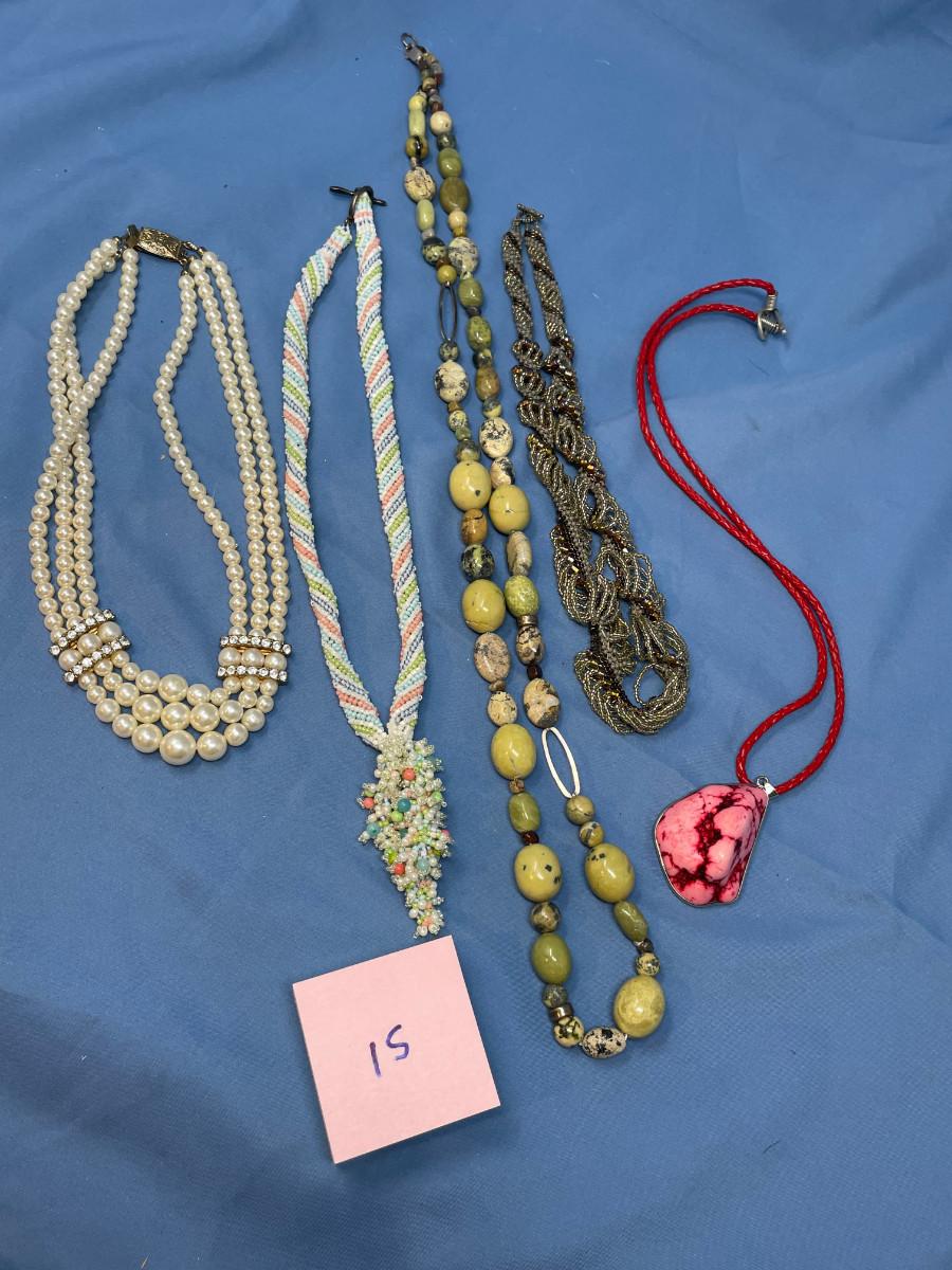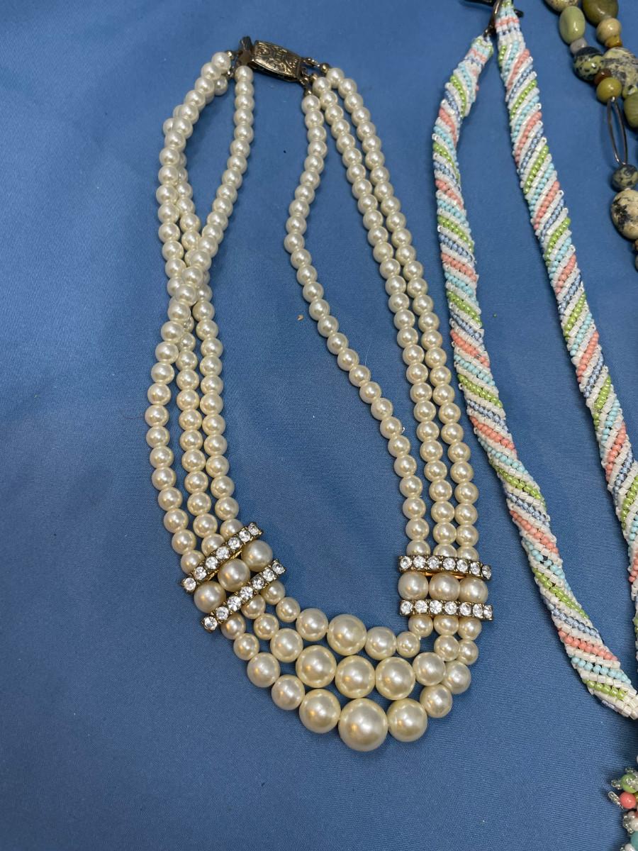 The pearls has one strand end needs attached. The two mini bead necklaces look to be 1920s.