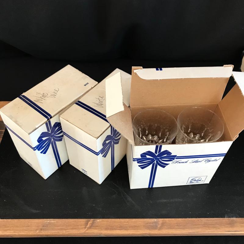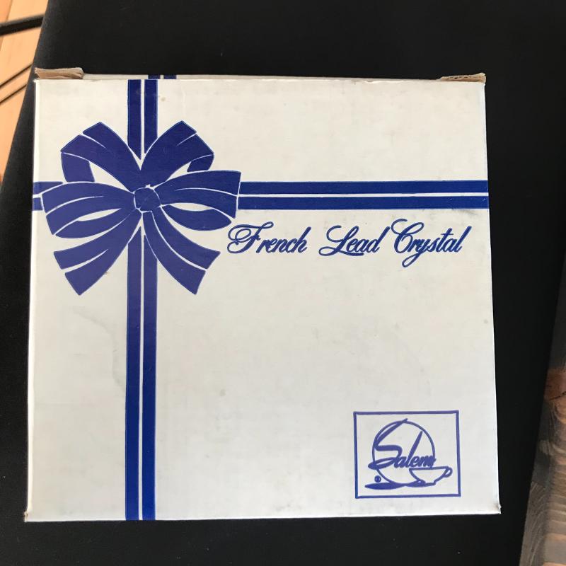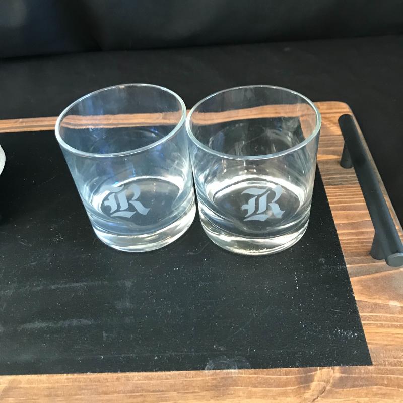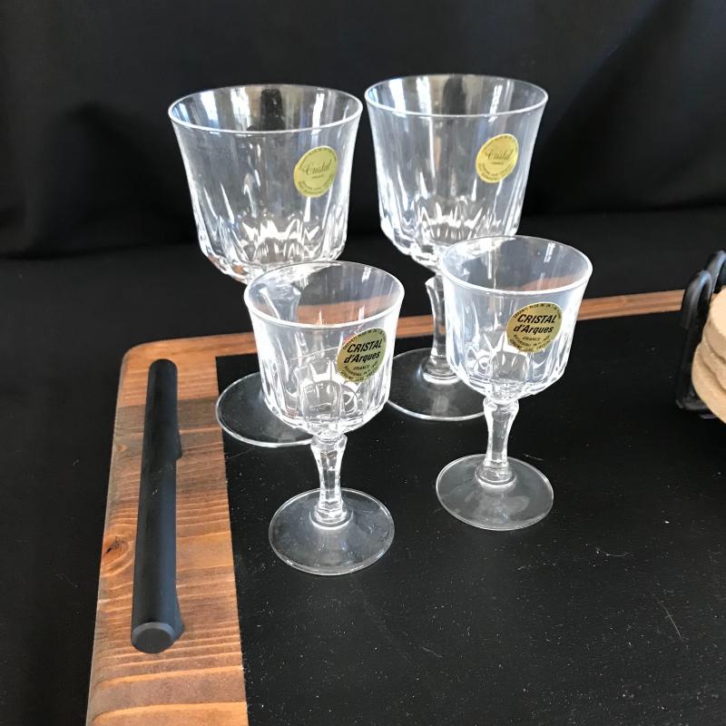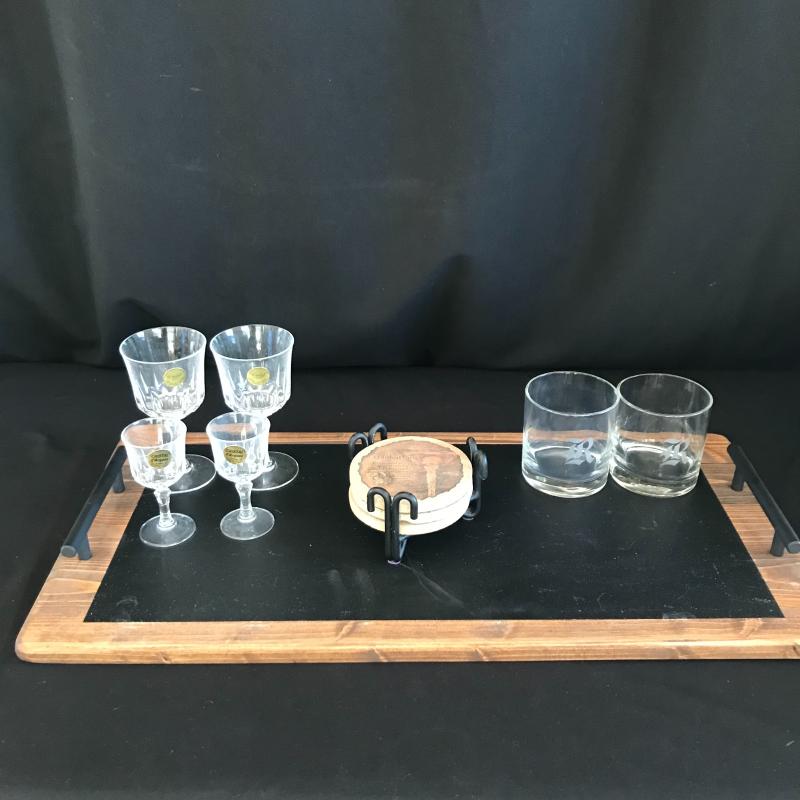 Wooden Tray painted blackboard on top with Three coaster set and 6 Lead Crystal Wine Glasses and 4 matching Crystal Cordials. All Crystal glass pieces have original boxes. Also includes two cocktail glasses engraved with the letter”R”. Shipping or local pick up in Asheville, NC.