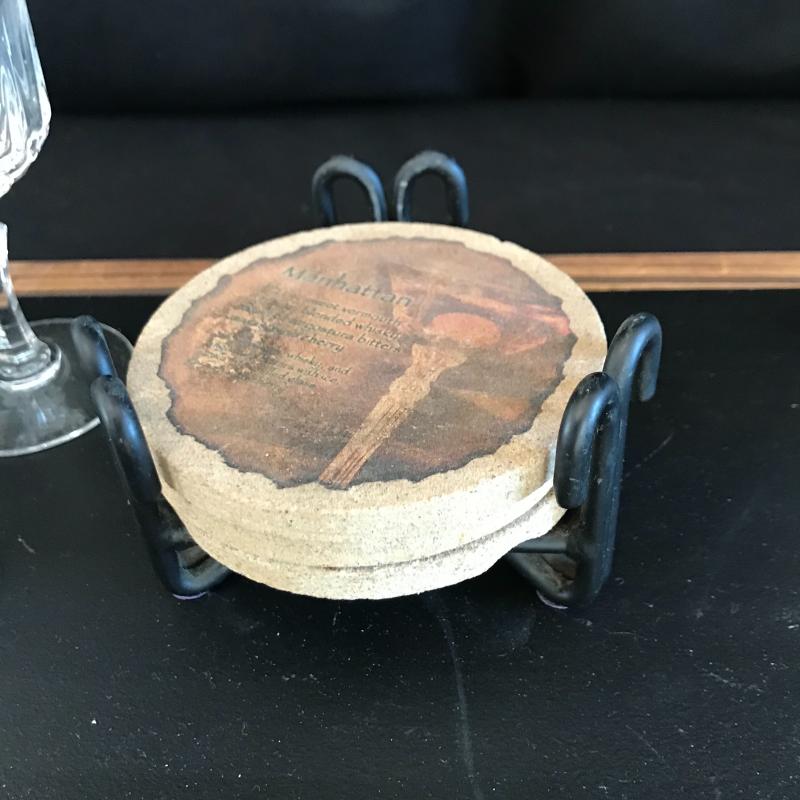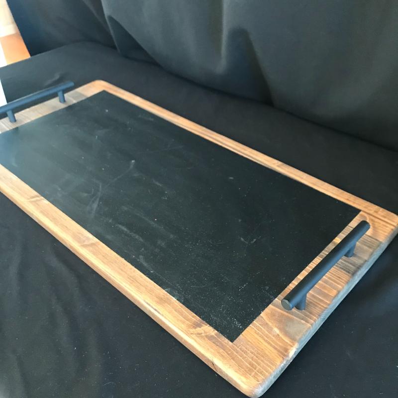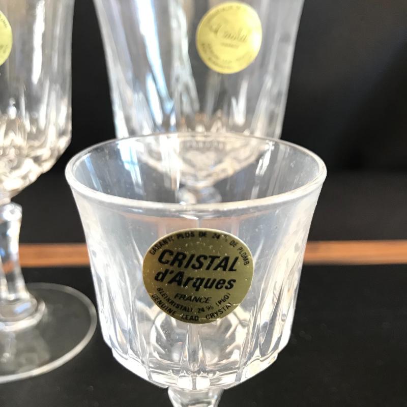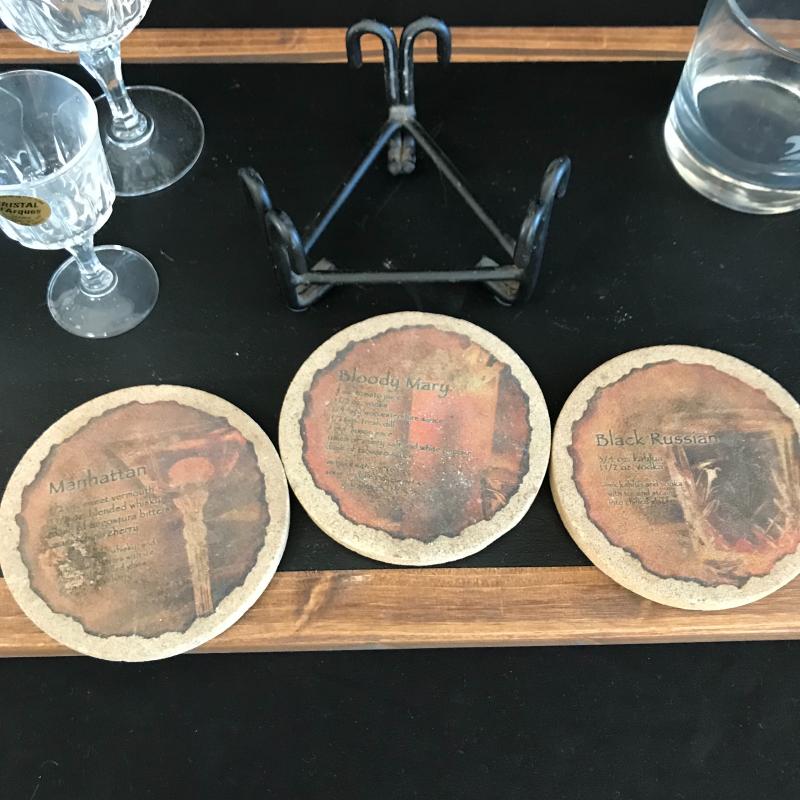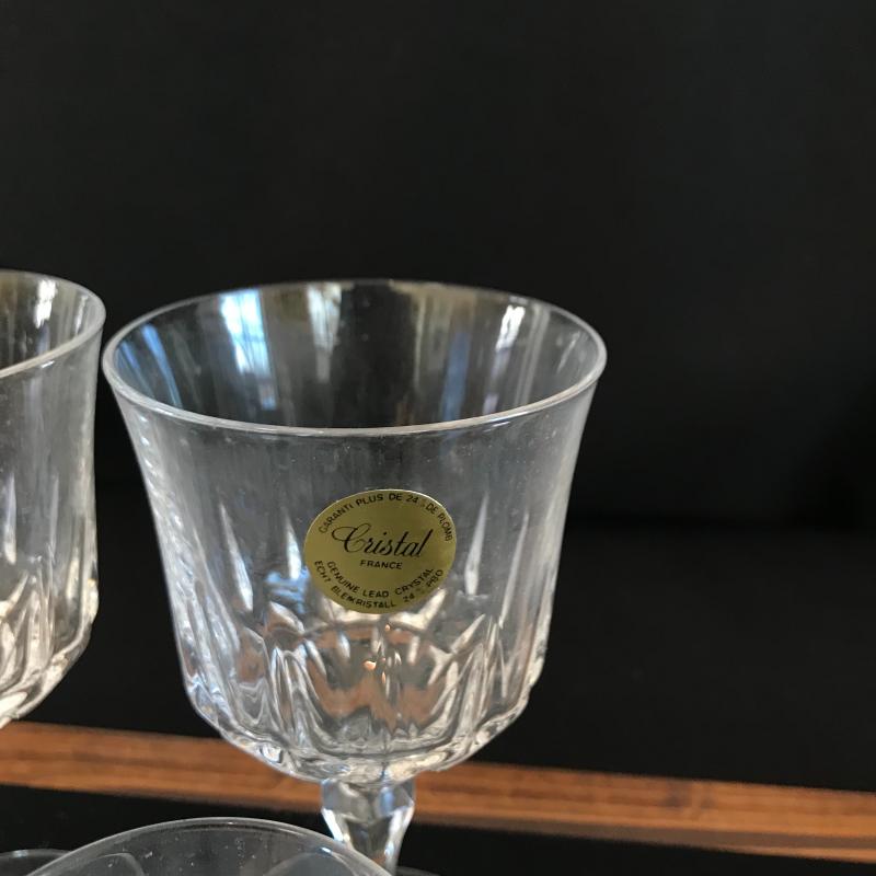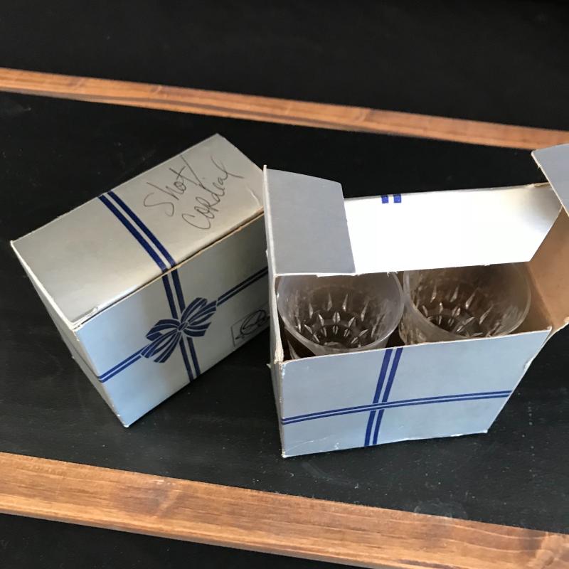 Wooden Tray painted blackboard on top with Three coaster set and 6 Lead Crystal Wine Glasses and 4 matching Crystal Cordials. All Crystal glass pieces have original boxes. Also includes two cocktail glasses engraved with the letter”R”. Shipping or local pick up in Asheville, NC.