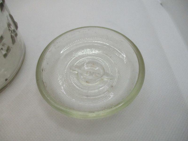 I'm basing the age on the neck of the jar - notice how it is straight and smooth. The jar is not clear, it has a very faint amber tint to it. There are two seams in the jar and a couple of very tiny air bubbles. It is in beautiful condition - no chips or cracks found. The bottom is embossed "8 A B D" and is about 7.5" tall.