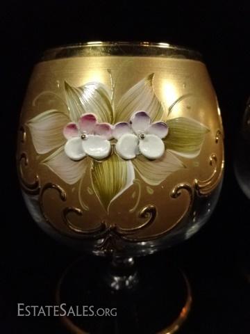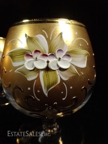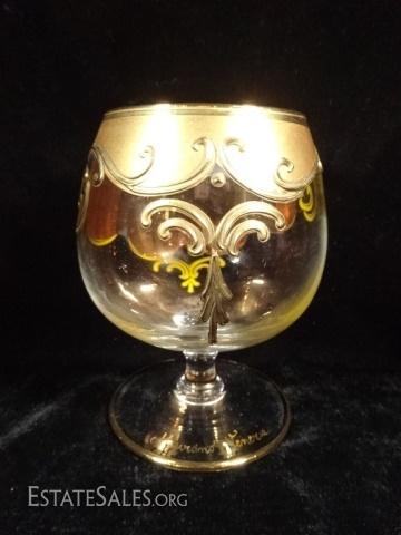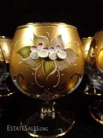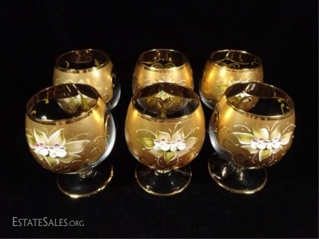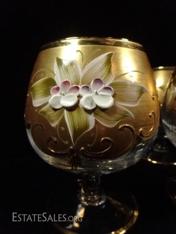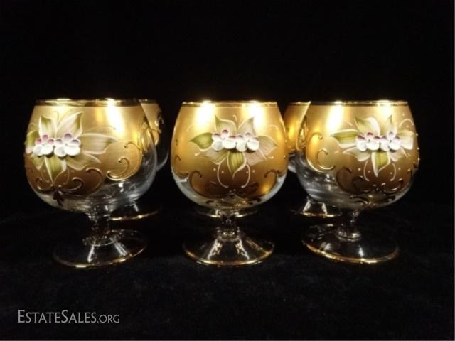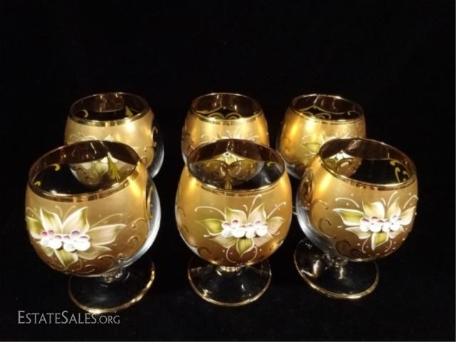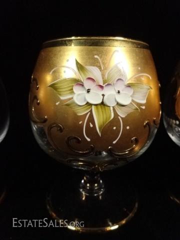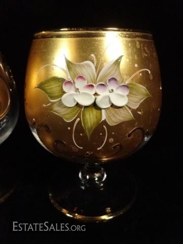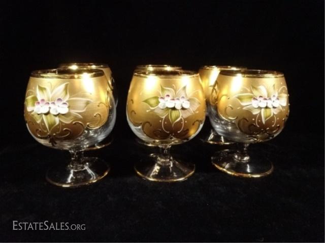 LOT 15: 6 PC MURANO VENEZIA BRANDY SNIFTERS, APPLIED FLORAL DESIGN, GOLD GILT, SIGNED MURANO VENEZIA, APPROX 4 7/8"