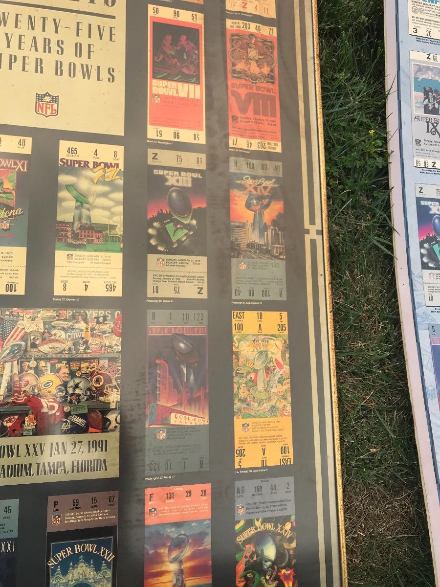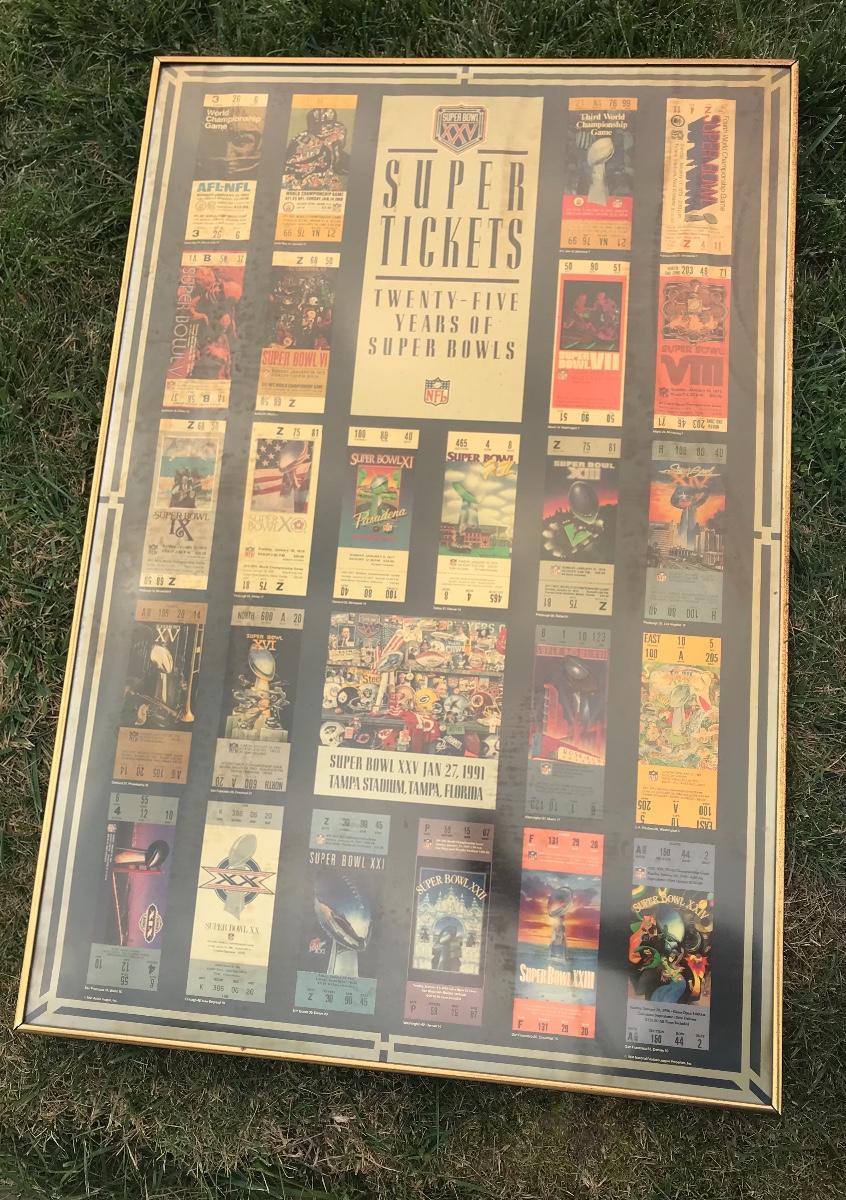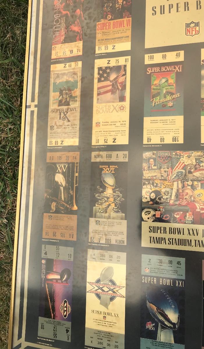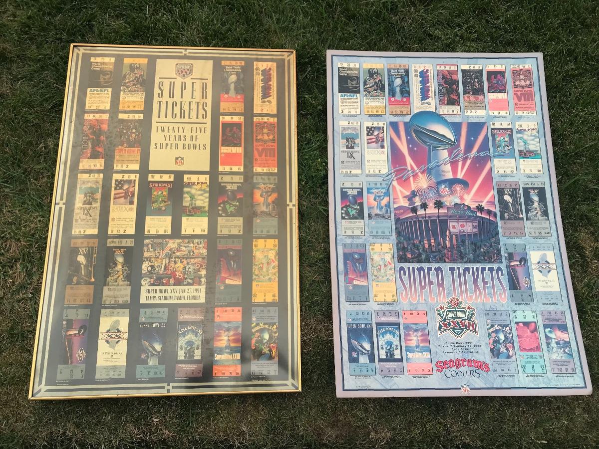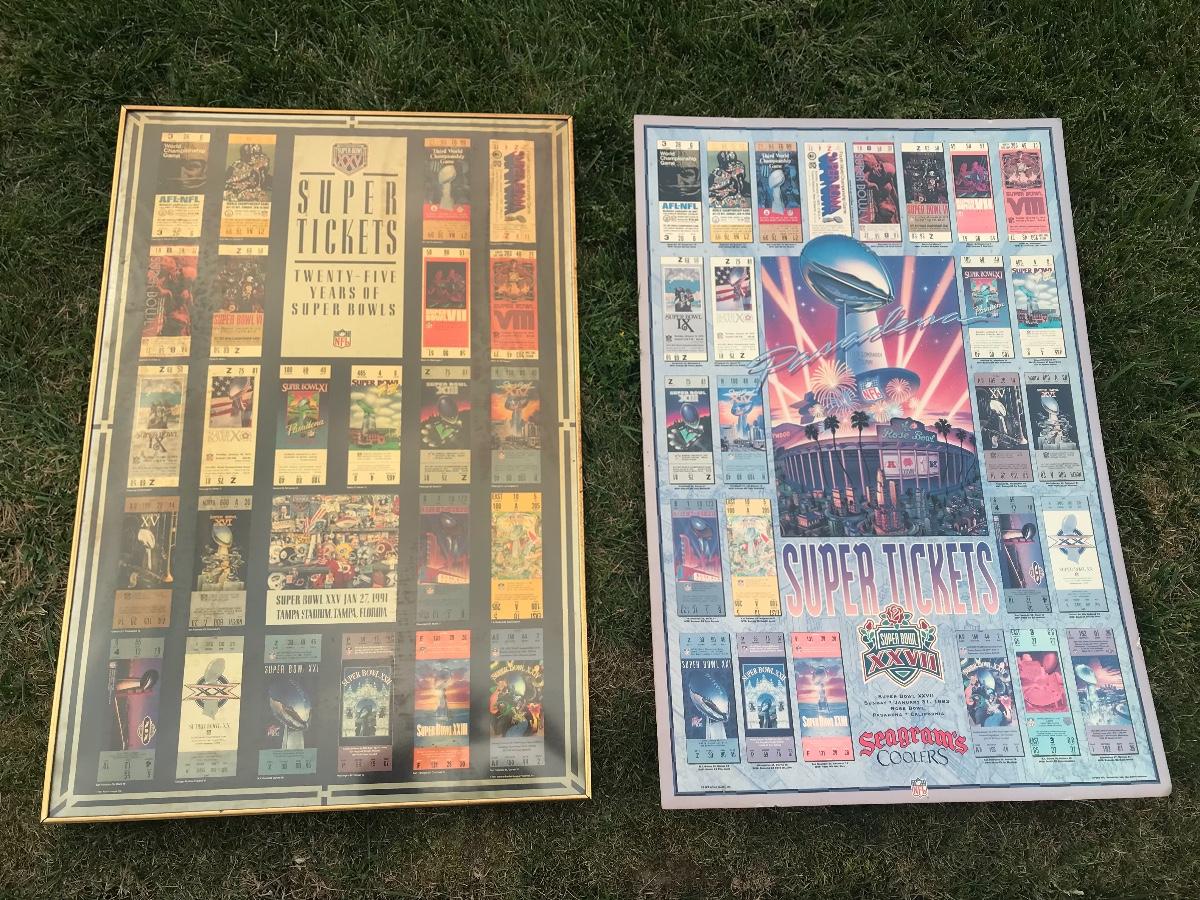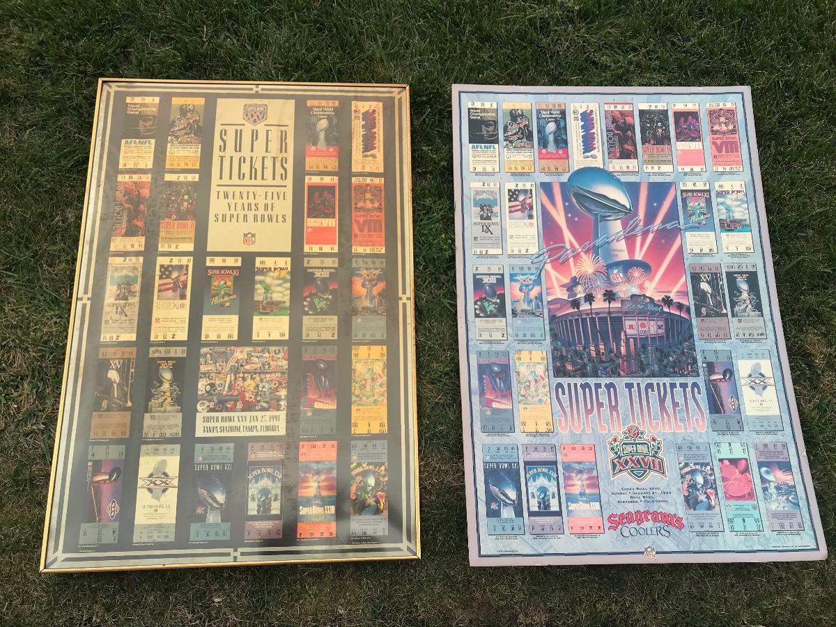 Two Suber Bowl posters from different seasons, featuring the tickets from the games through the years. Both approximately 24 x 36 inches - one framed one not framed. The pictures show condition, measurements if taken, and what is included in the lot. Due to the large amount that we photograph and the time frame, we are not always able to take measurements. All items unless noted, are pre-owned and have been used. If you purchased furniture, you must bring help. We do not allow one person to carry large furniture out on their own. Bring help, tools and a truck for the safety of our client’s homes, and your personal safety. Company policy. Thank you.