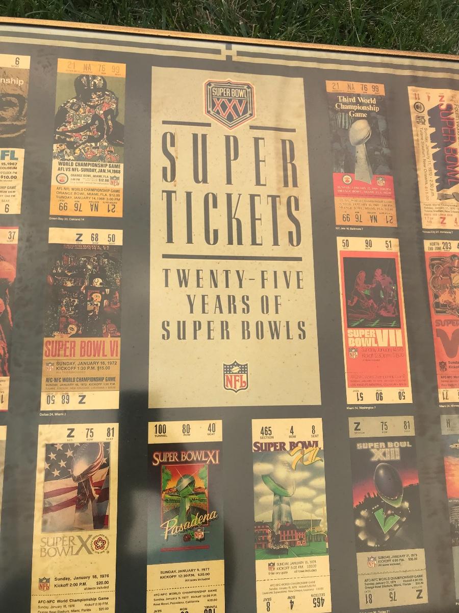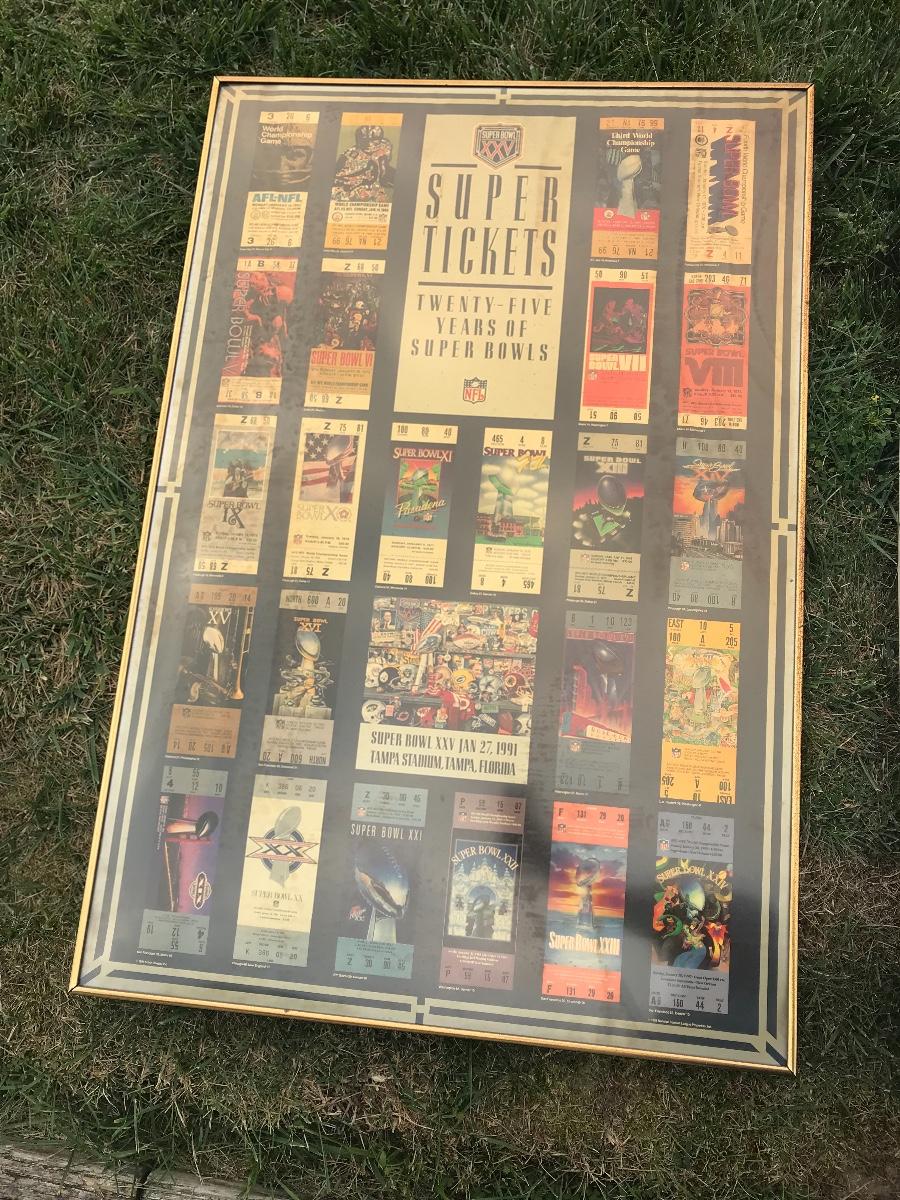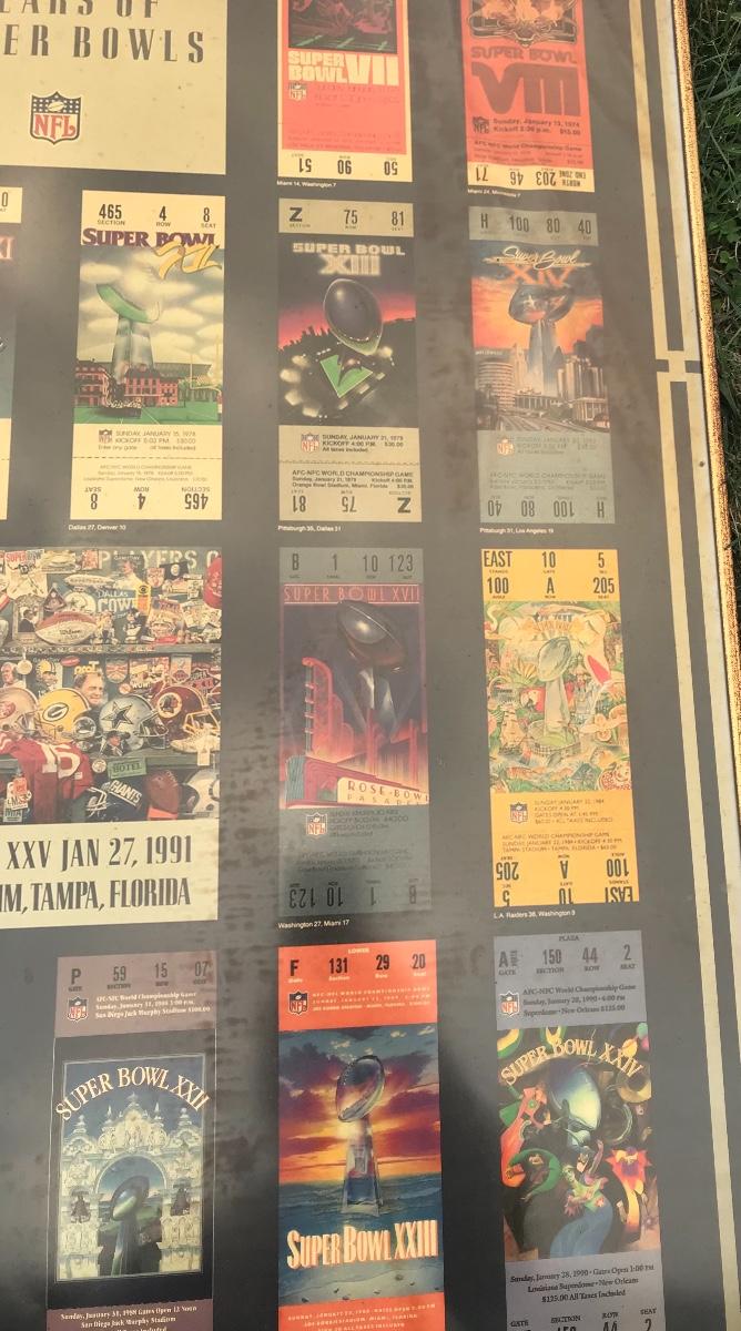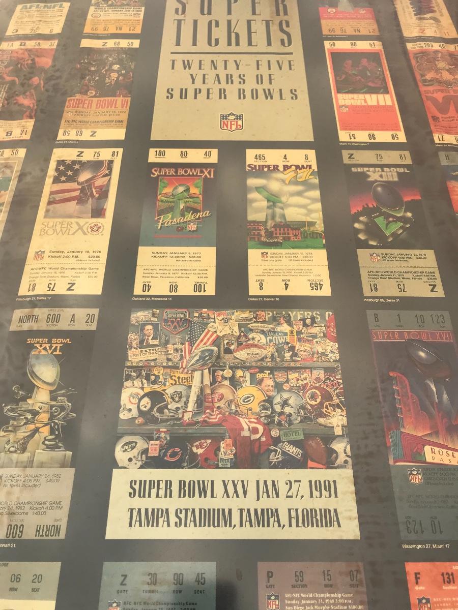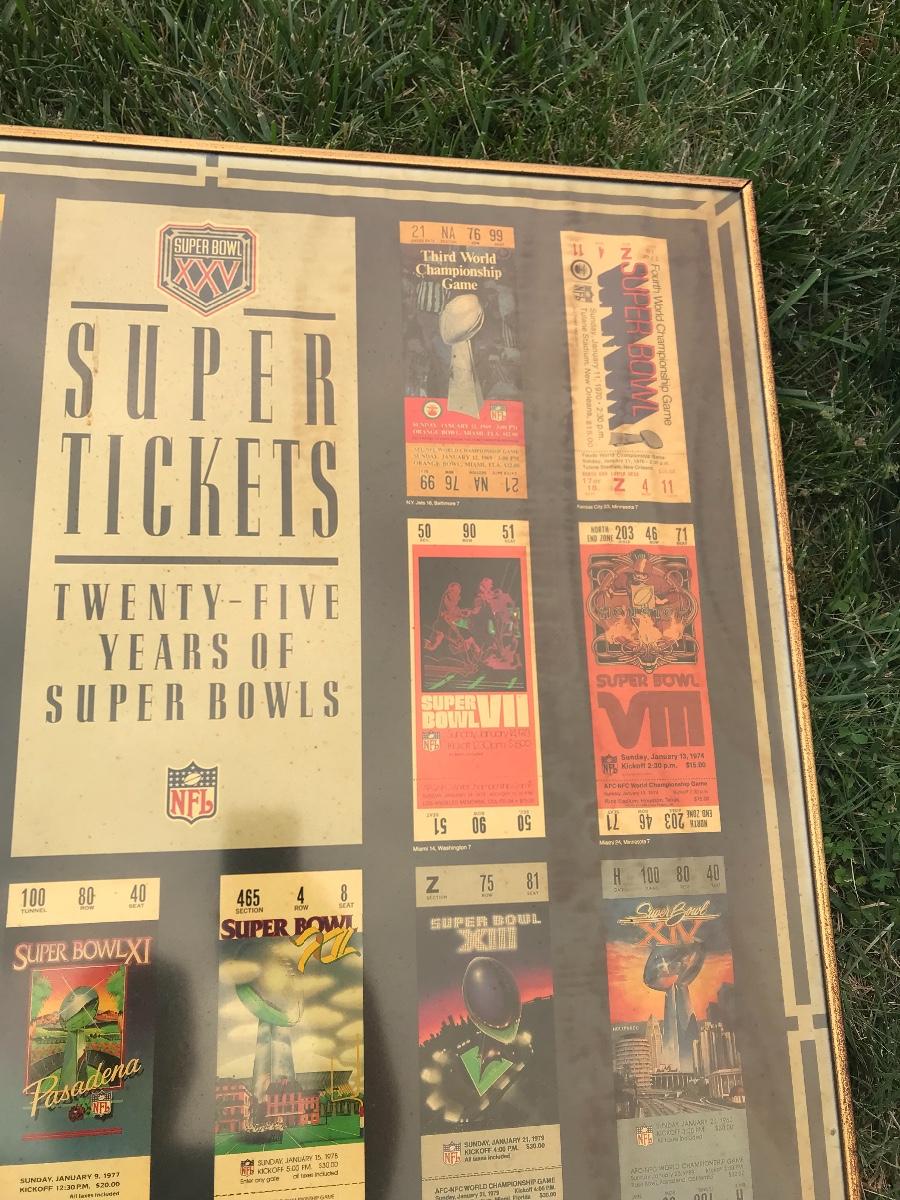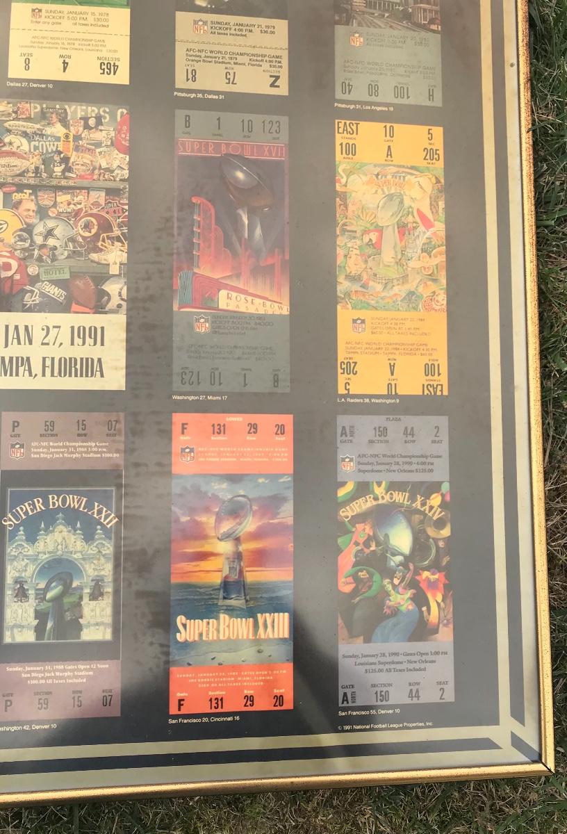Two Suber Bowl posters from different seasons, featuring the tickets from the games through the years. Both approximately 24 x 36 inches - one framed one not framed. The pictures show condition, measurements if taken, and what is included in the lot. Due to the large amount that we photograph and the time frame, we are not always able to take measurements. All items unless noted, are pre-owned and have been used. If you purchased furniture, you must bring help. We do not allow one person to carry large furniture out on their own. Bring help, tools and a truck for the safety of our client’s homes, and your personal safety. Company policy. Thank you.