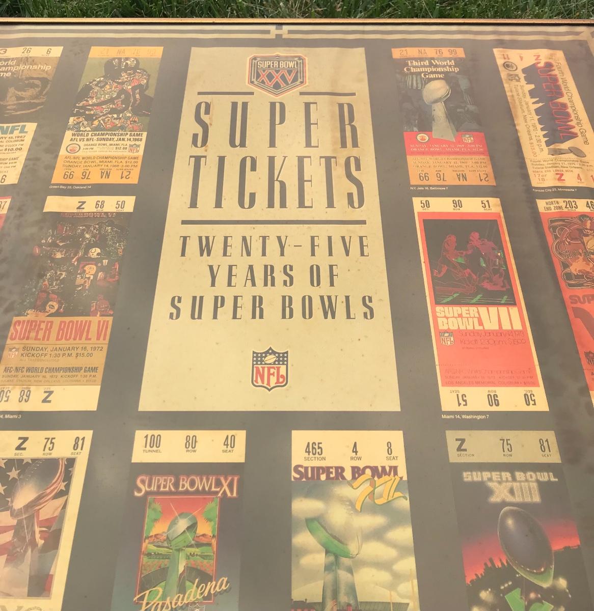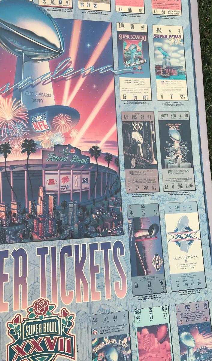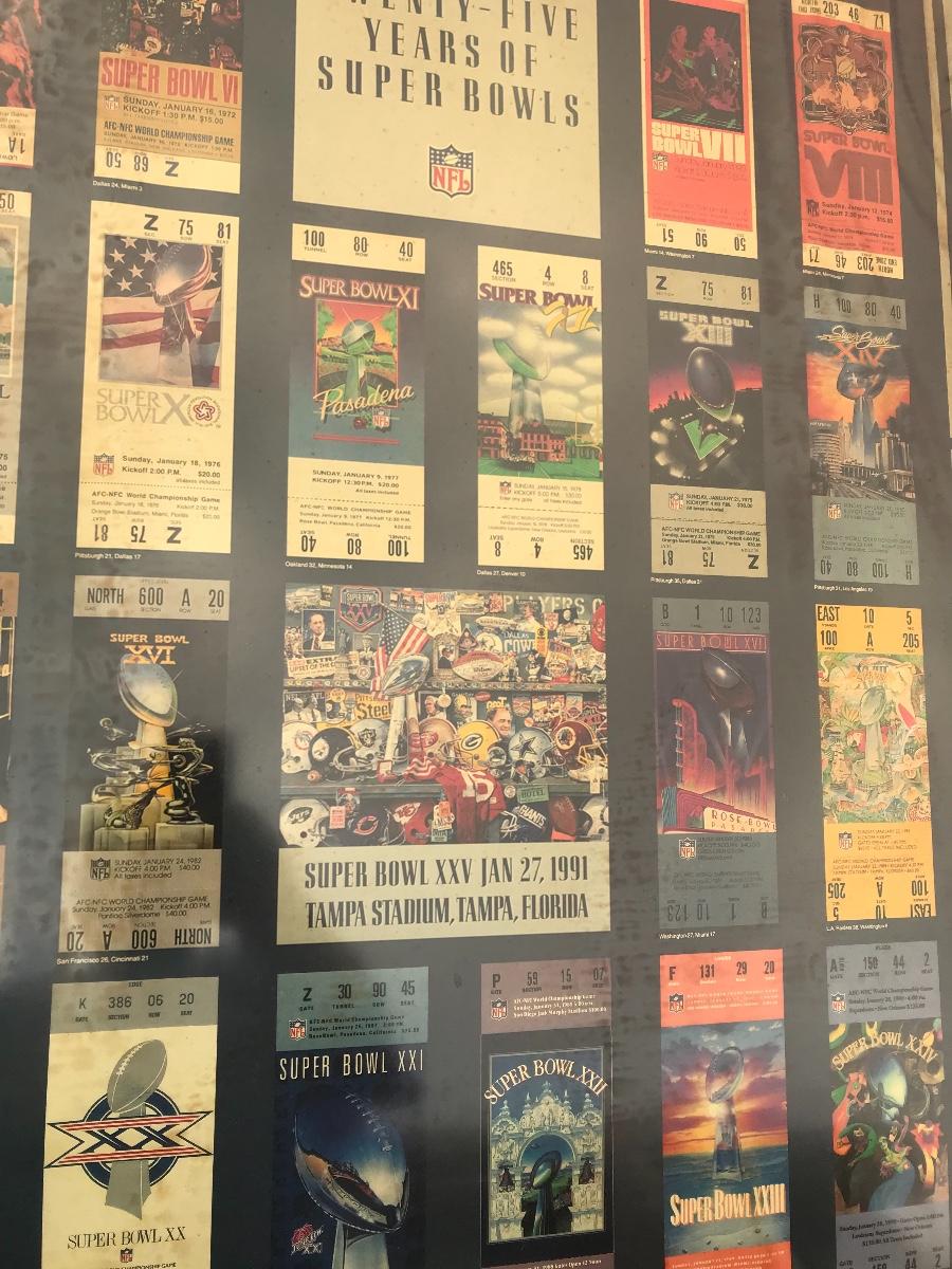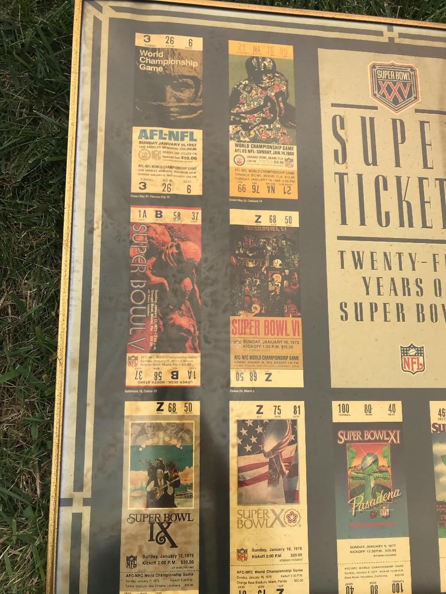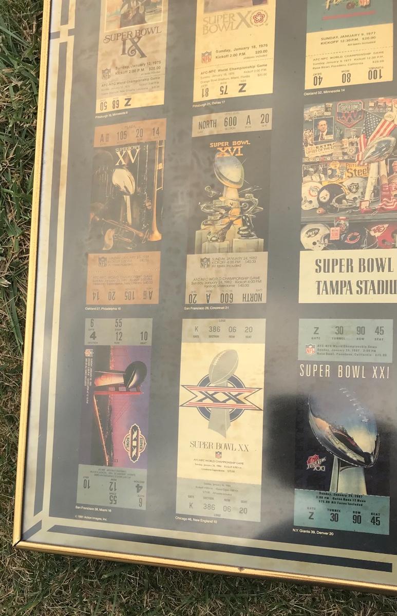 Two Suber Bowl posters from different seasons, featuring the tickets from the games through the years. Both approximately 24 x 36 inches - one framed one not framed. The pictures show condition, measurements if taken, and what is included in the lot. Due to the large amount that we photograph and the time frame, we are not always able to take measurements. All items unless noted, are pre-owned and have been used. If you purchased furniture, you must bring help. We do not allow one person to carry large furniture out on their own. Bring help, tools and a truck for the safety of our client’s homes, and your personal safety. Company policy. Thank you.