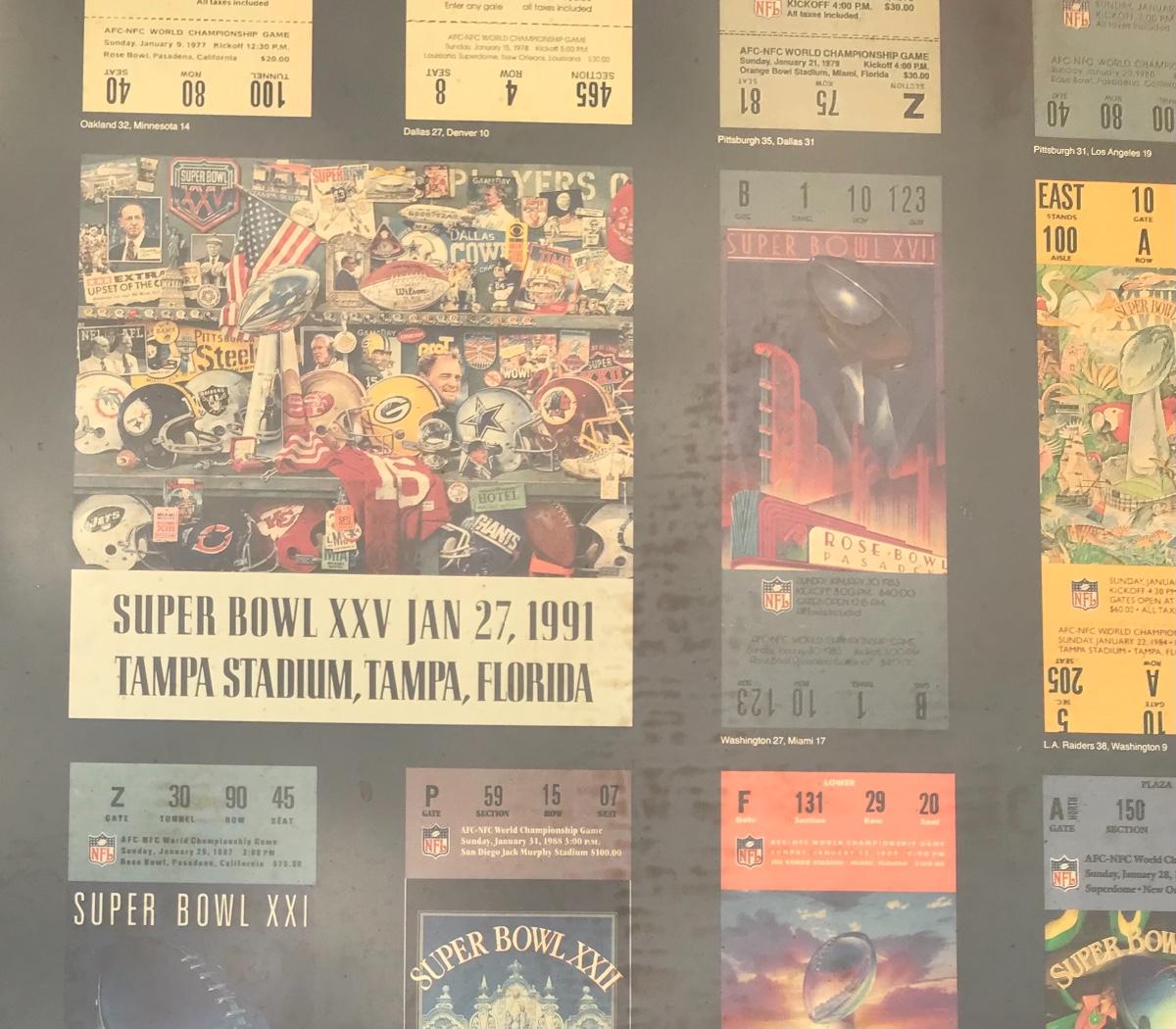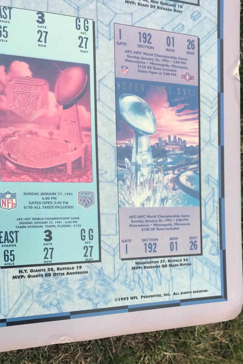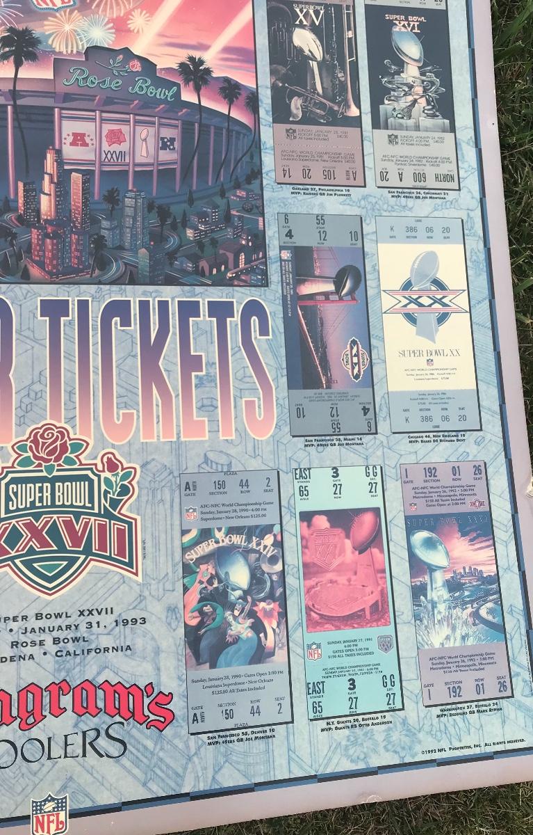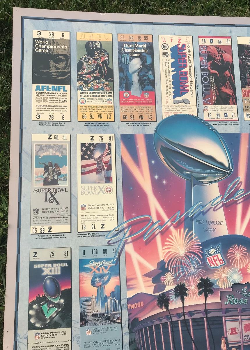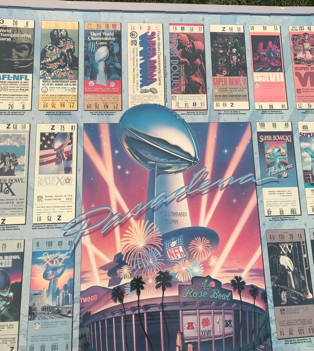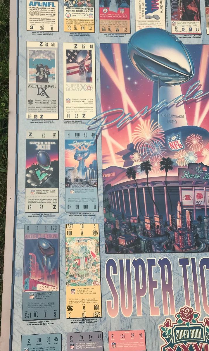 Two Suber Bowl posters from different seasons, featuring the tickets from the games through the years. Both approximately 24 x 36 inches - one framed one not framed. The pictures show condition, measurements if taken, and what is included in the lot. Due to the large amount that we photograph and the time frame, we are not always able to take measurements. All items unless noted, are pre-owned and have been used. If you purchased furniture, you must bring help. We do not allow one person to carry large furniture out on their own. Bring help, tools and a truck for the safety of our client’s homes, and your personal safety. Company policy. Thank you.