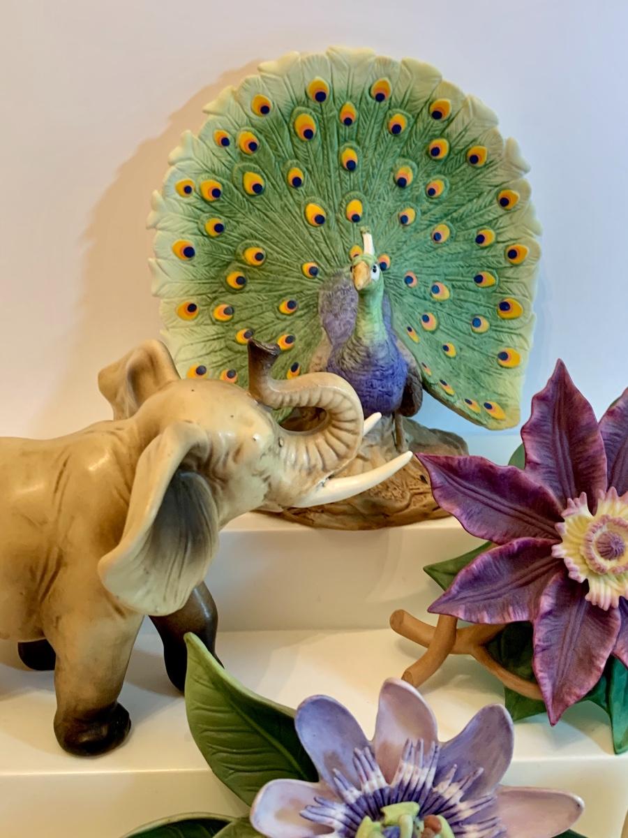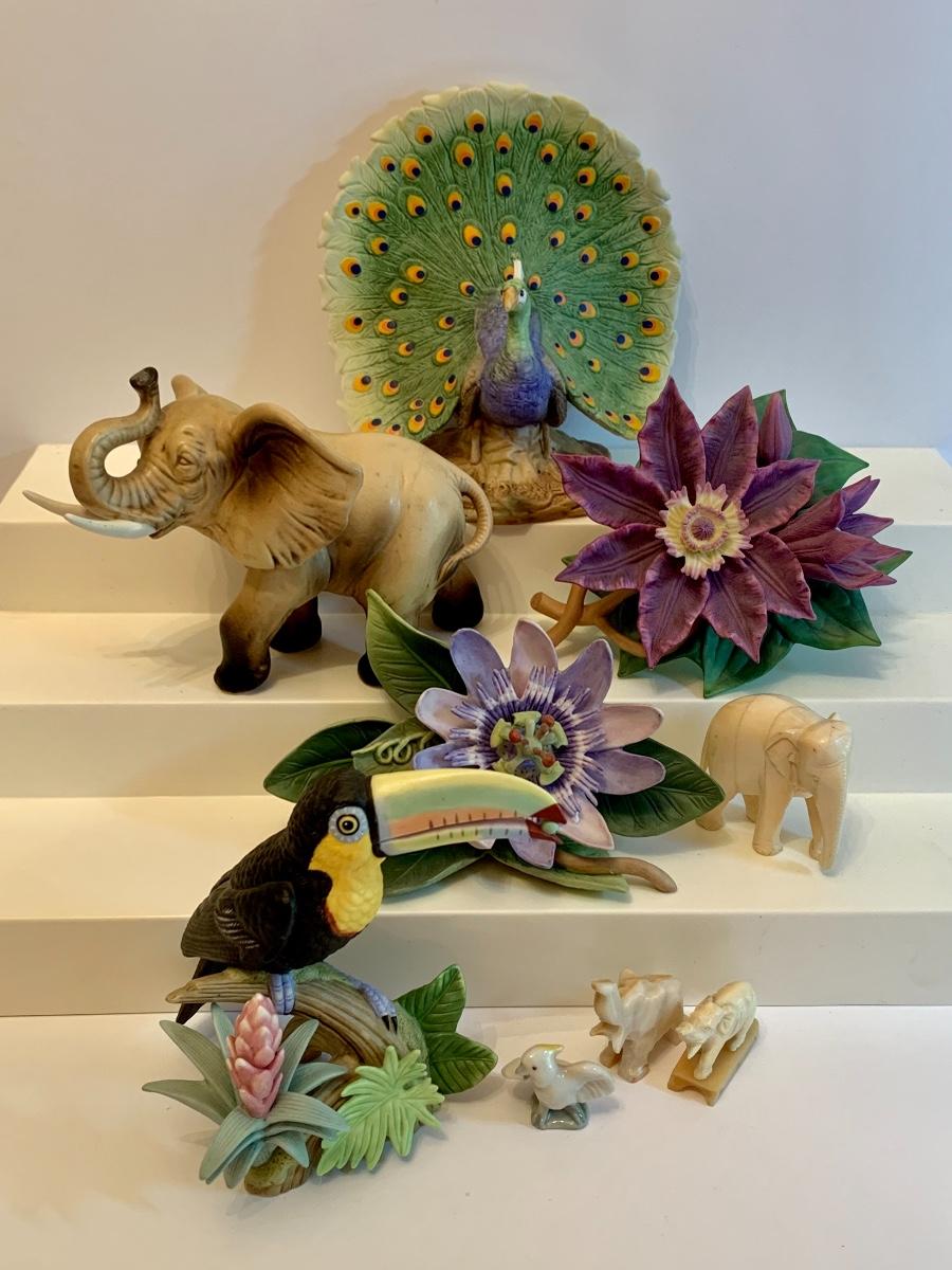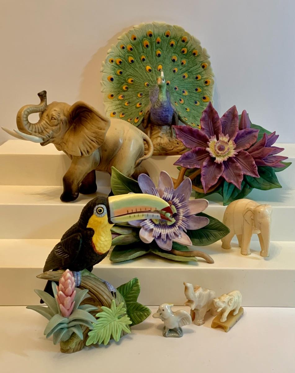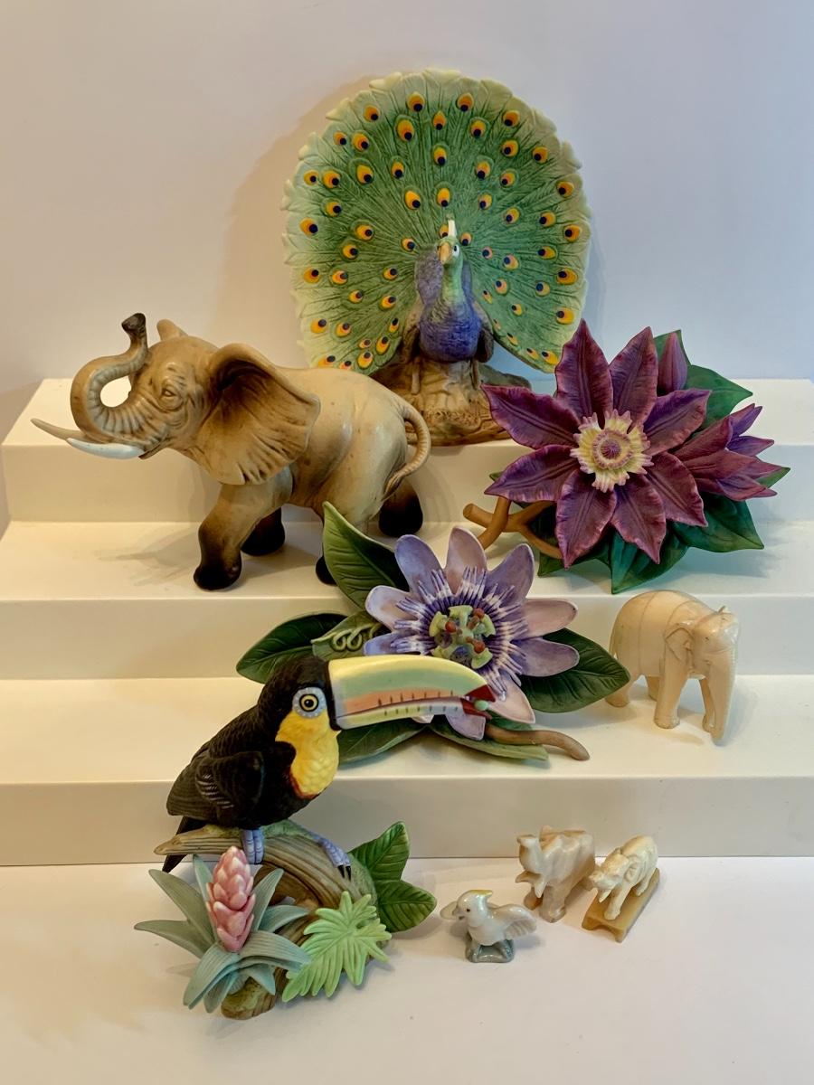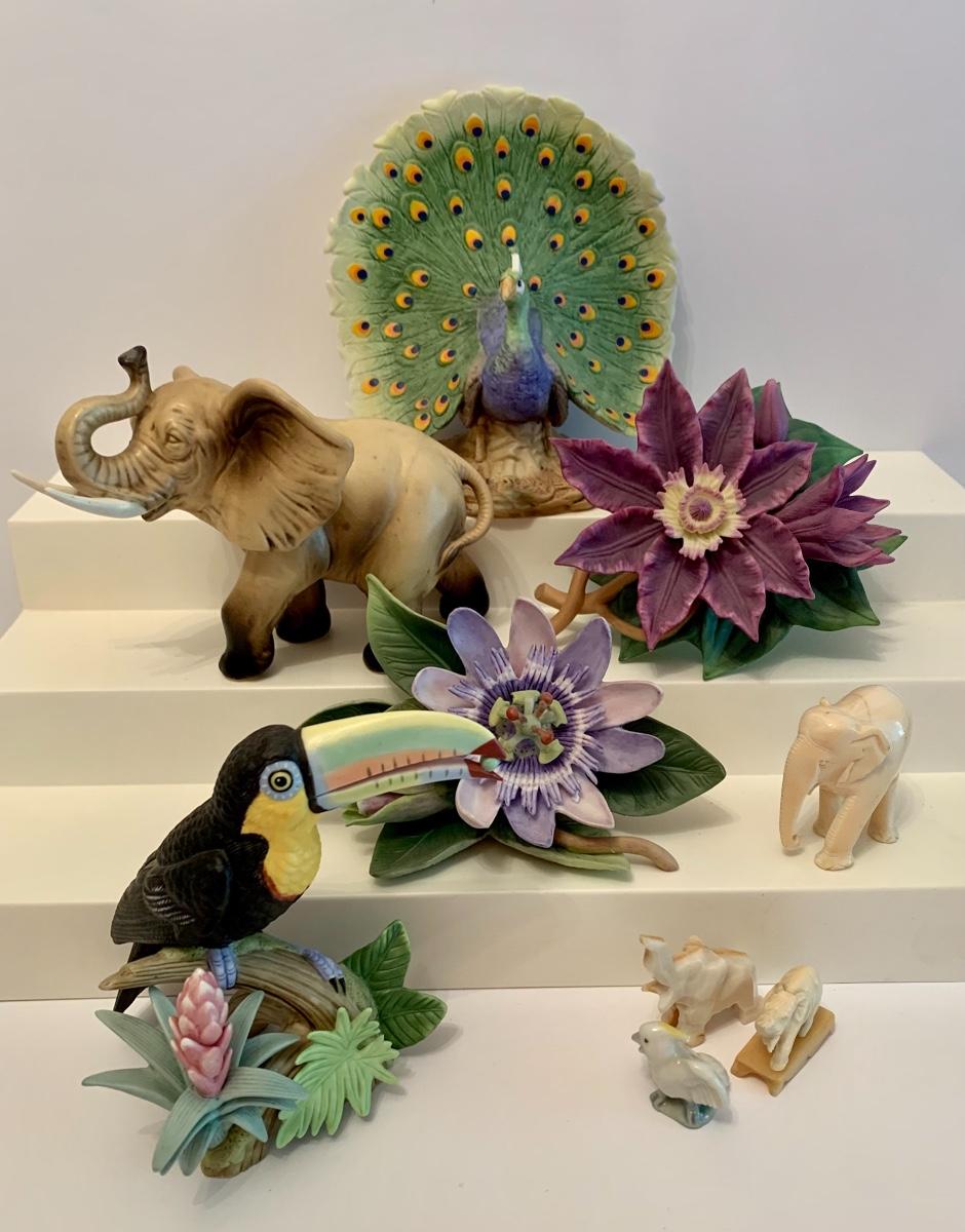 Beautifully detailed Lefton peacock in this collection of flowers and wildlife. Included are carved miniature elephants, marble and/or bone, Lefton elephant with flaws (as pictured). Lenox flowers and Toucan.