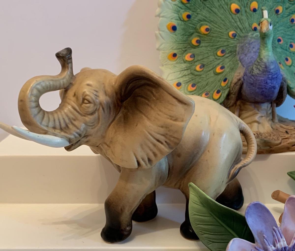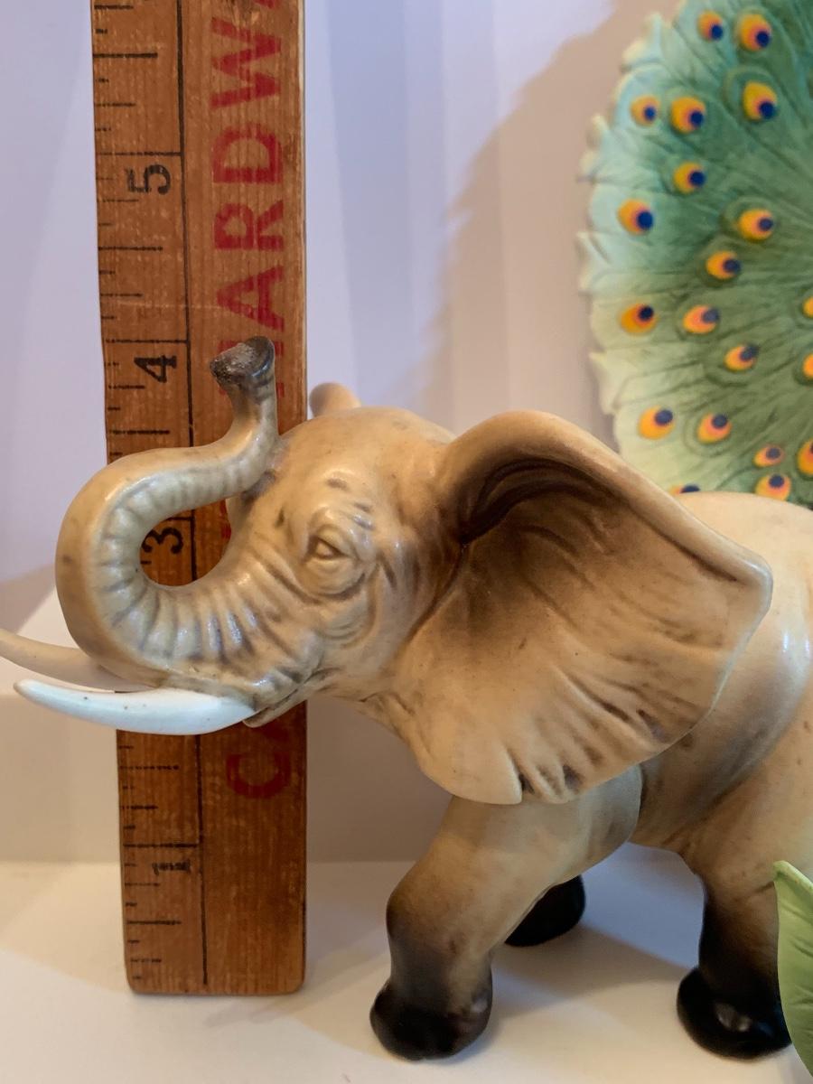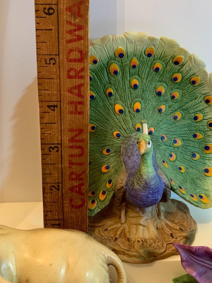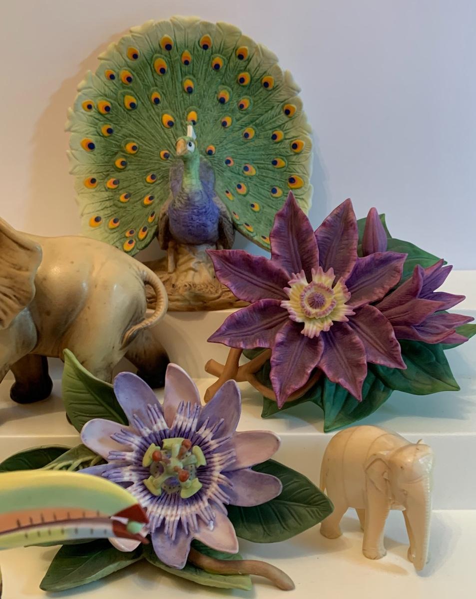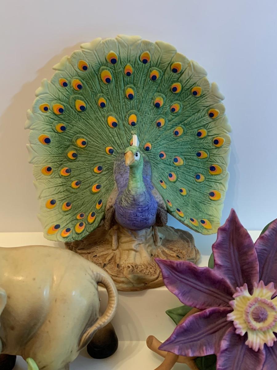 Beautifully detailed Lefton peacock in this collection of flowers and wildlife. Included are carved miniature elephants, marble and/or bone, Lefton elephant with flaws (as pictured). Lenox flowers and Toucan.