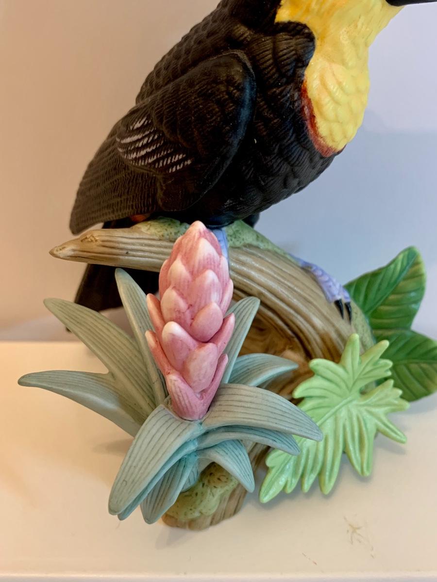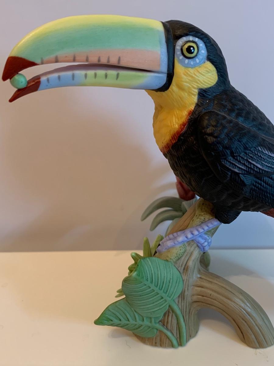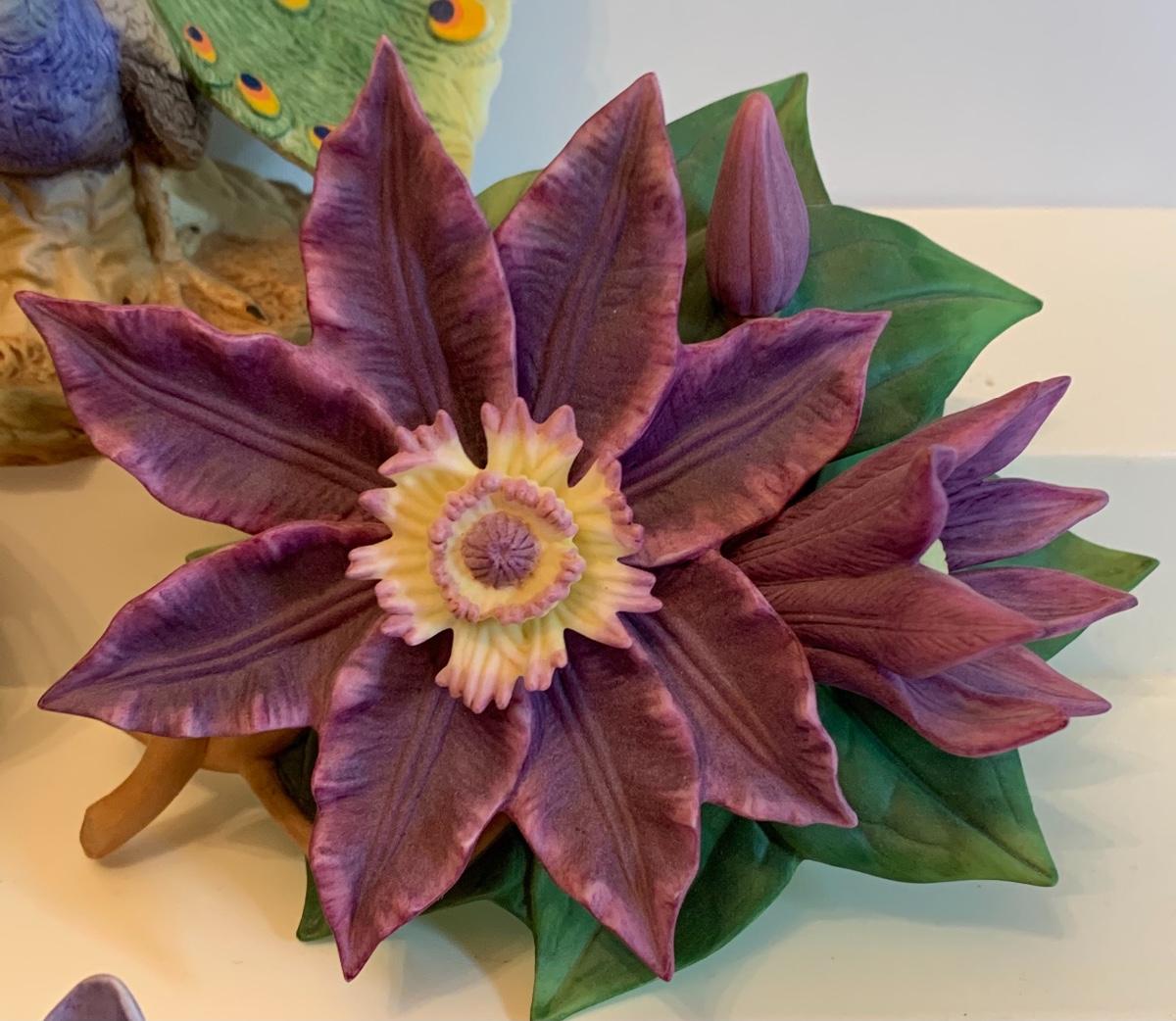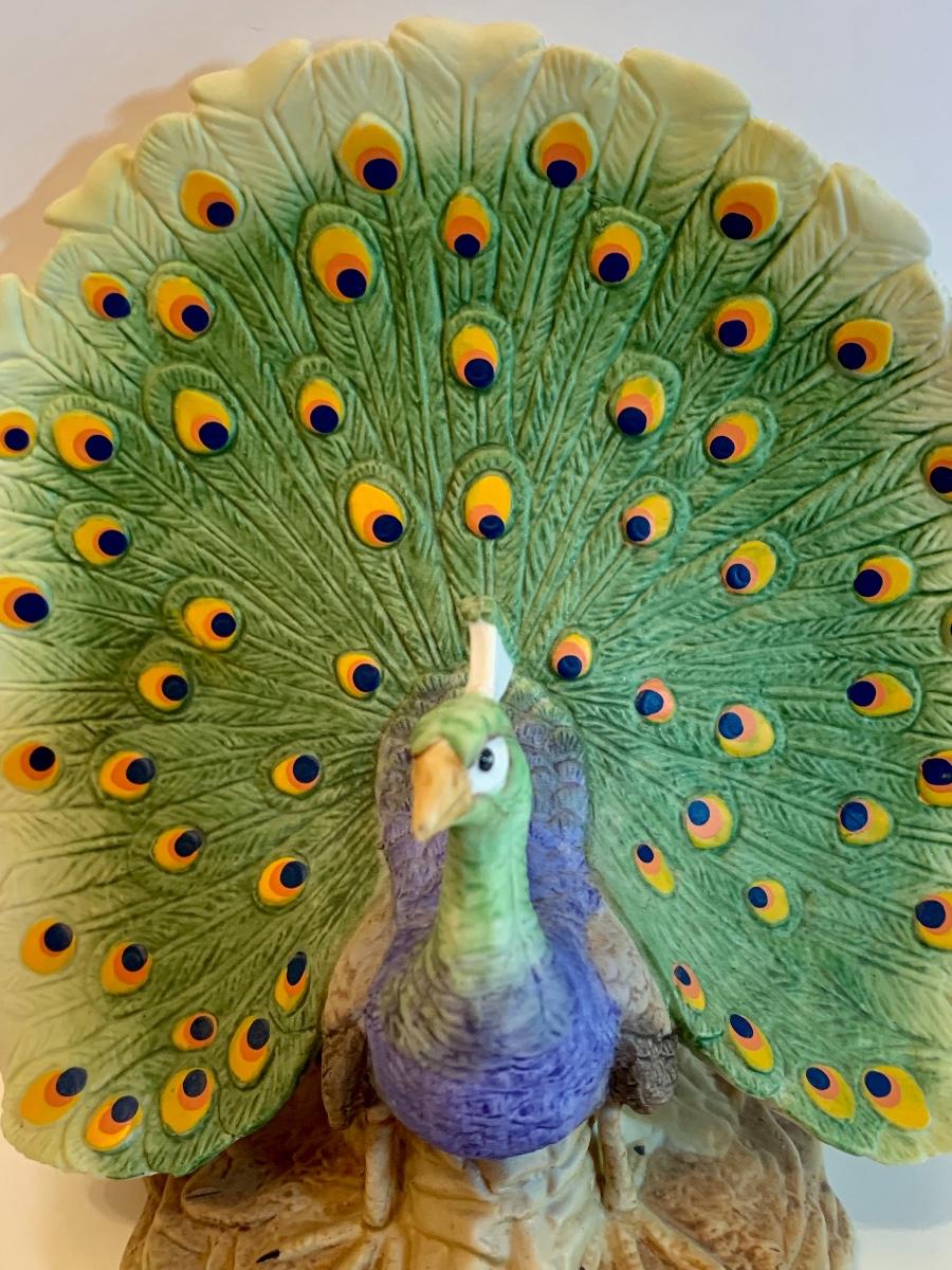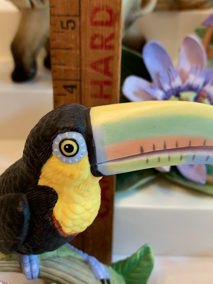 Beautifully detailed Lefton peacock in this collection of flowers and wildlife. Included are carved miniature elephants, marble and/or bone, Lefton elephant with flaws (as pictured). Lenox flowers and Toucan.