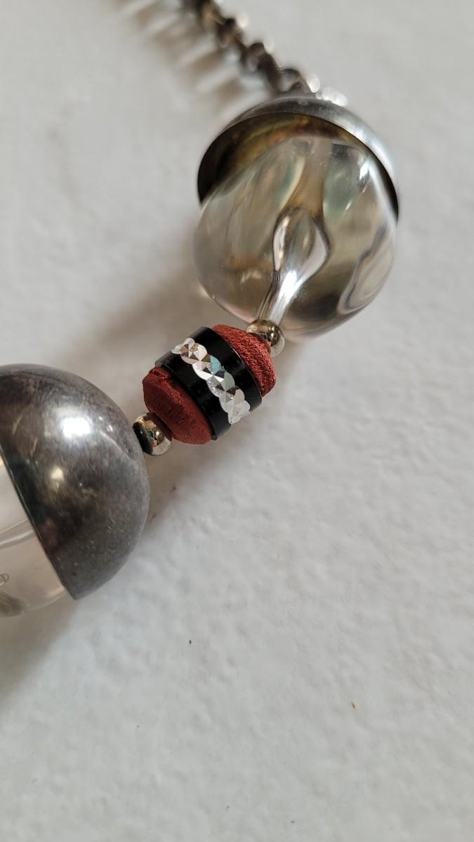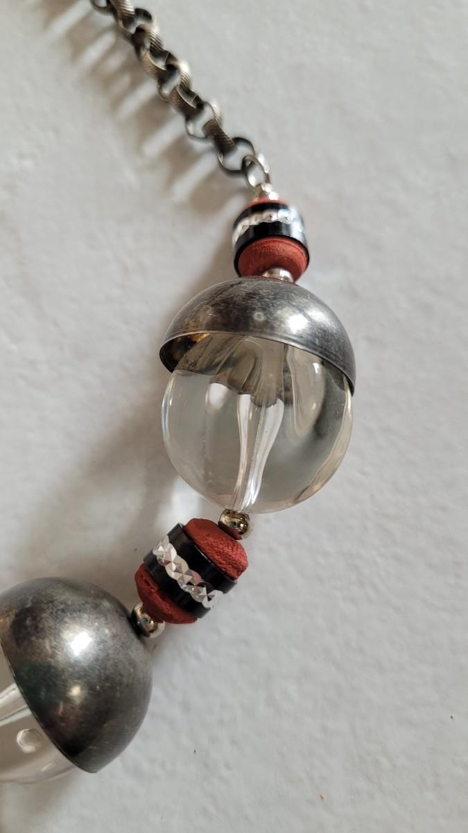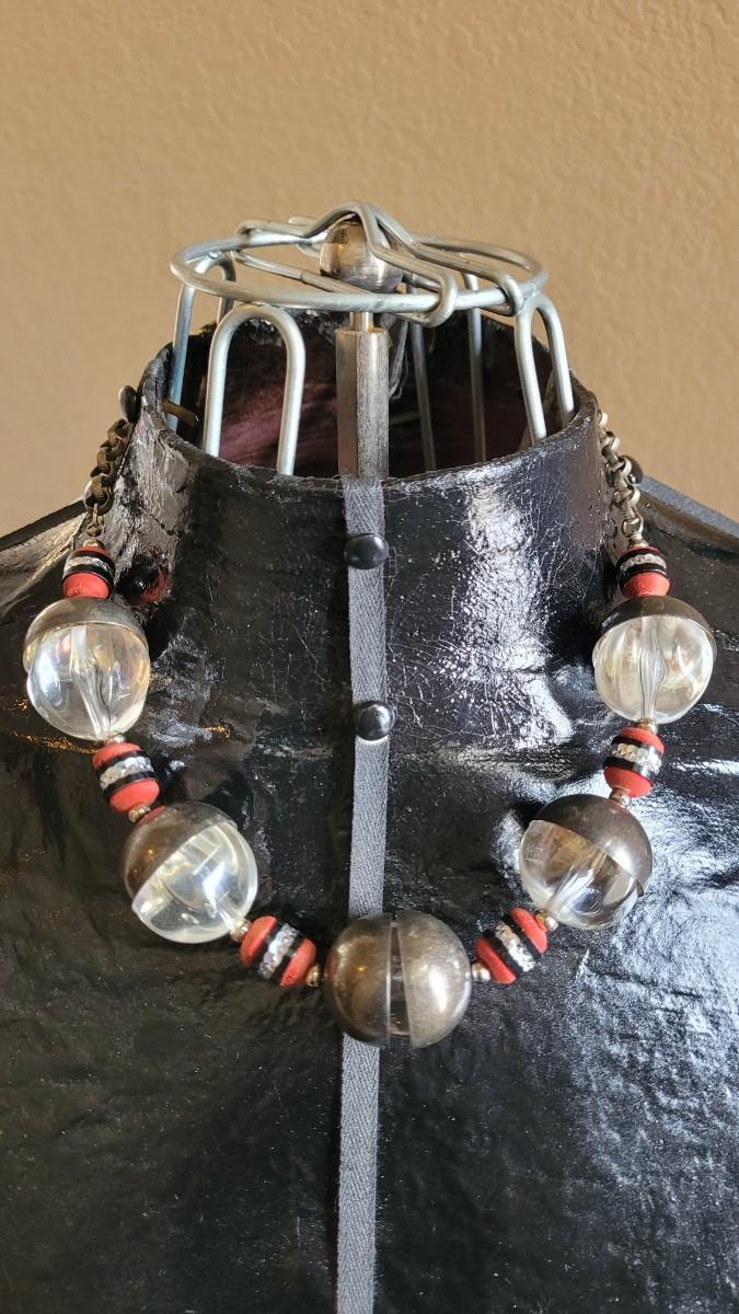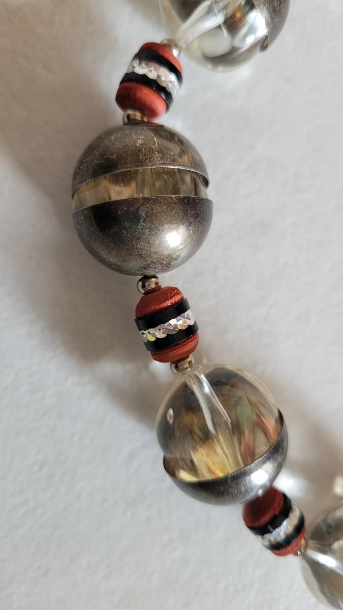 Plastic clear beads capped with a Metal bead. The red beads have a shiny silver design on them and add a intriguing flare to the necklace.