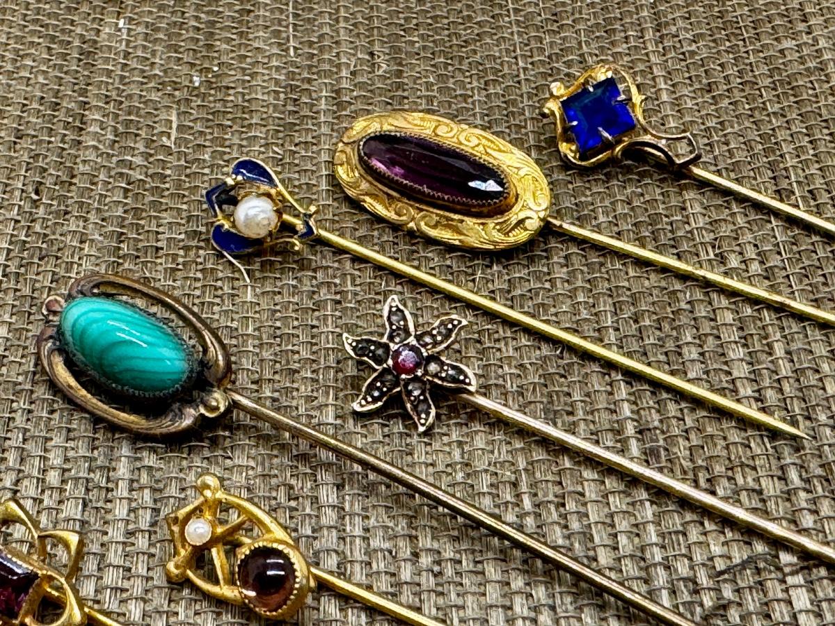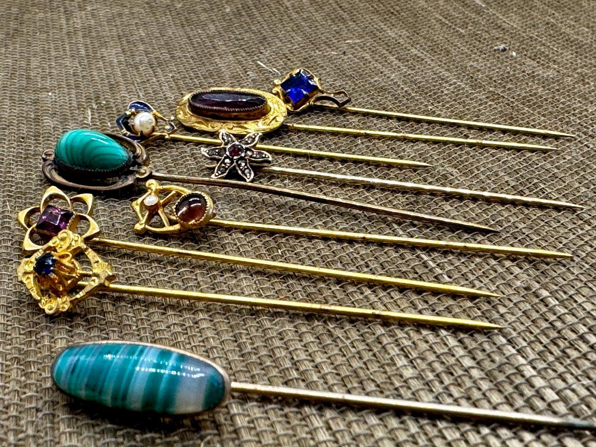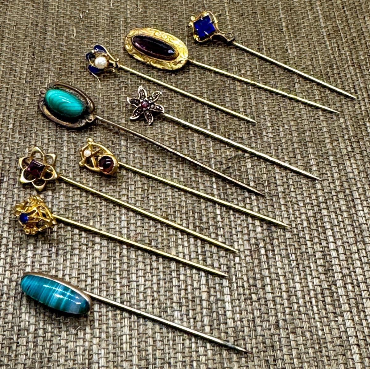 LOT 15 - 9 Antique Victorian Stick Pins. Various measurements. Overall good condition.