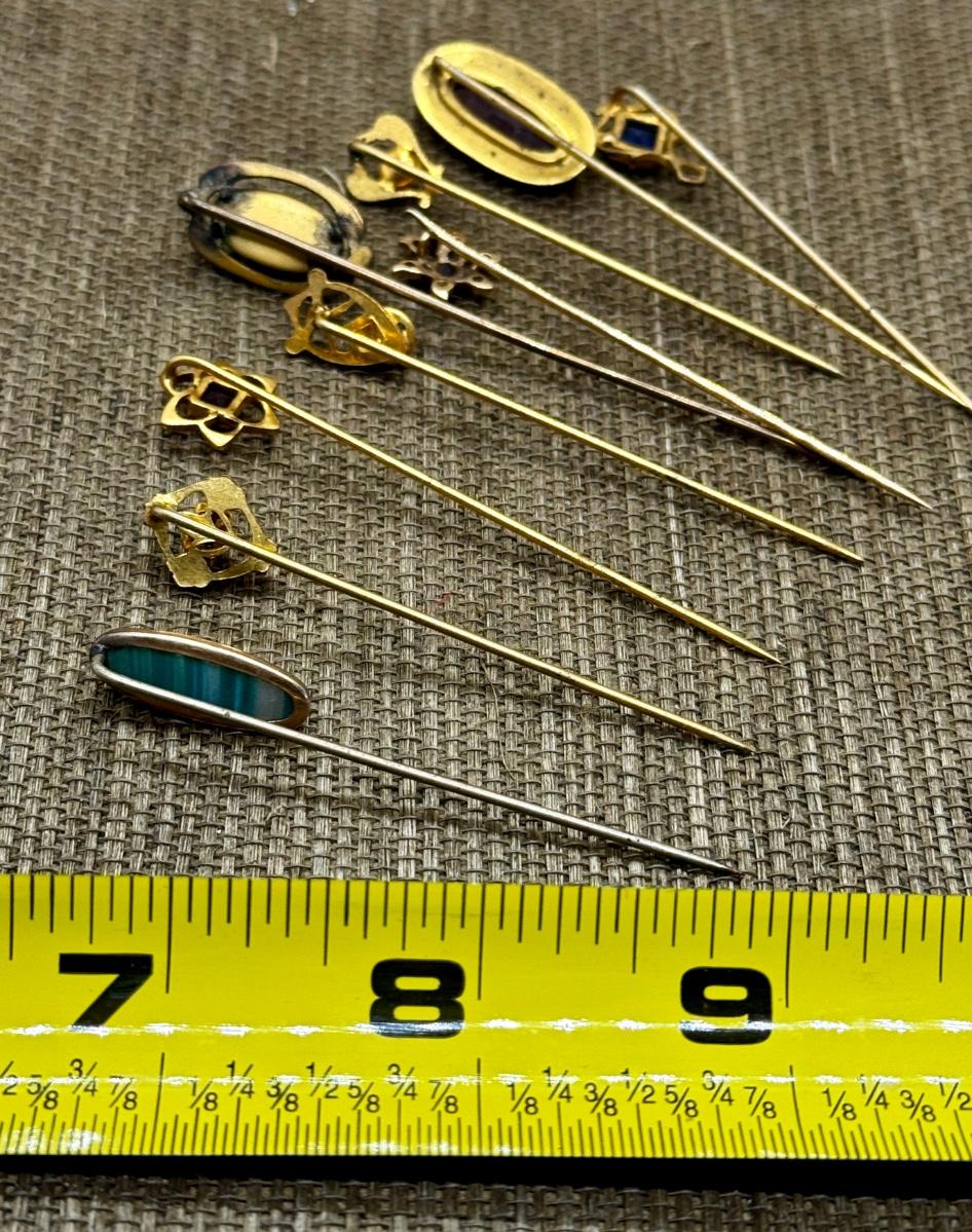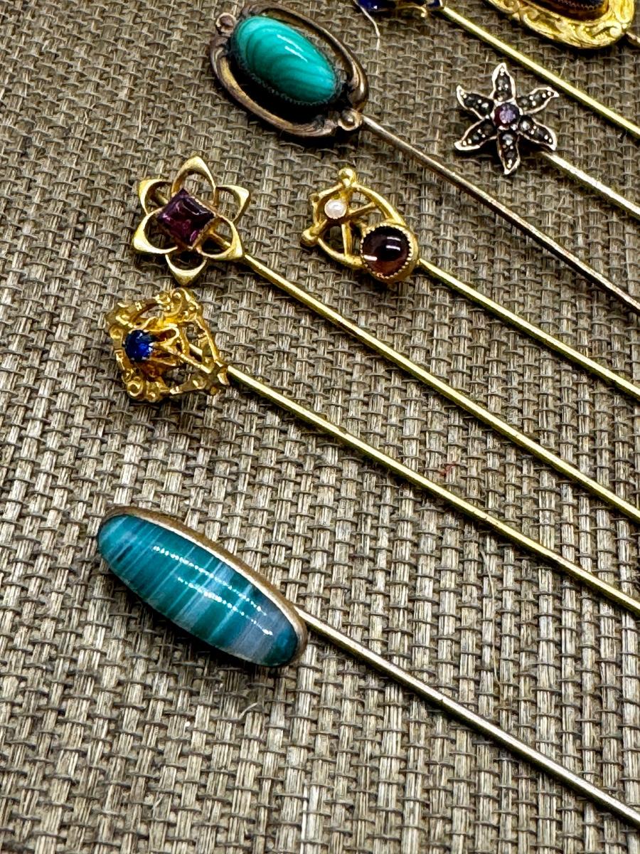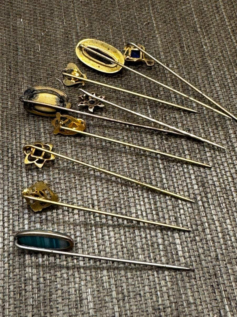 LOT 15 - 9 Antique Victorian Stick Pins. Various measurements. Overall good condition.