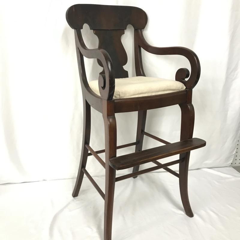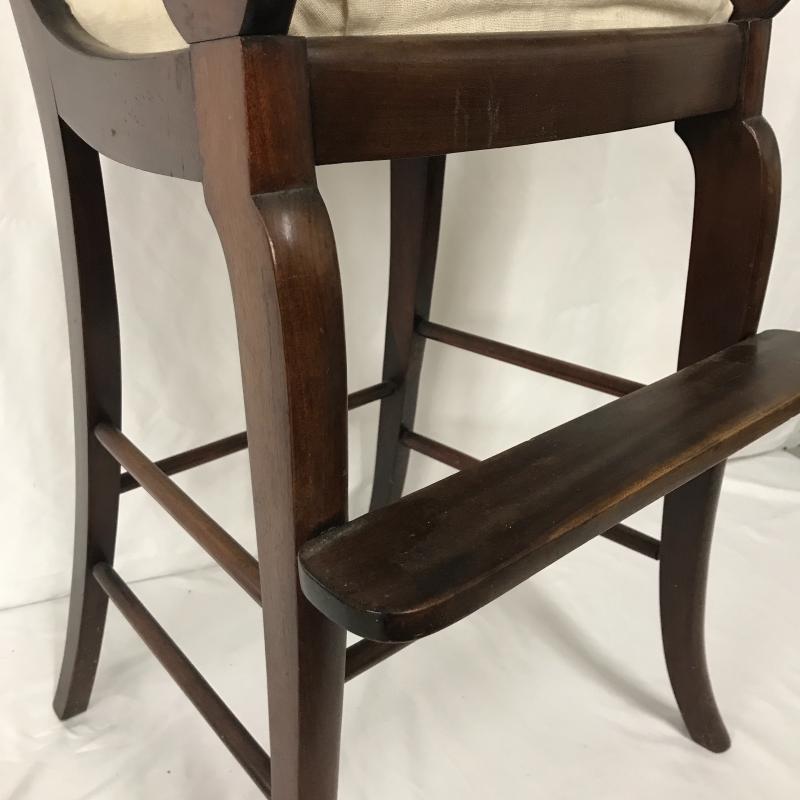 Let your child (or grandchild) eat in style in this beautiful solid wood high chair. Seat has been recovered. This chair is sturdy with minor wear. 16” x 17” x 35”h. Local Pick up only in Maggie Valley, NC.
