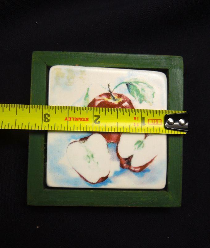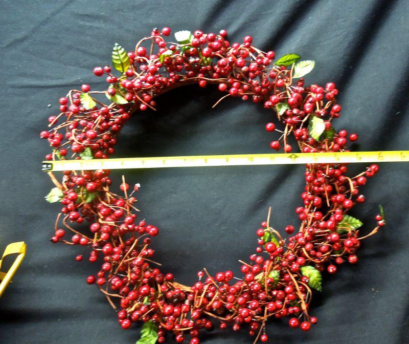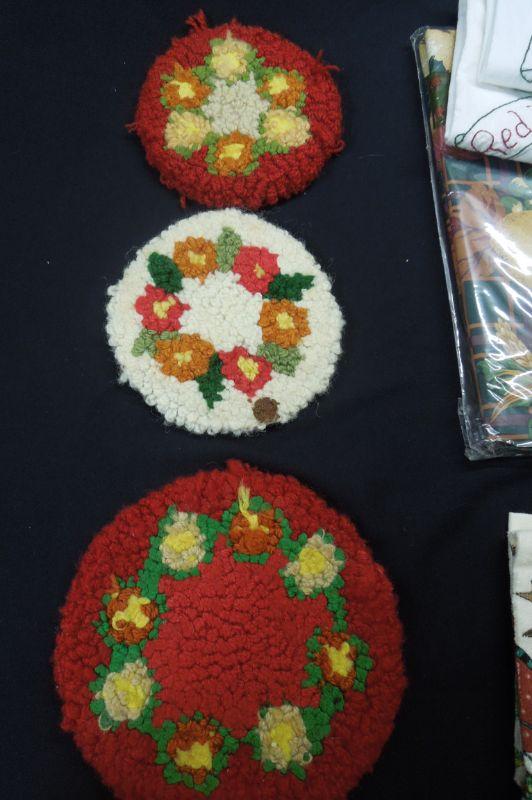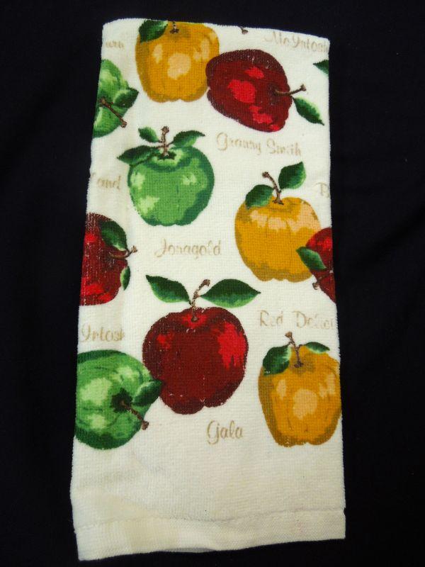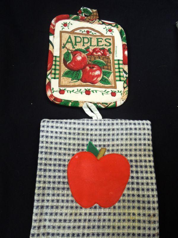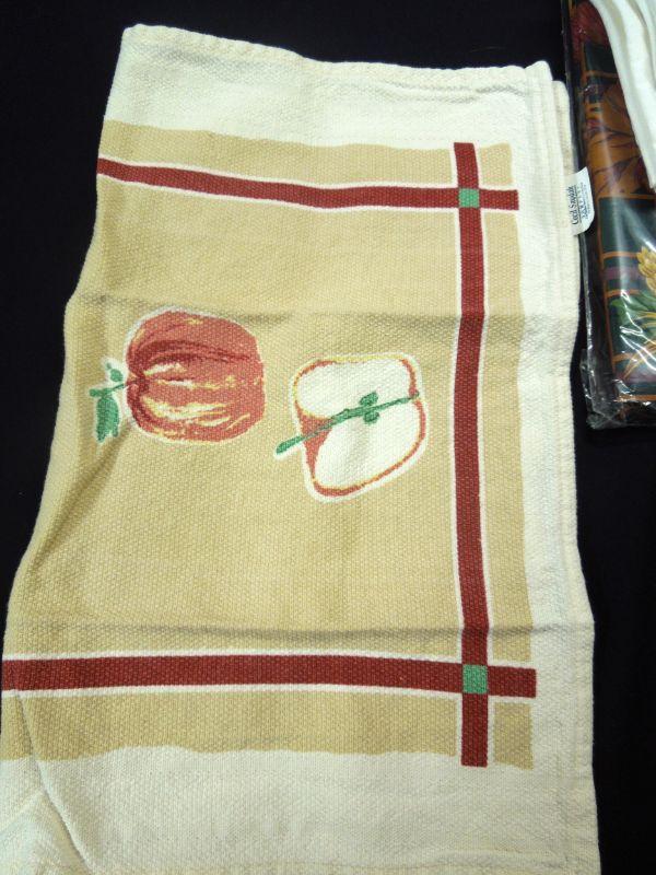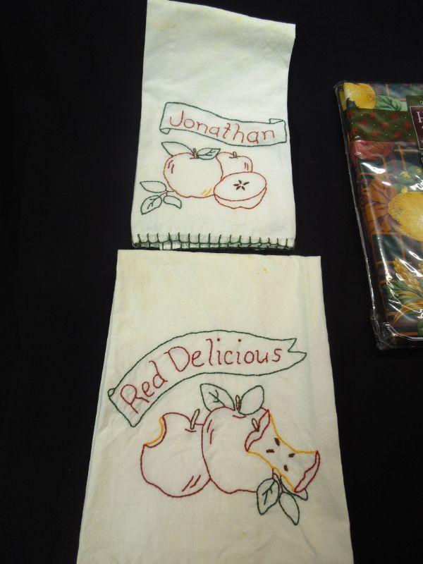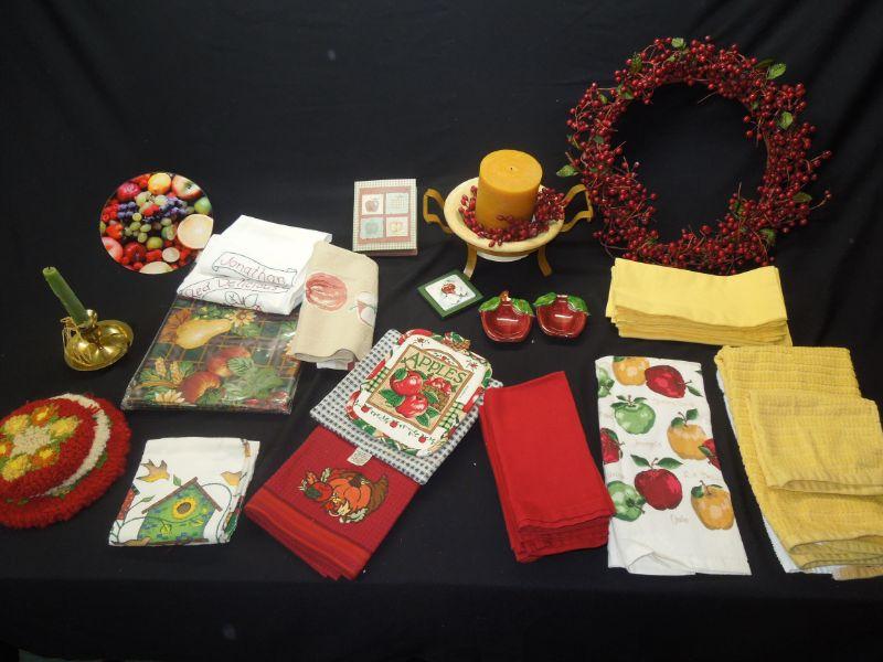 Five dish towels, two tea towels; three round hooked pads; two pot holders; oblong vinyl flannel backed table cloth unopened; six red and 5 yellow cloth napkins; two ceramic spoon stands (one chipped); an apple magnet; boxed memo notes; one brass candle holder with taper candle; one yellow candle with stand and cranberry garland; one red berry wreath.Colorful round fruit trivet in upper left corner is made of glass.