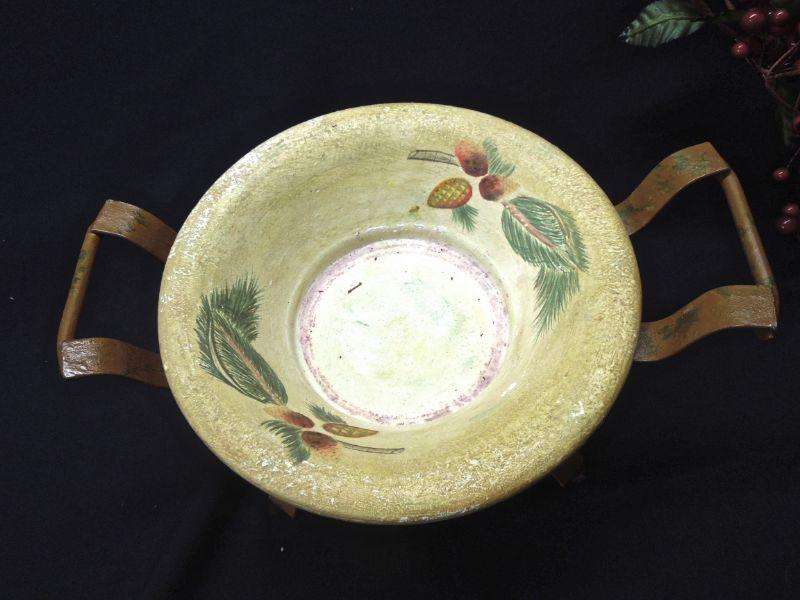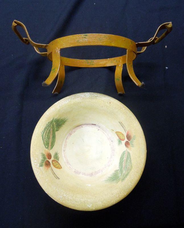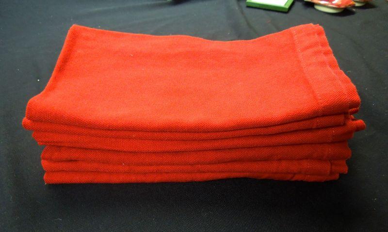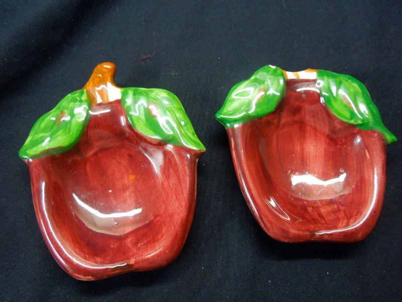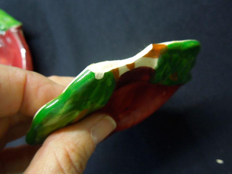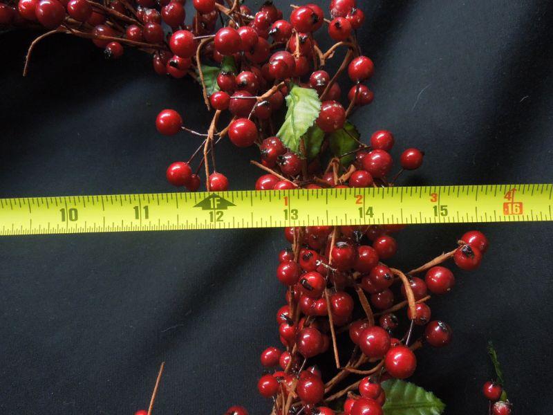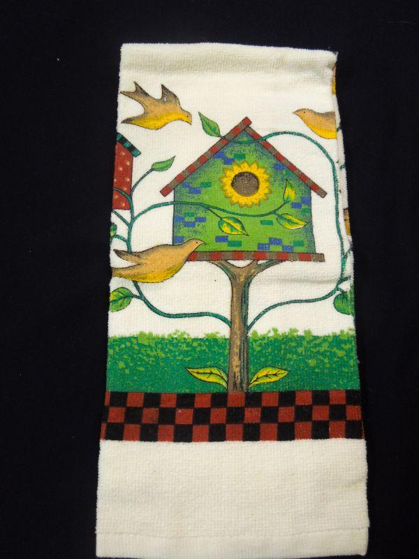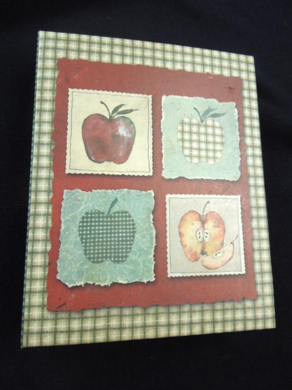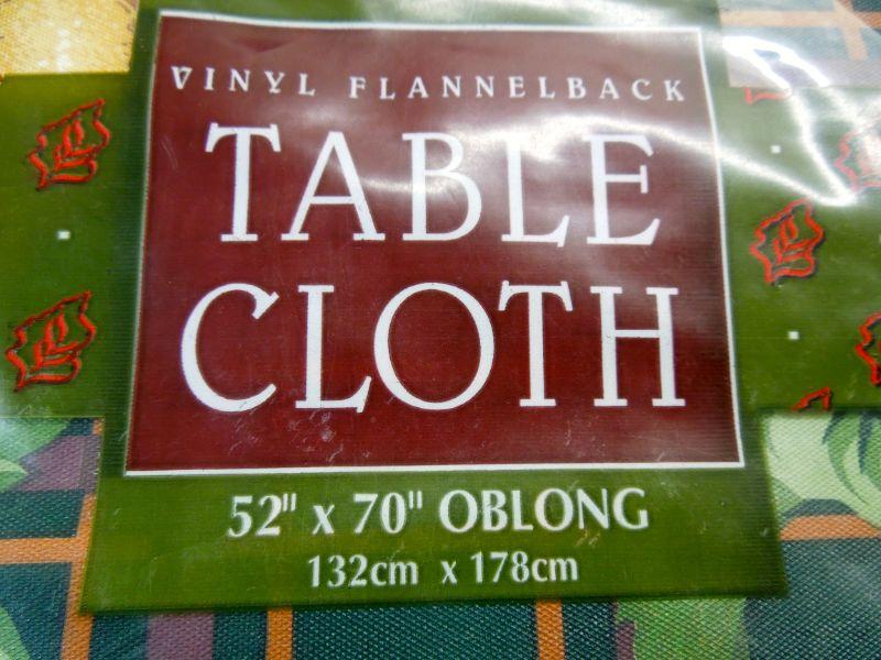 Five dish towels, two tea towels; three round hooked pads; two pot holders; oblong vinyl flannel backed table cloth unopened; six red and 5 yellow cloth napkins; two ceramic spoon stands (one chipped); an apple magnet; boxed memo notes; one brass candle holder with taper candle; one yellow candle with stand and cranberry garland; one red berry wreath.Colorful round fruit trivet in upper left corner is made of glass.