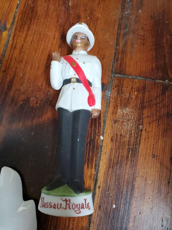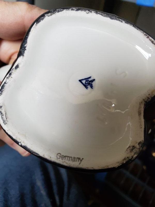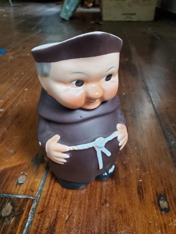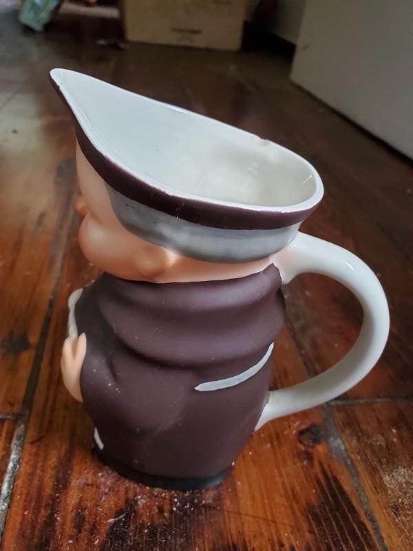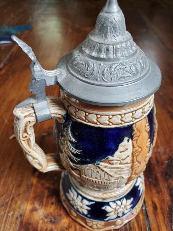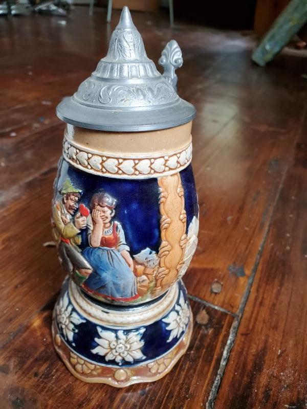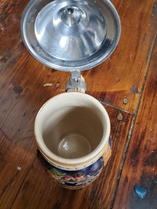 Stein from Switzerland is 8 inches tall and is a music box that works. The monk has a small chip on rim, a leaf from East Germany, a soldier from Bahamas, and a horn mug holder from Italy.