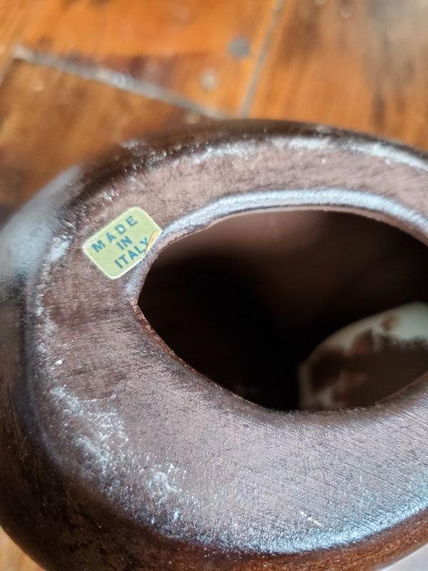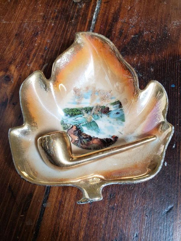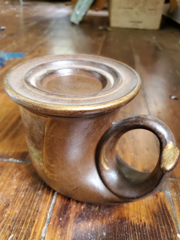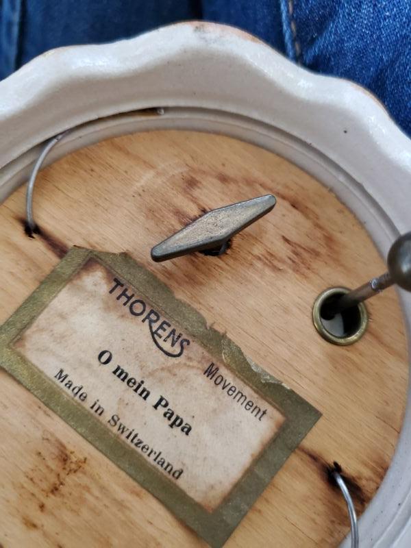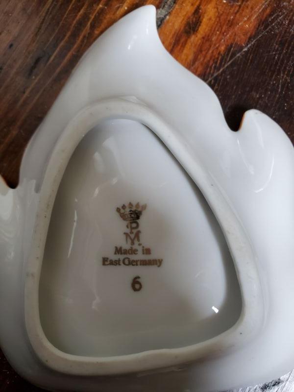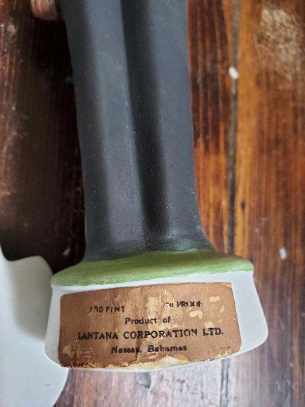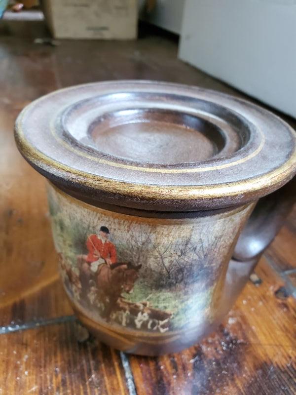 Stein from Switzerland is 8 inches tall and is a music box that works. The monk has a small chip on rim, a leaf from East Germany, a soldier from Bahamas, and a horn mug holder from Italy.