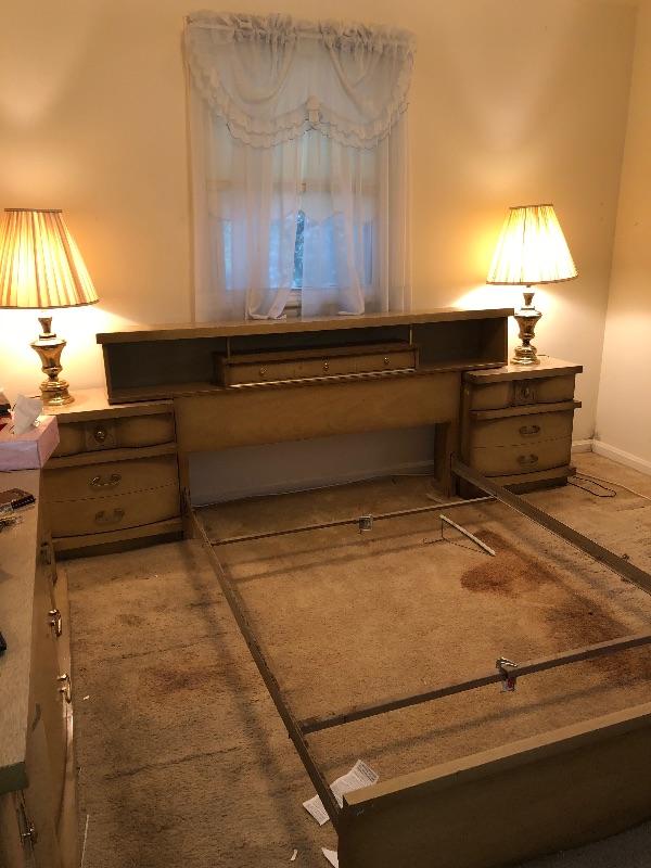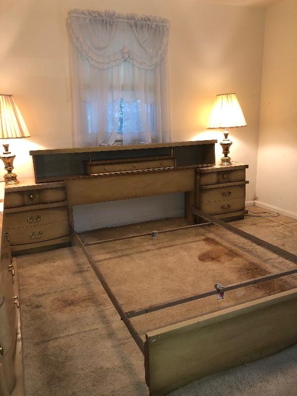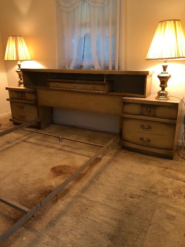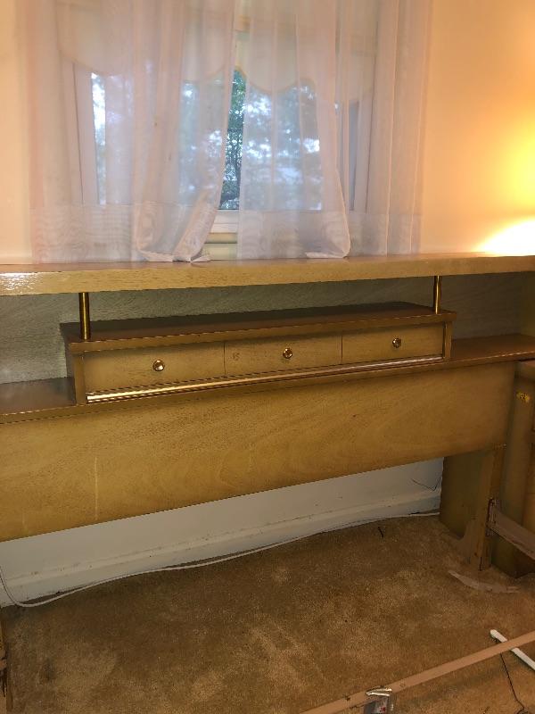 Bassett Full Size Beds with Center Drawer on Headboard and Two Matching Bassett End Tables. End Tables can be used separately. 104" Long
