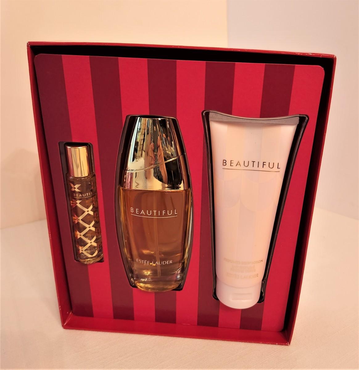 Estee Lauder "Beautiful" gift set - In original box, you get all you see here - Body Lotion, Perfume, and Travel Spray - never used. Full sizes, not samples.