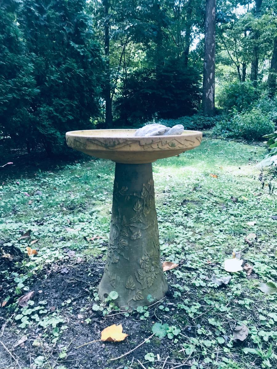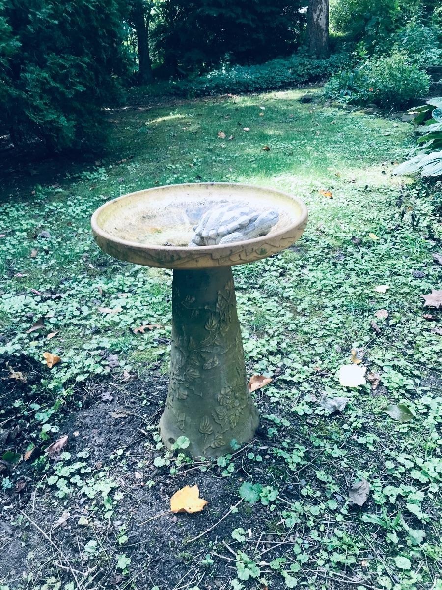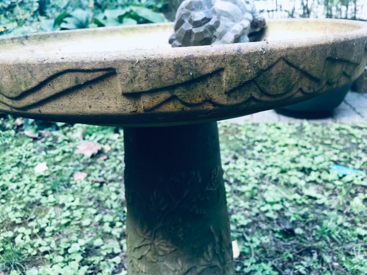 Birdbath with flower and leaf design, not cement, more like a heavy terra cotta, and a cement turtle. Please see all pictures as they are the best representation of the items. The pictures show condition, measurements if taken, and what is included in the lot. Due to the large amount that we photograph and the time frame, we are not always able to take measurements. All items unless noted, are pre-owned and have been used. If you purchased furniture, you must bring help. We do not allow one person to carry large furniture out on their own. Bring help, tools and a truck for the safety of our client’s homes, and your personal safety. Company policy. Thank you.