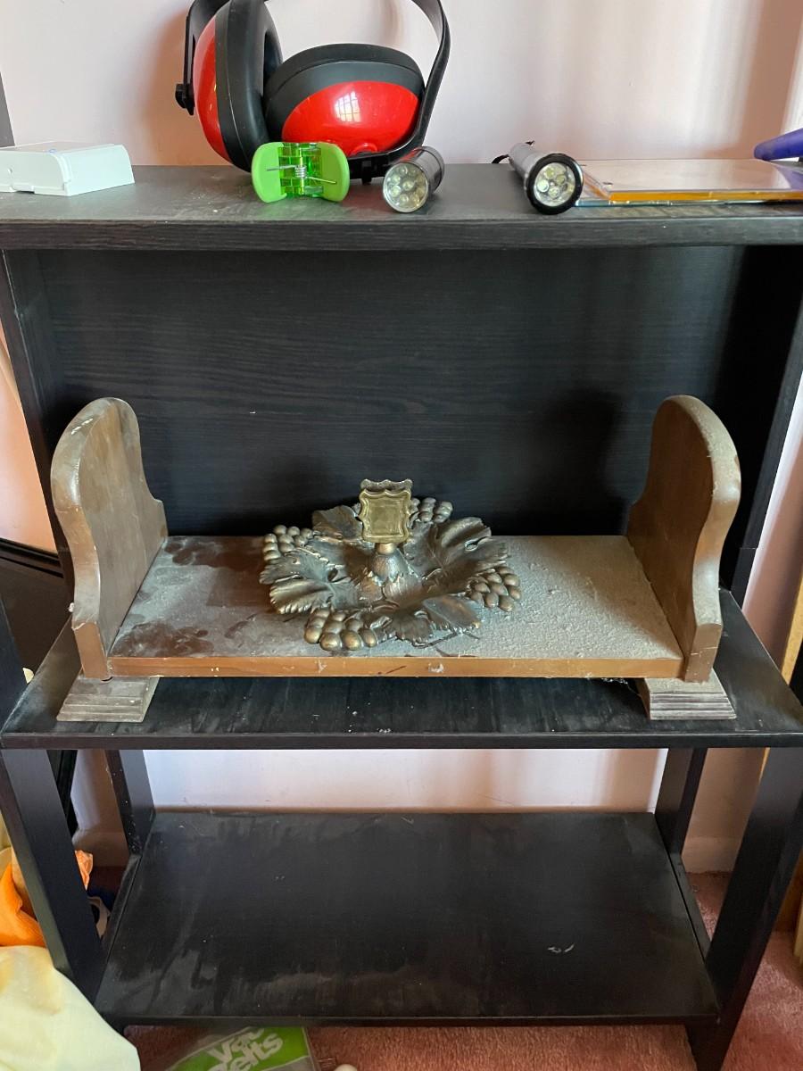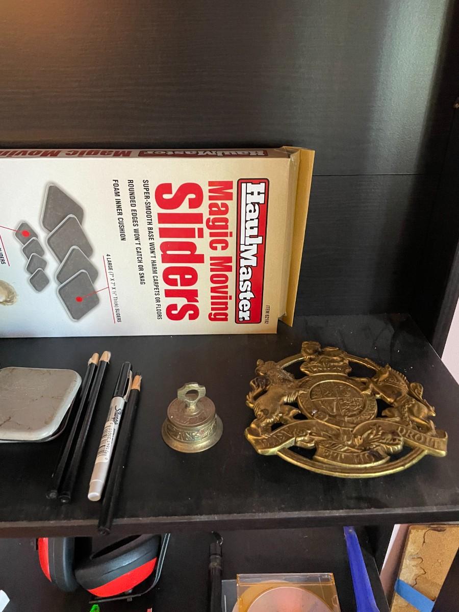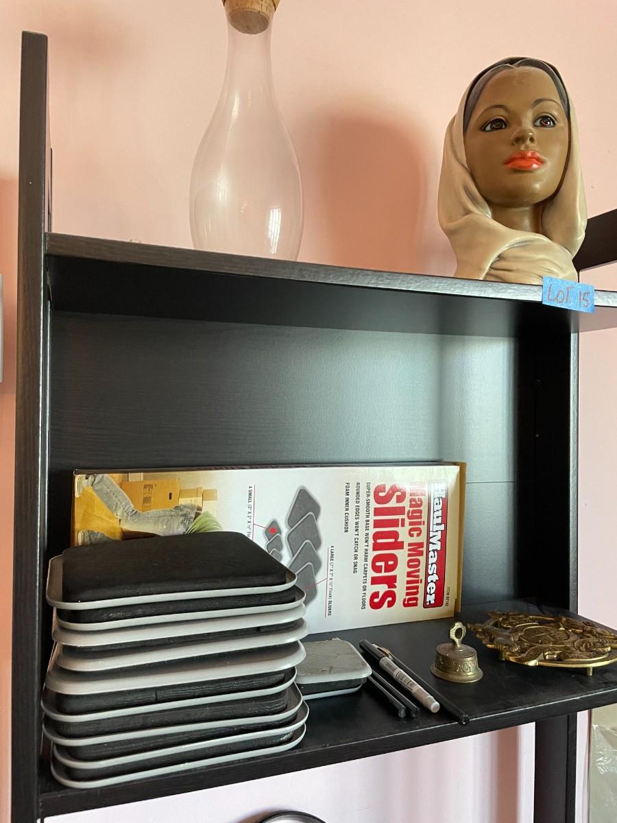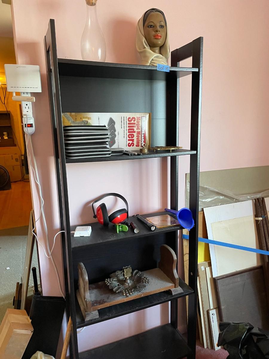 bookshelf ( 65 in. tall, 25 in. wide, 10 in. long), car protectors, cd's, moving pads, bronze decor, (2) flashlights, glass bottle, brass bell, brass decor, woman signed piece.