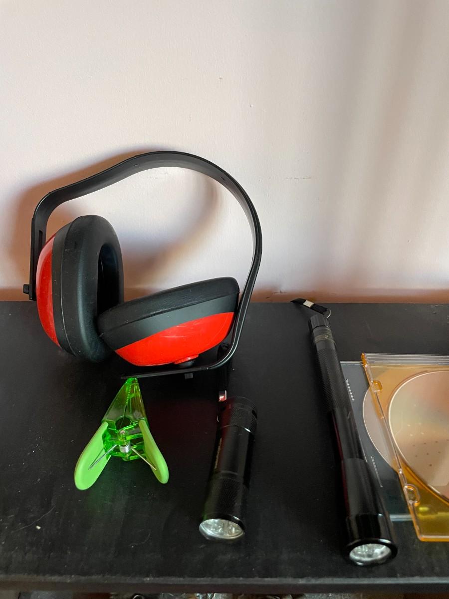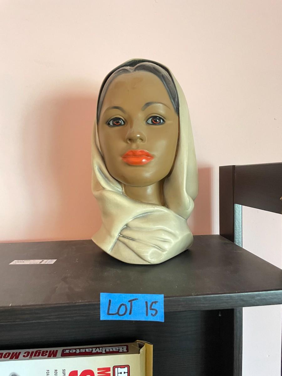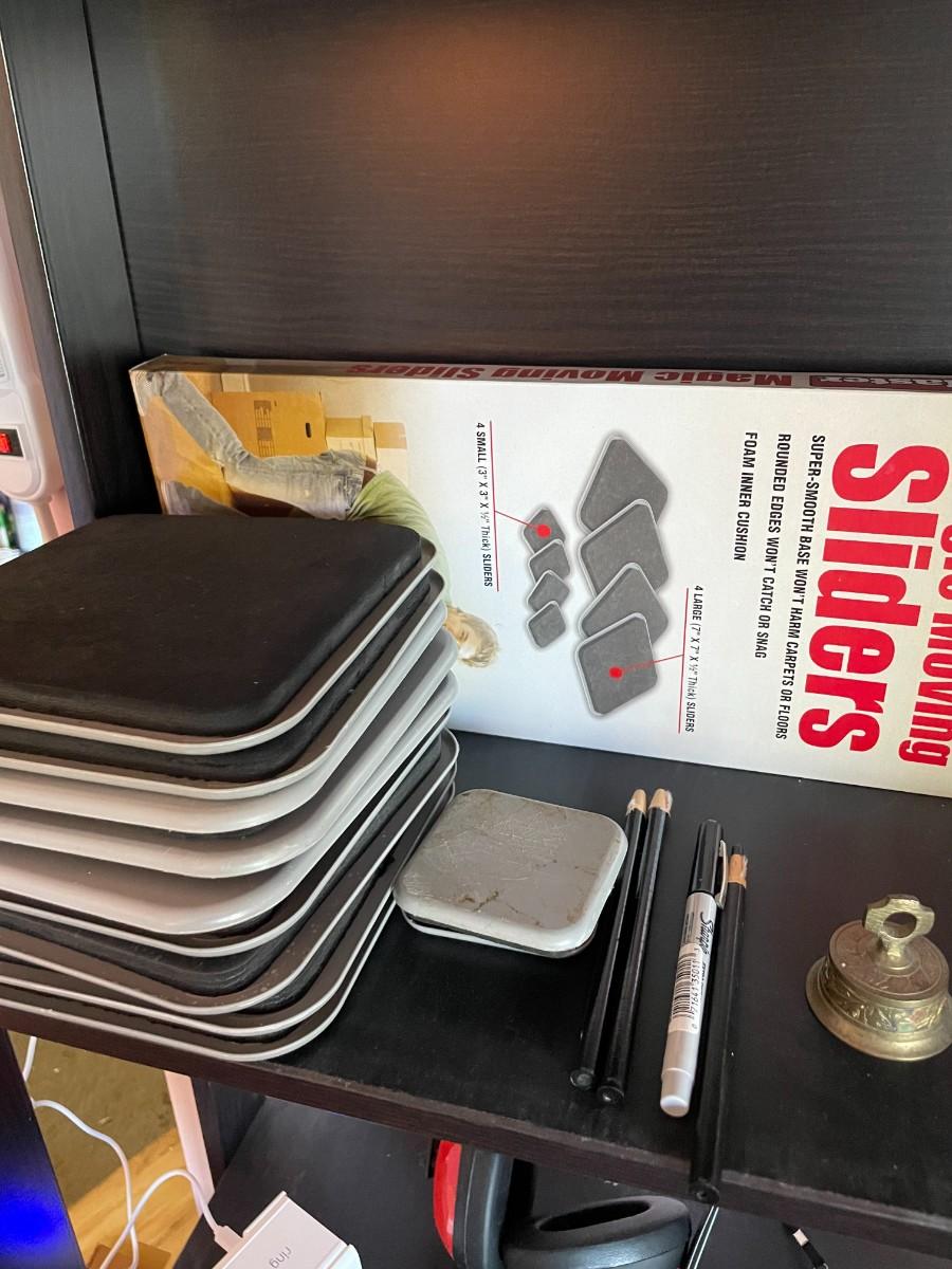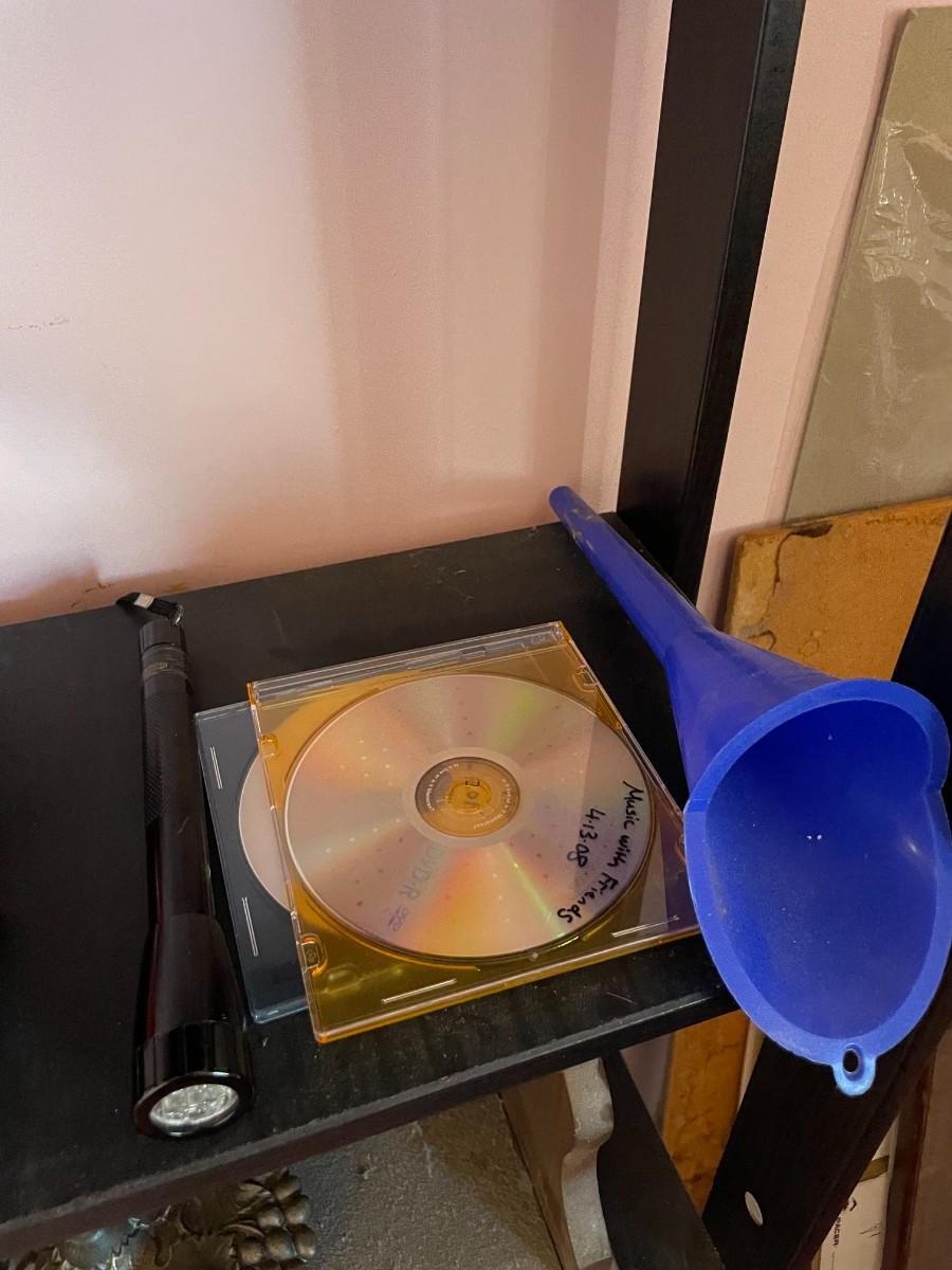 bookshelf ( 65 in. tall, 25 in. wide, 10 in. long), car protectors, cd's, moving pads, bronze decor, (2) flashlights, glass bottle, brass bell, brass decor, woman signed piece.