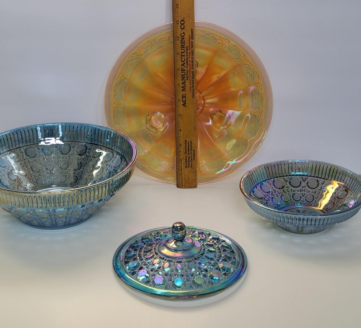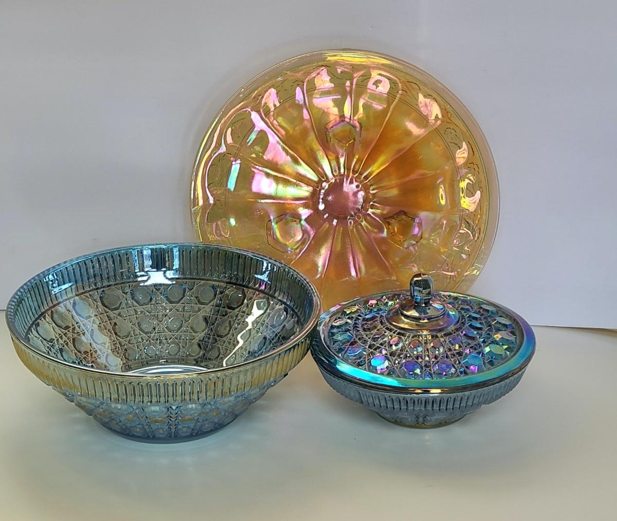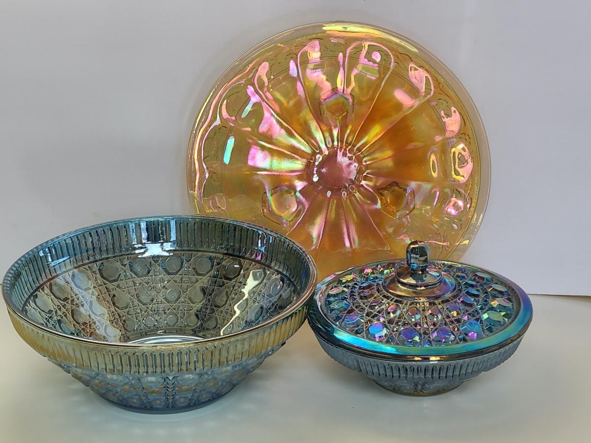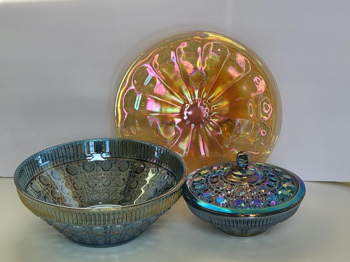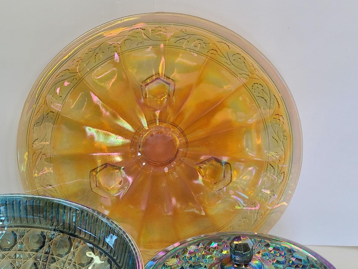 Lot 15: Carnival Glass Cake Plate, Covered Candy and More