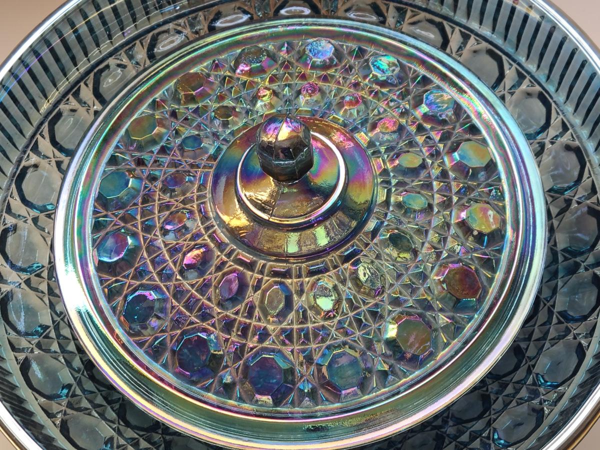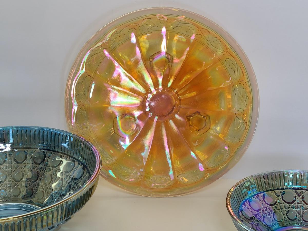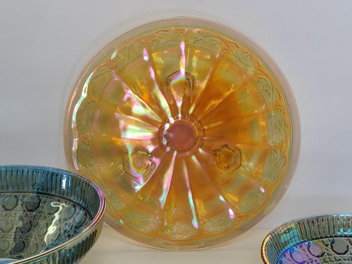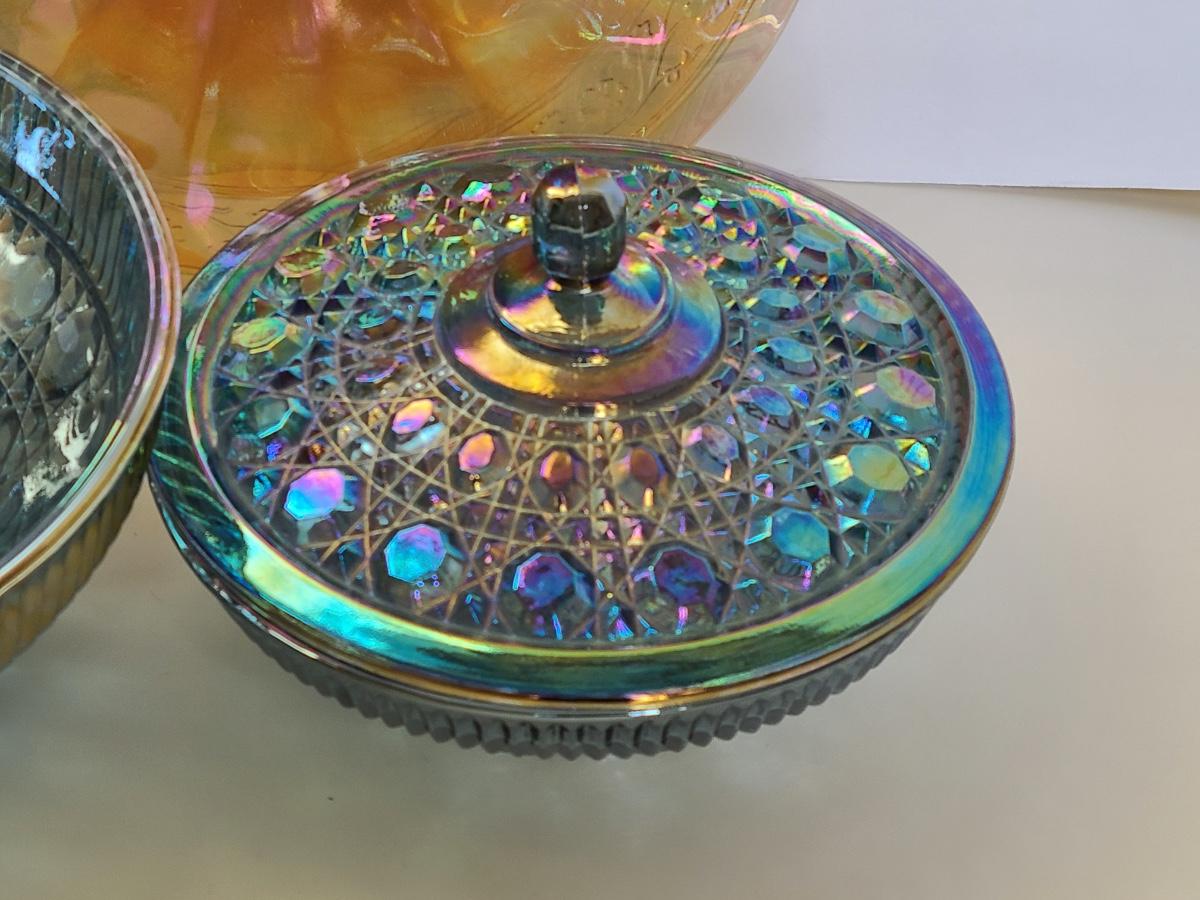 Lot 15: Carnival Glass Cake Plate, Covered Candy and More