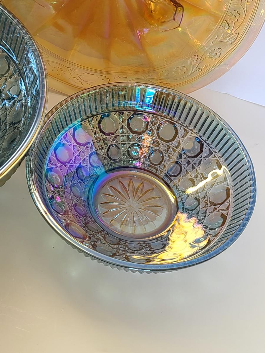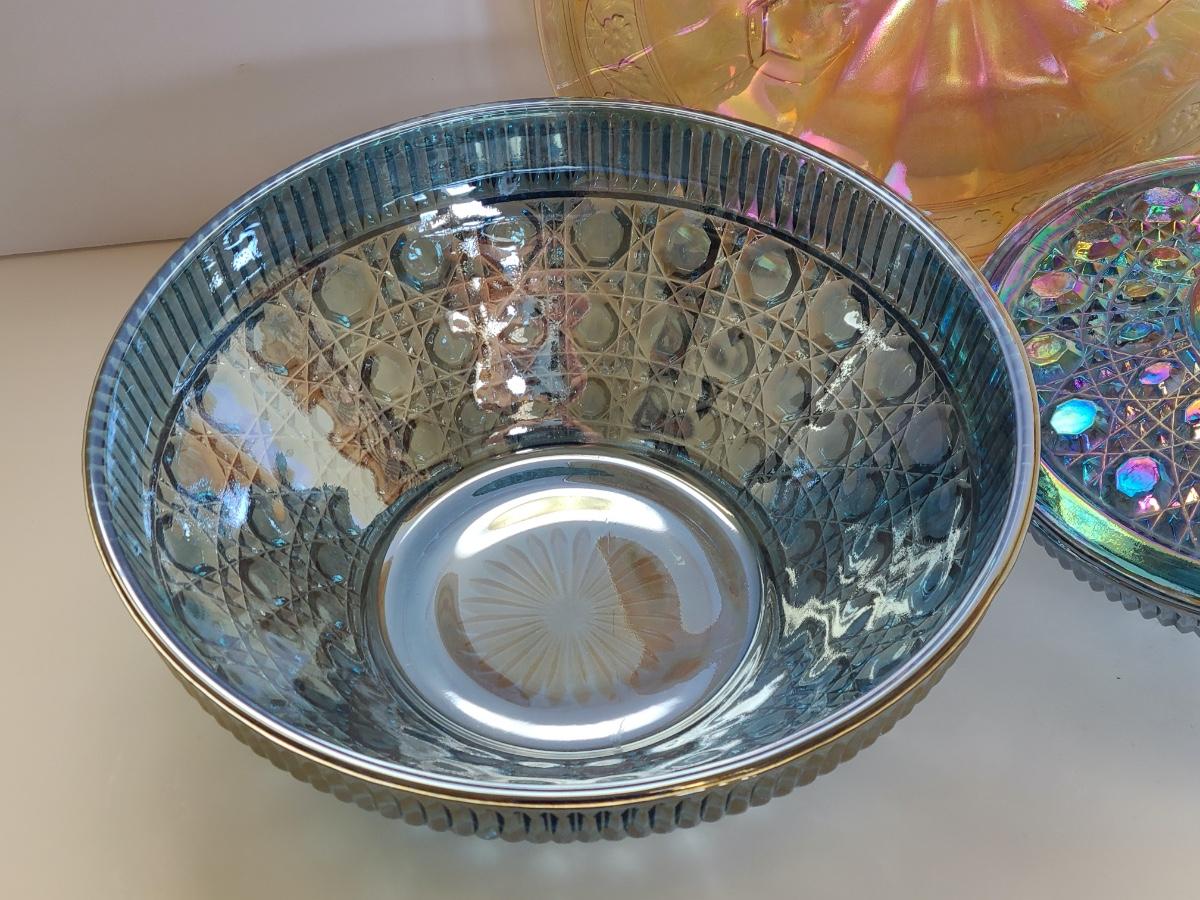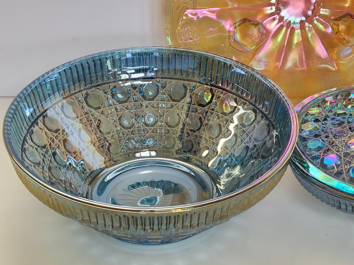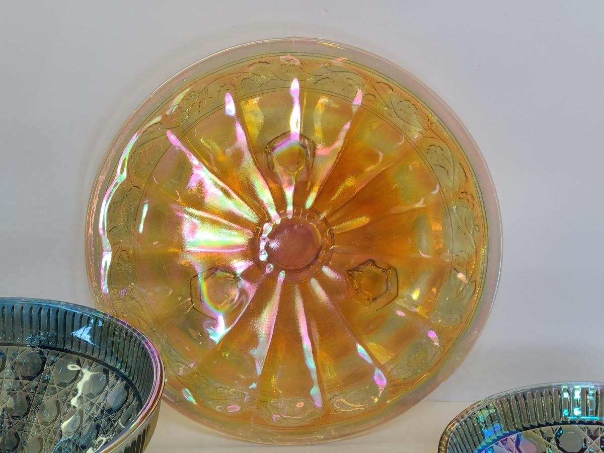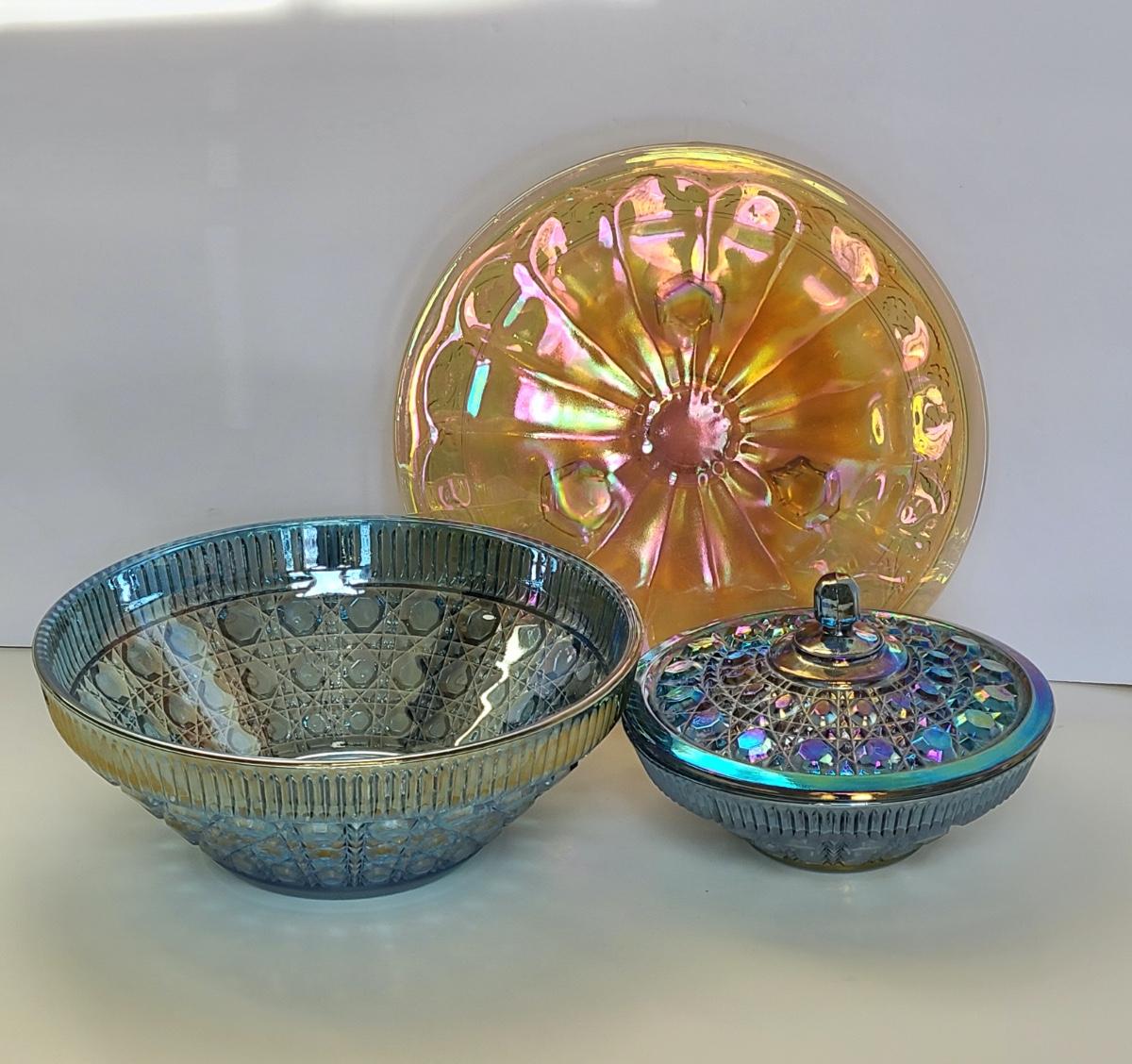 Lot 15: Carnival Glass Cake Plate, Covered Candy and More