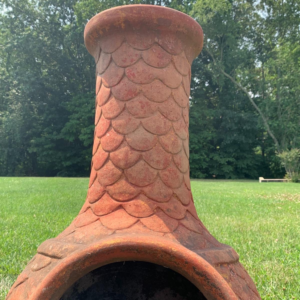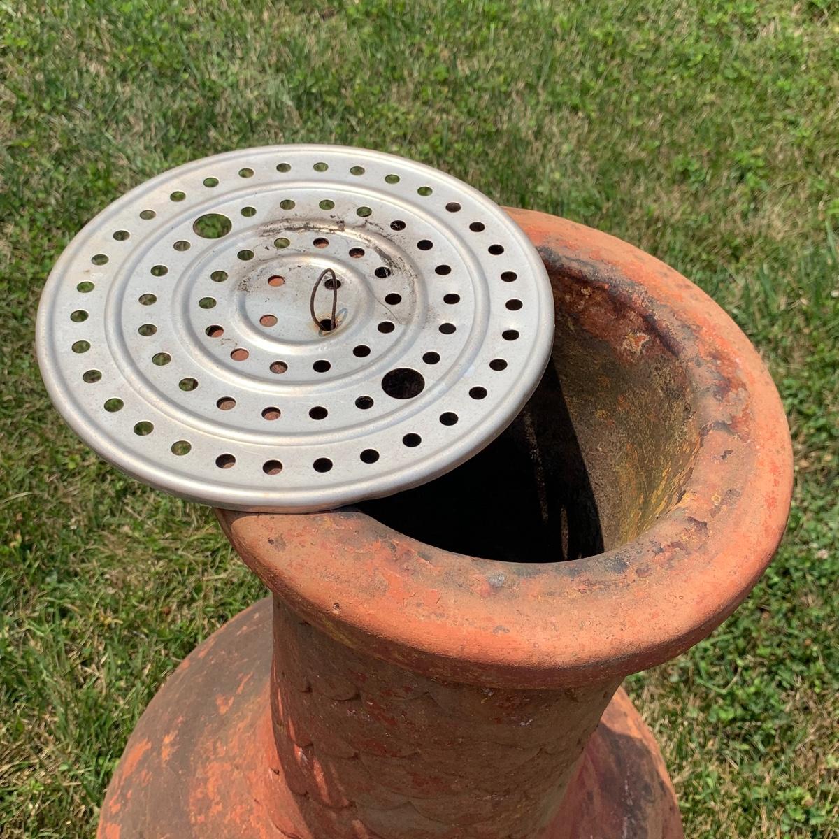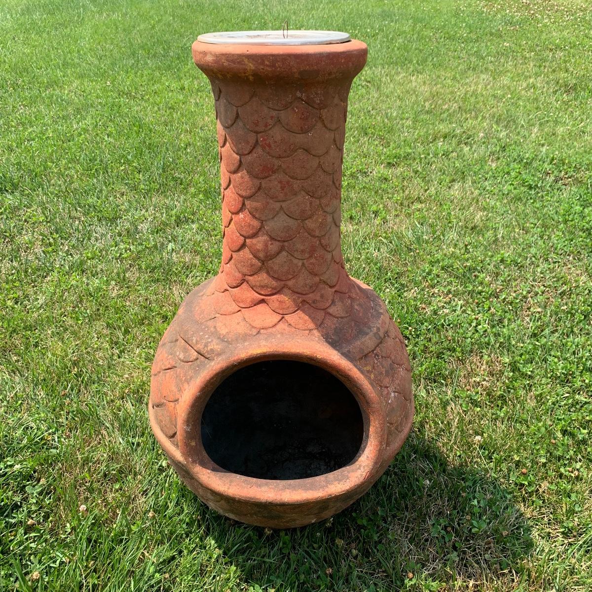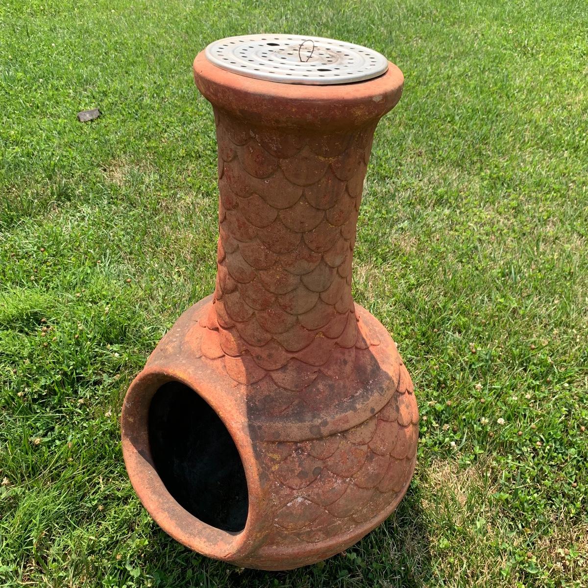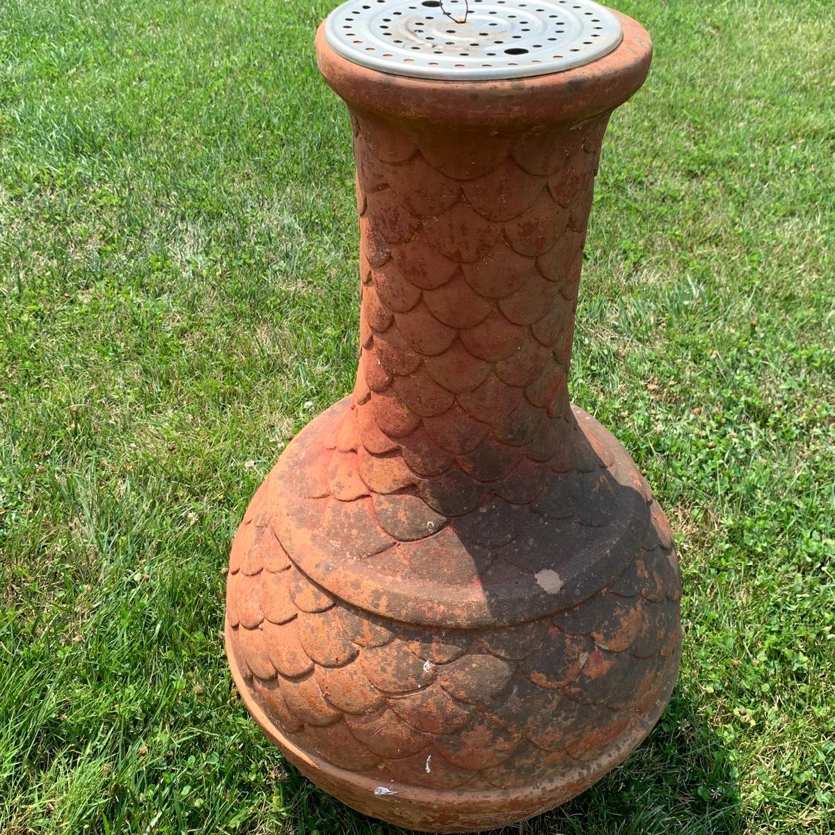 This is a nice outdoor ceramic chimenea. It’s a lovely terracotta color. It is in used condition and has been outside where it has collected dust, but still fully functional as a chimenea. It has a removable metal lid with holes for the smoke to get out. The chiminea is approximately 36” tall and 18” wide. It is quite heavy so the winning bidder will need to bring someone to help you move it to your car. Local pickup only.