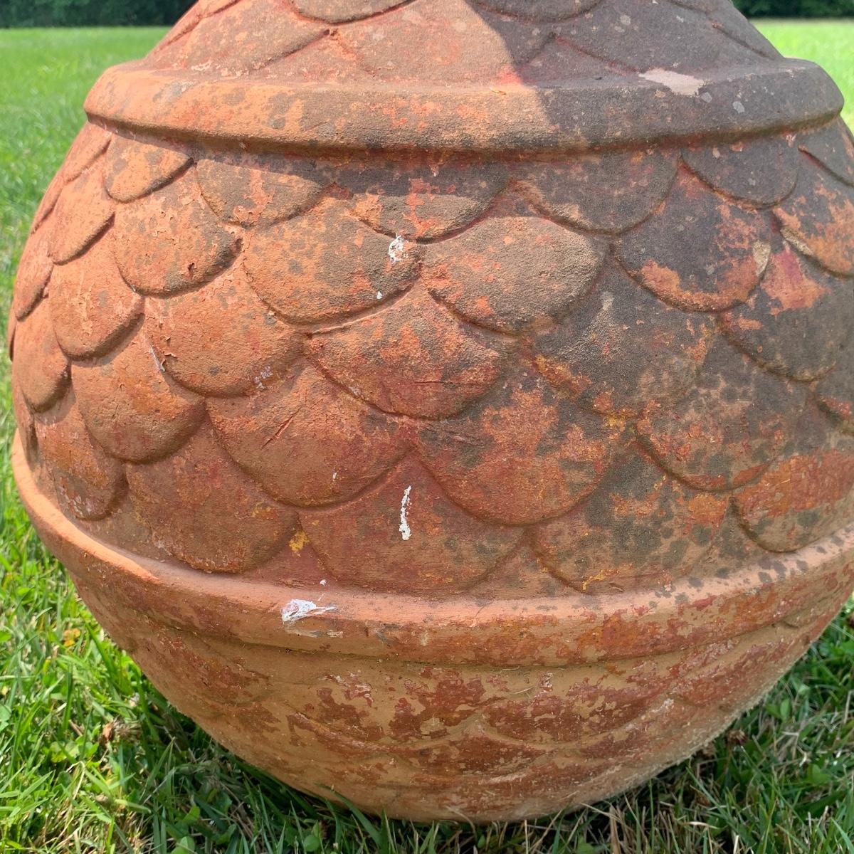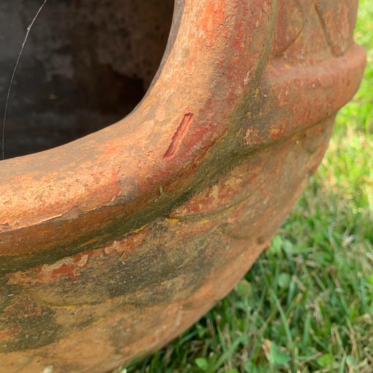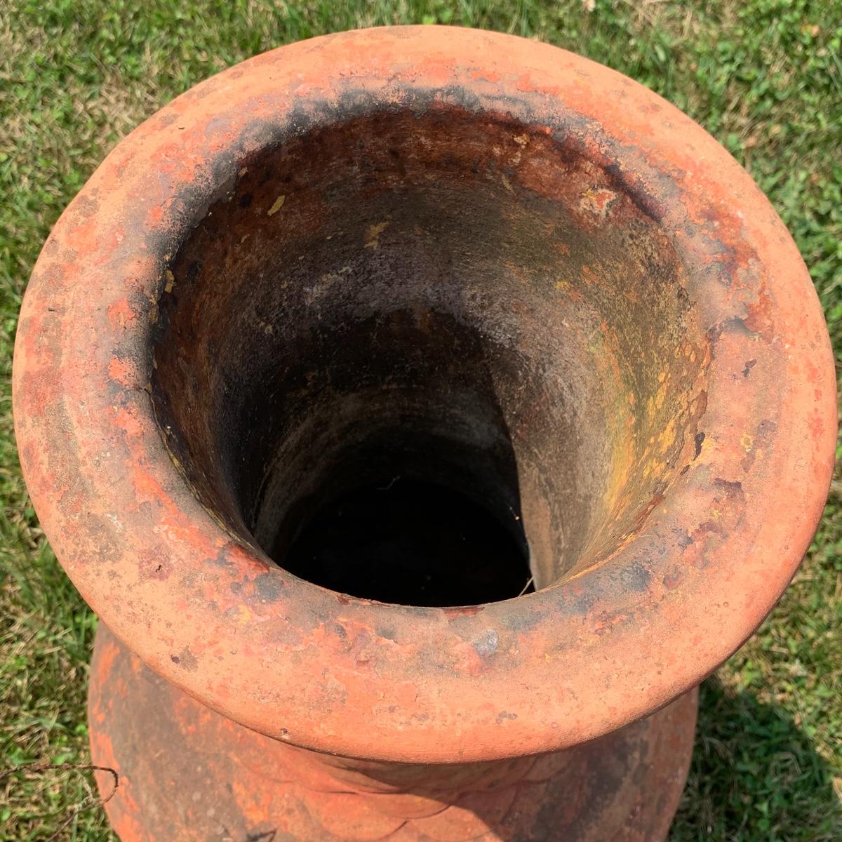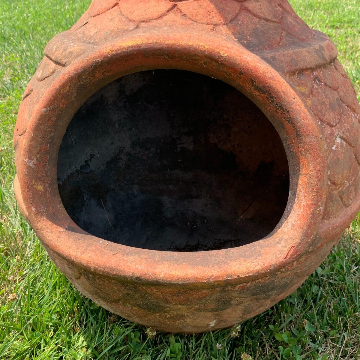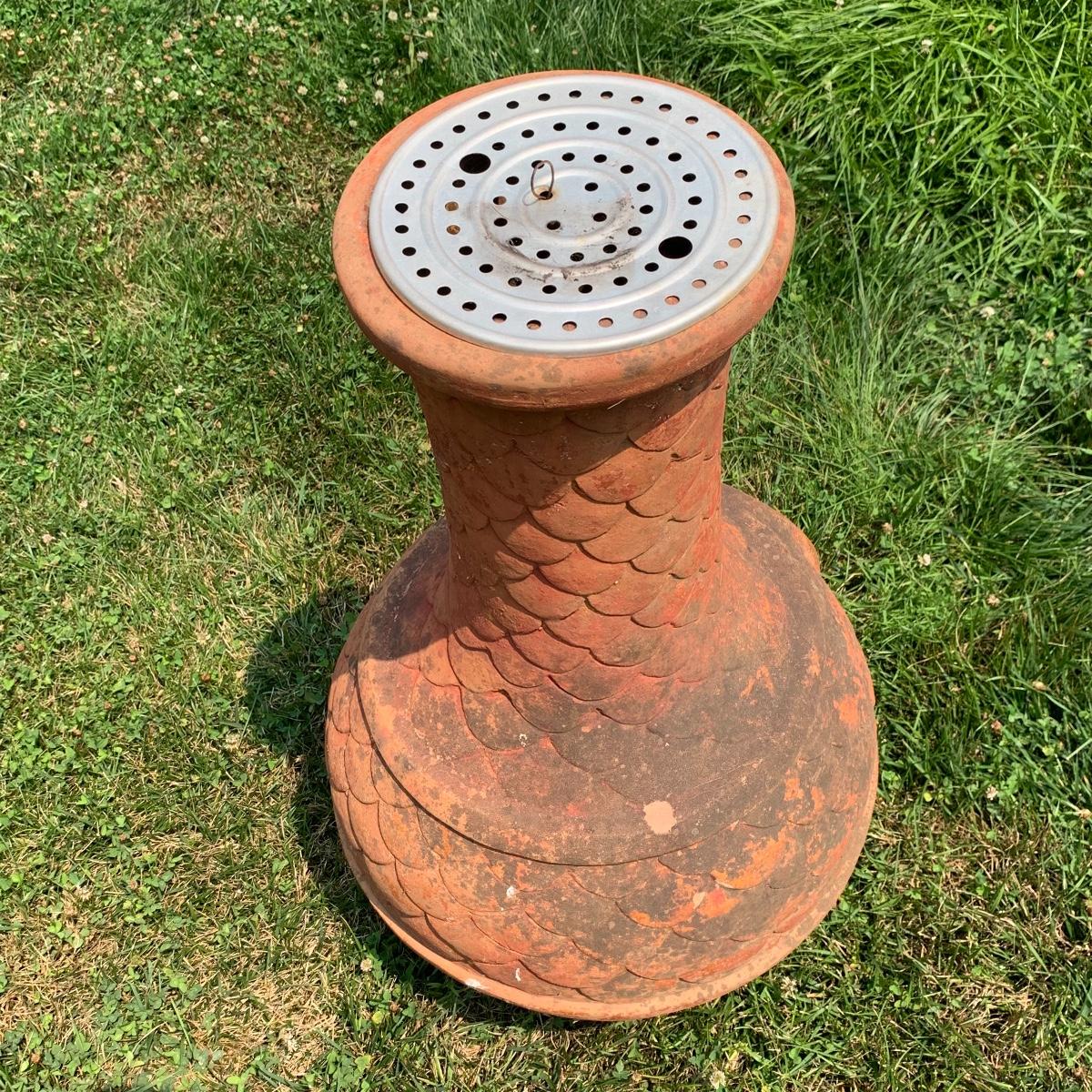 This is a nice outdoor ceramic chimenea. It’s a lovely terracotta color. It is in used condition and has been outside where it has collected dust, but still fully functional as a chimenea. It has a removable metal lid with holes for the smoke to get out. The chiminea is approximately 36” tall and 18” wide. It is quite heavy so the winning bidder will need to bring someone to help you move it to your car. Local pickup only.