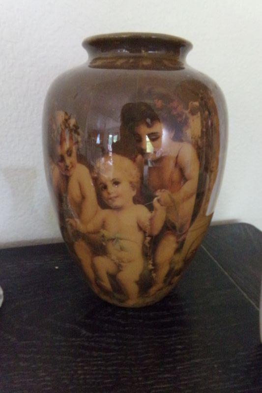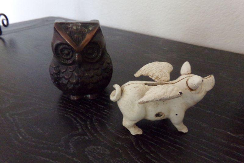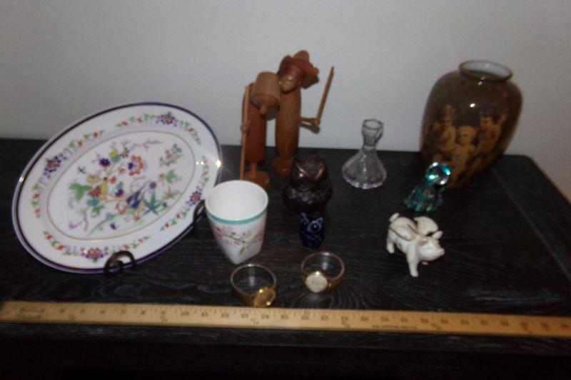 CAST IRON FLYING PIG BANK, BRASS OWL, HAND BLOWN COLORED GLASS CAT, CHINA PLATTER, 2 MEN'S SEIKO WATCHES, 2 WOOD CARVED FIGURES, VASE ADORNED WITH CHERUBS, IRON MOTHER AND CHILD AND MORE.