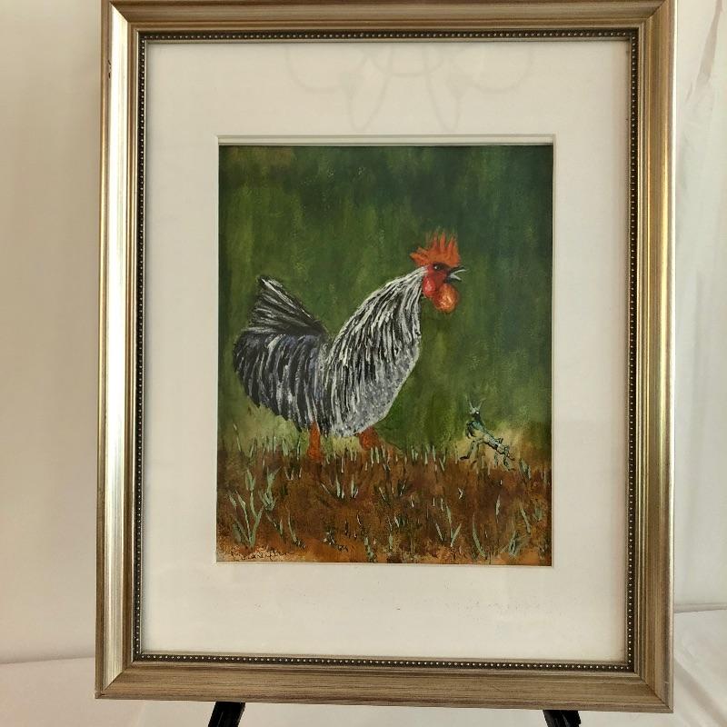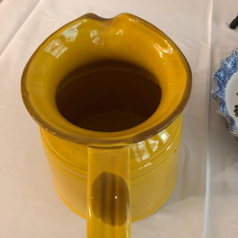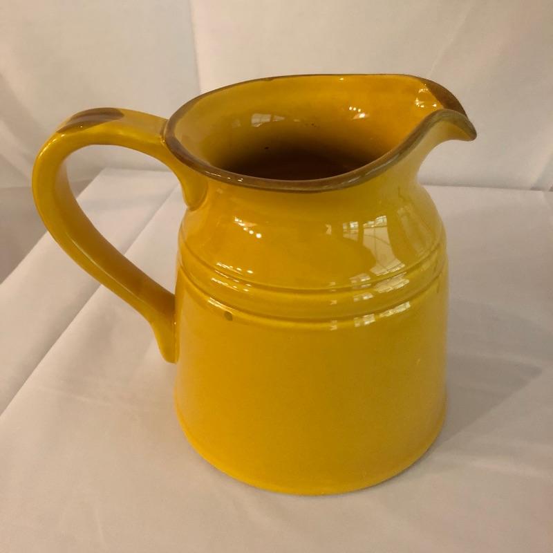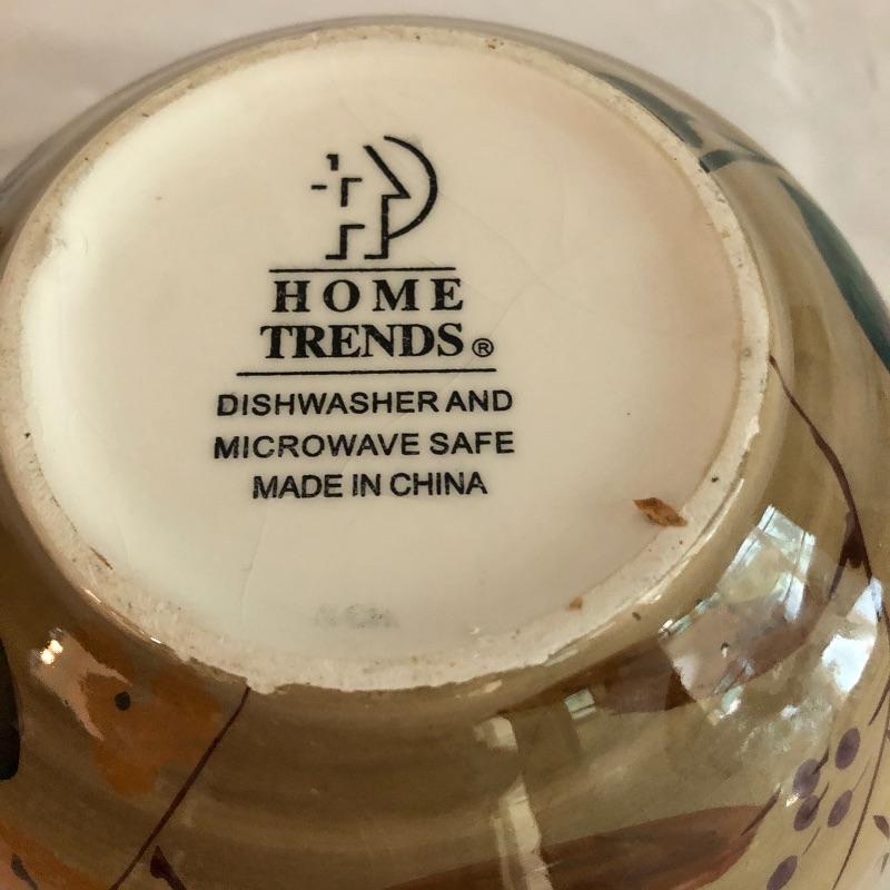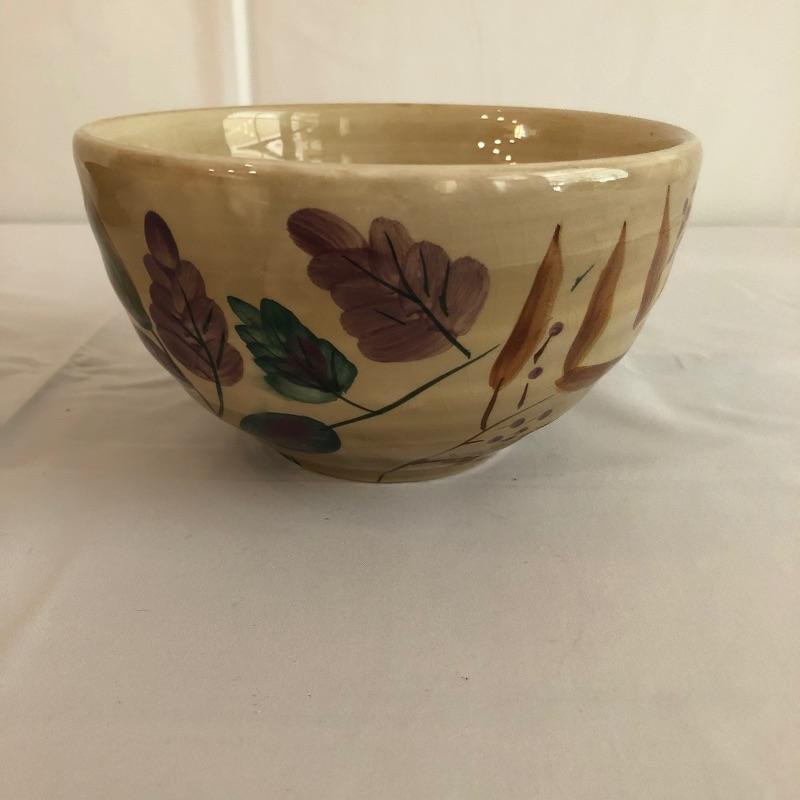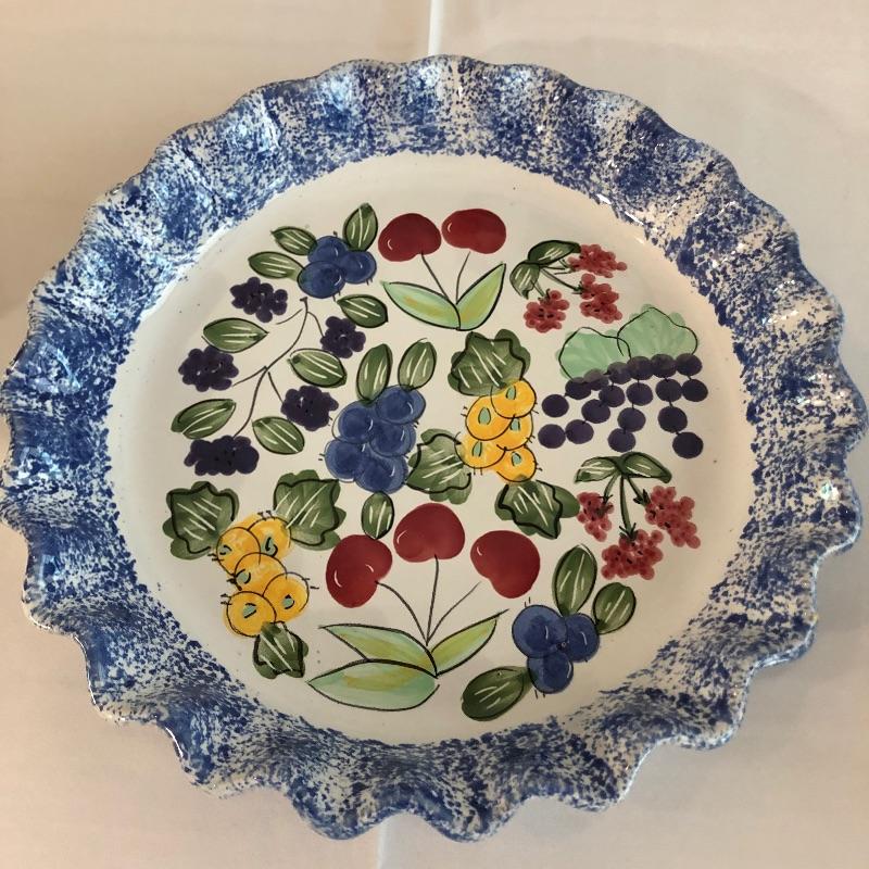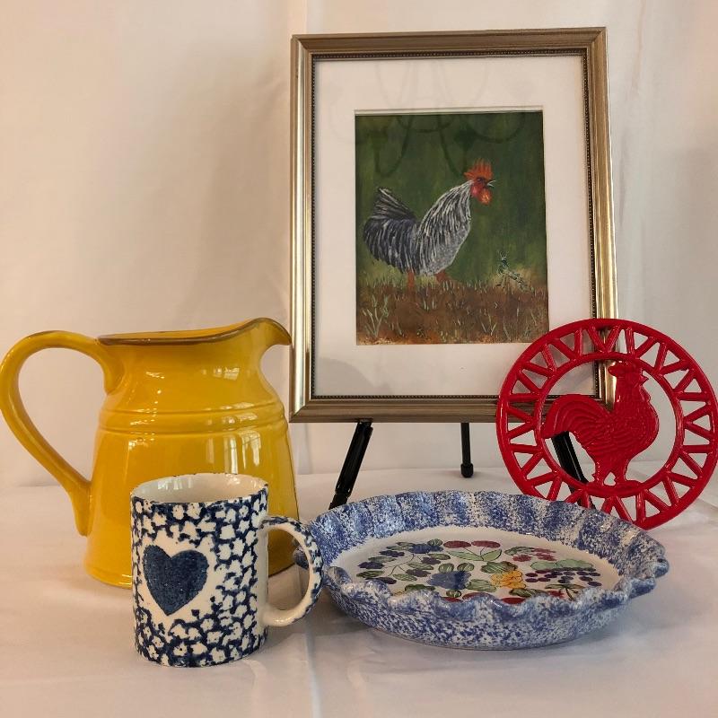 Quaint assortment of country kitchen pieces here that includes an adorable rooster painting that is matted and in a metallic frame; painting is not signed but it does have the name of a local person on the back who might be the artist, see images. It measures 12.5” x 15.5”. The yellow pitcher is a nice big size and appears to be ceramic, but no signature either. The rest of this lot includes a red metal rooster trivet that is missing one rubber piece that should be an easy fix, an autumnal ceramic bowl, large brown speckled ceramic shallow platter, pretty blue speckled and fruit design pie plate and last but not least an adorable mug with an illegible stamp.