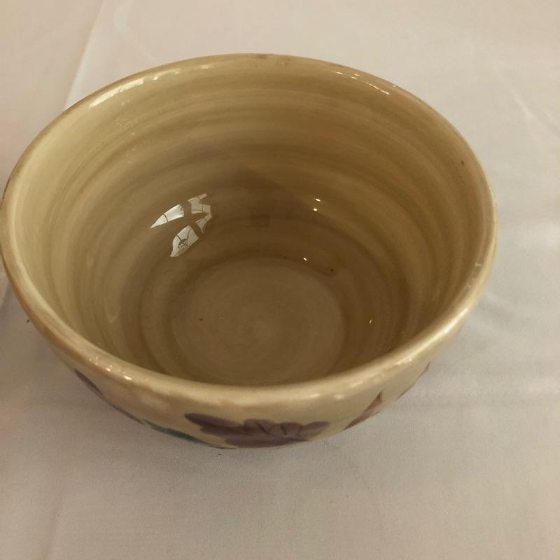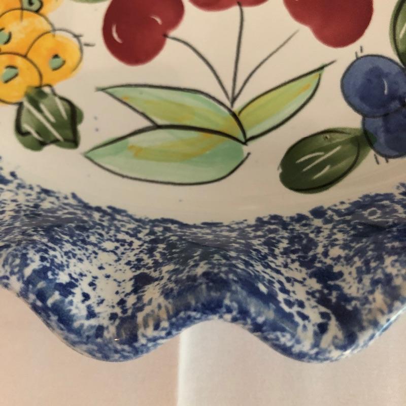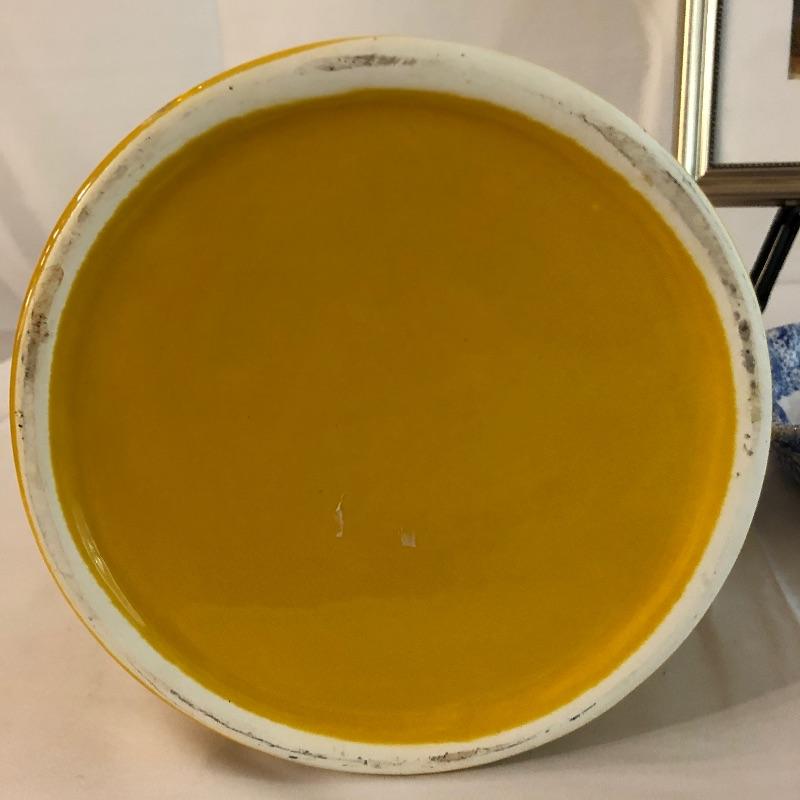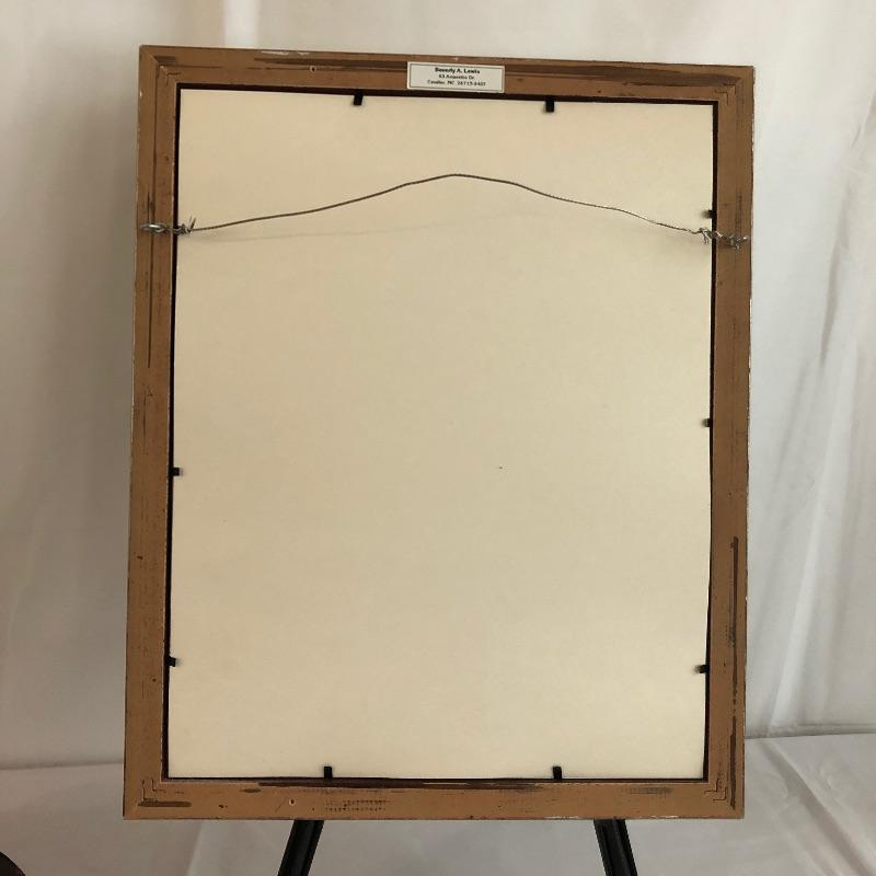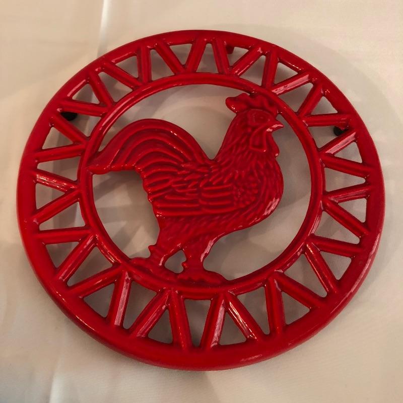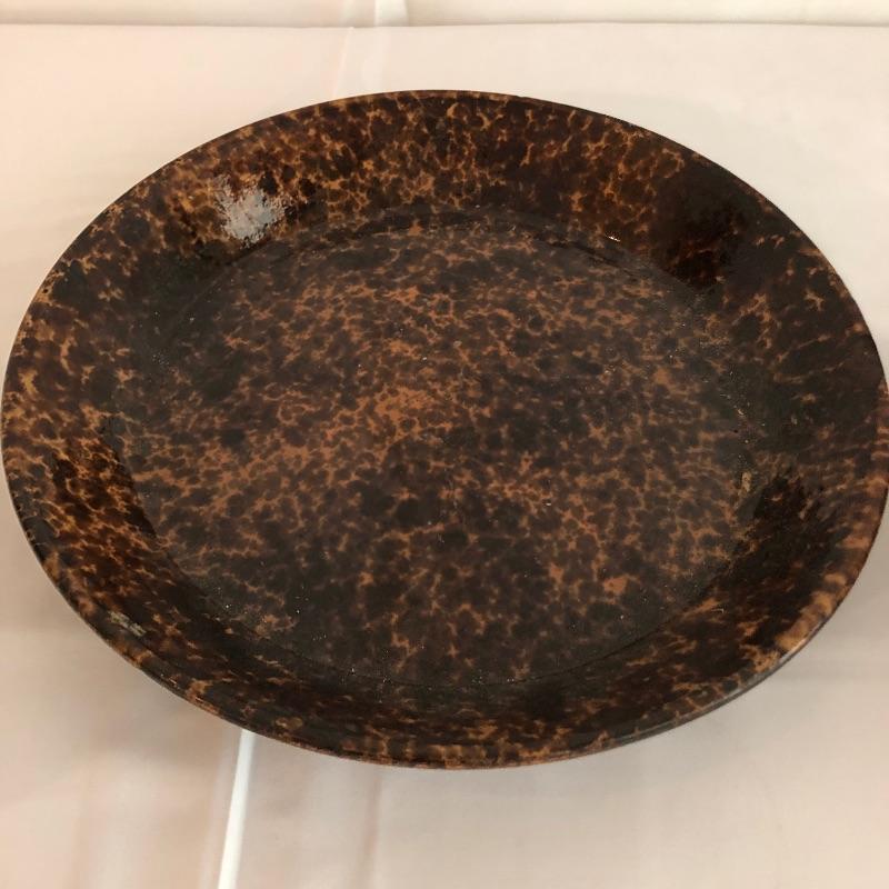 Quaint assortment of country kitchen pieces here that includes an adorable rooster painting that is matted and in a metallic frame; painting is not signed but it does have the name of a local person on the back who might be the artist, see images. It measures 12.5” x 15.5”. The yellow pitcher is a nice big size and appears to be ceramic, but no signature either. The rest of this lot includes a red metal rooster trivet that is missing one rubber piece that should be an easy fix, an autumnal ceramic bowl, large brown speckled ceramic shallow platter, pretty blue speckled and fruit design pie plate and last but not least an adorable mug with an illegible stamp.
