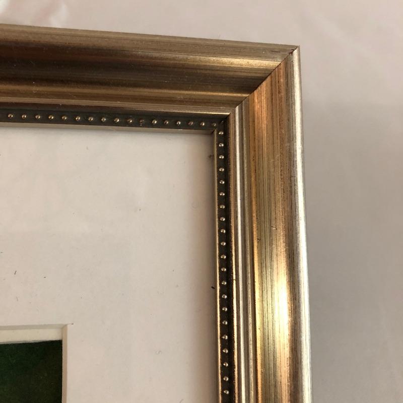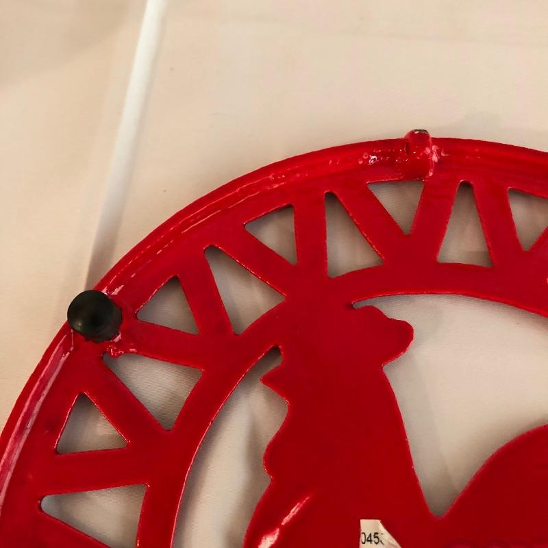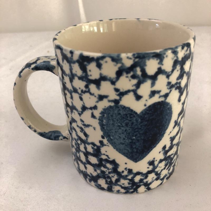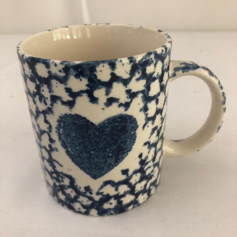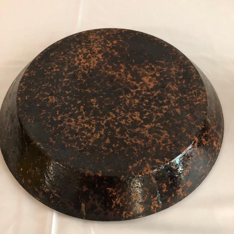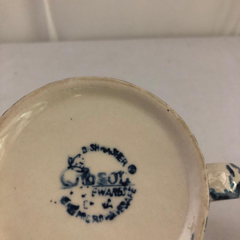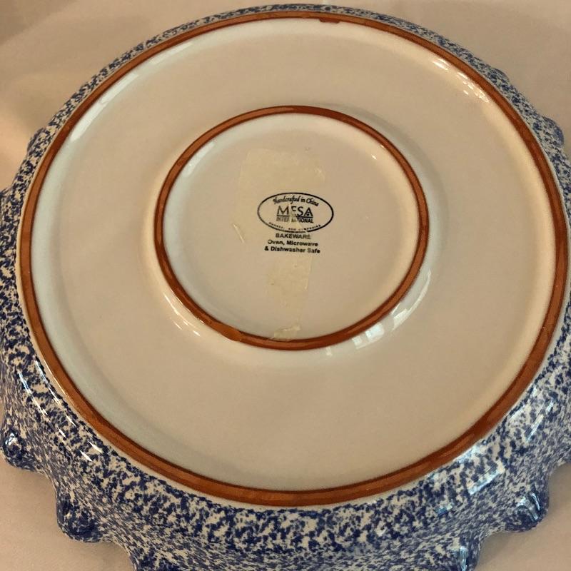 Quaint assortment of country kitchen pieces here that includes an adorable rooster painting that is matted and in a metallic frame; painting is not signed but it does have the name of a local person on the back who might be the artist, see images. It measures 12.5” x 15.5”. The yellow pitcher is a nice big size and appears to be ceramic, but no signature either. The rest of this lot includes a red metal rooster trivet that is missing one rubber piece that should be an easy fix, an autumnal ceramic bowl, large brown speckled ceramic shallow platter, pretty blue speckled and fruit design pie plate and last but not least an adorable mug with an illegible stamp.