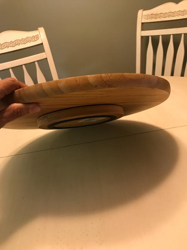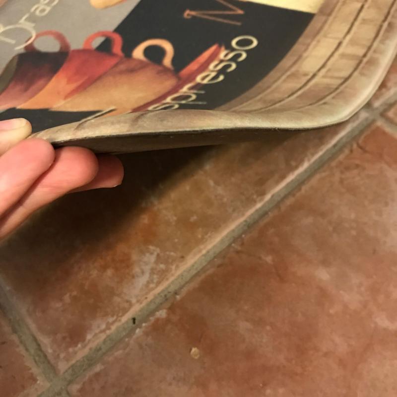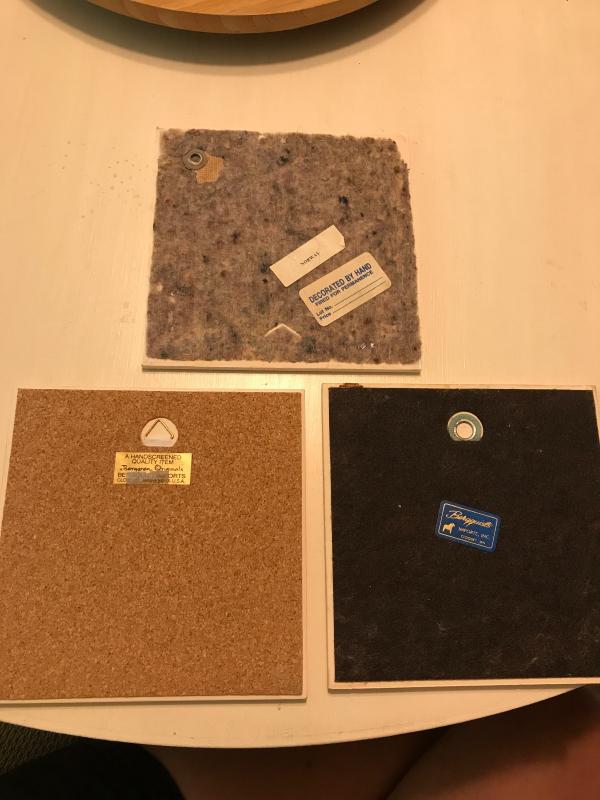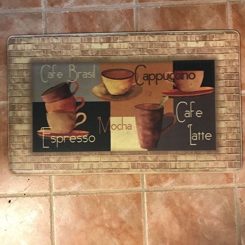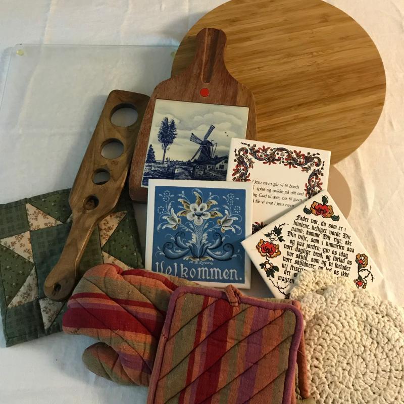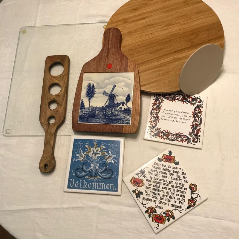 One cutting board with Delft blue trivets inlaid and one glass. Also includes a lazy Susan measuring 13”d, a spaghetti measuring tool, a kitchen floor mat, and three international tile trivets. No shipping.