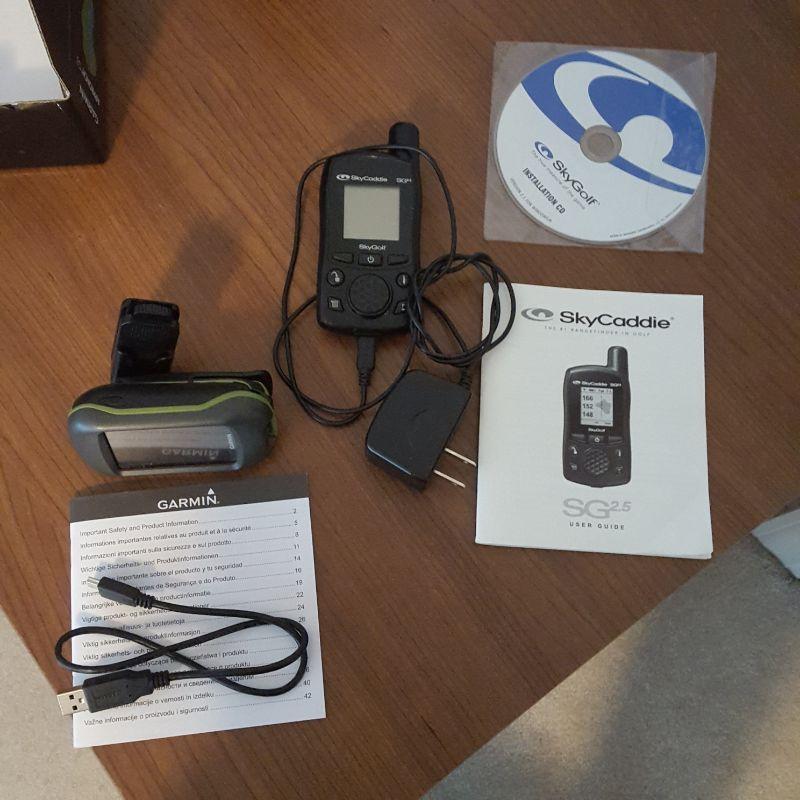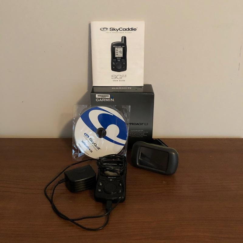 Attention all golf lovers! Boost your golfing game with this Garmin Approach G3, a digital golf device with thousands of preloaded golf courses. This tool makes it easier to golf, showing you the exact yardage to fairways, greens, and more! This great lot also comes with a SkyCaddie DVD and SG2.5 unit which is a handheld GPS. Both devices power on when plugged in, but have not been fully tested. The Garmin comes with a USB cord, belt clip and owners manual. The SkyGolf comes with a installation CD, owners manual, and a power cord. Shipping available.