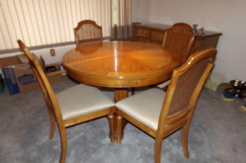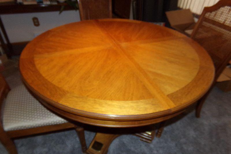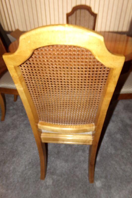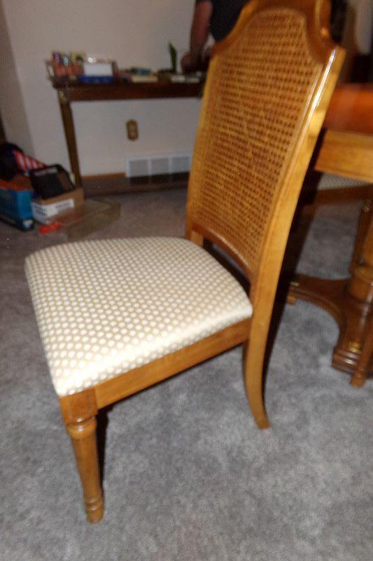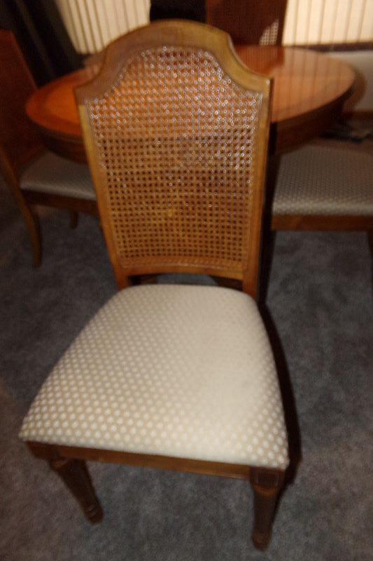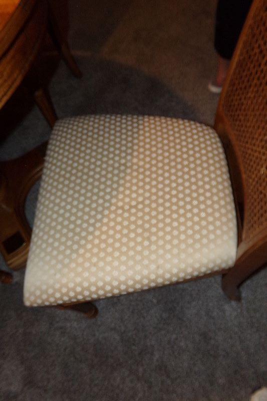 INCLUDES 4 UPHOLSTERED SEAT WITH CANE BACK CHAIRS, THERE IS A LIGHT STAIN ON 1 CHAIR SEAT OTHERWISE ALL IS IN VG CONDITION