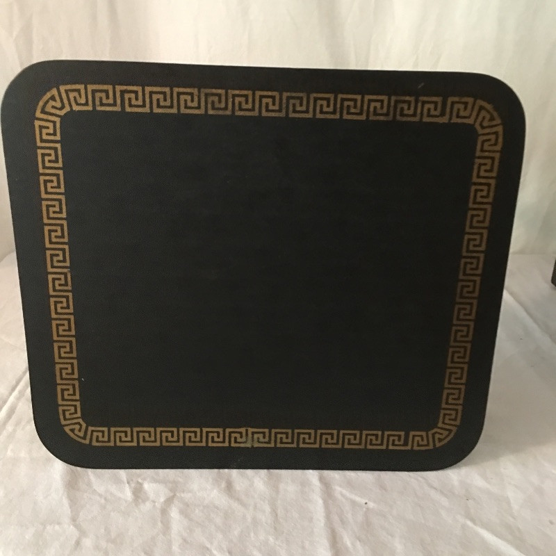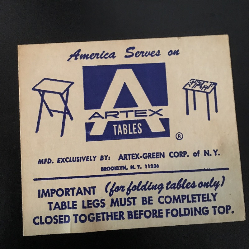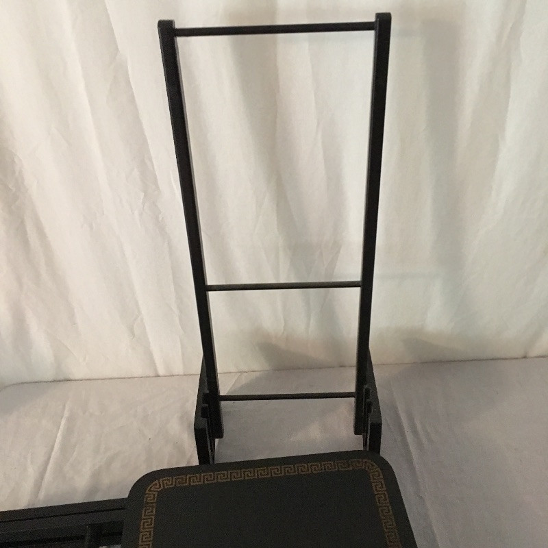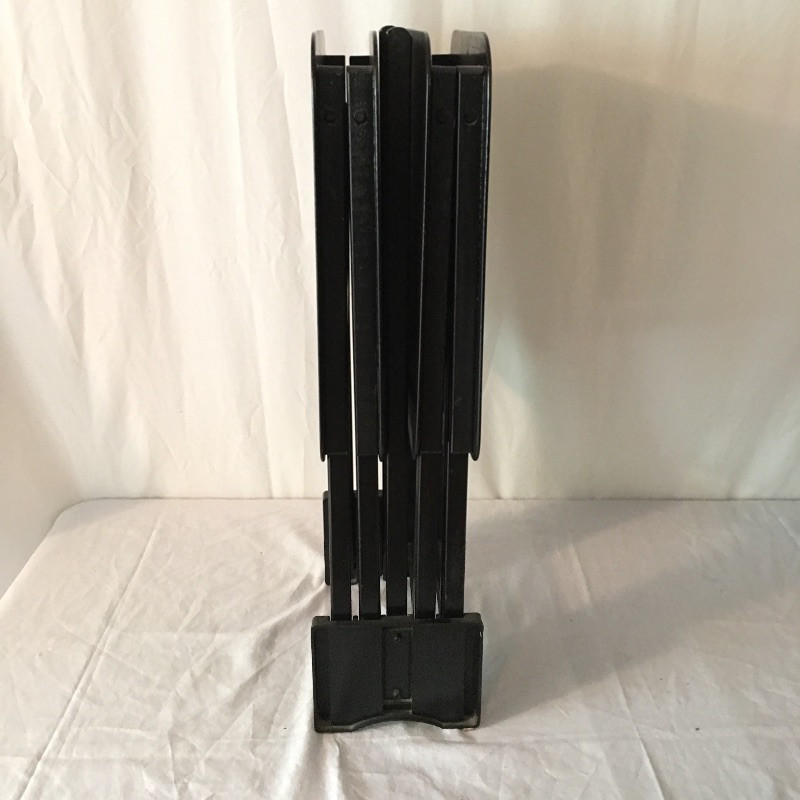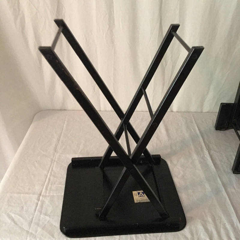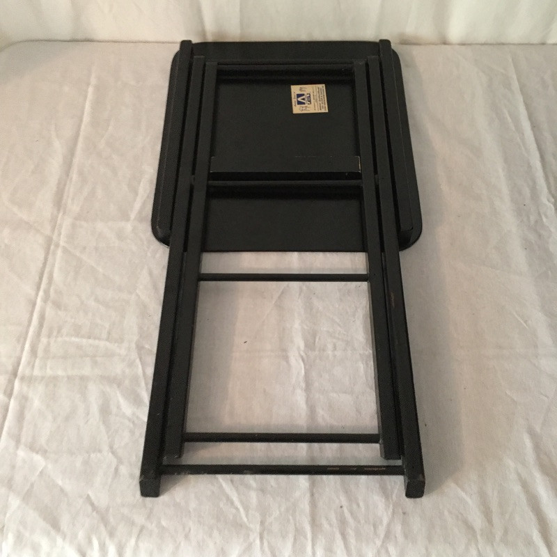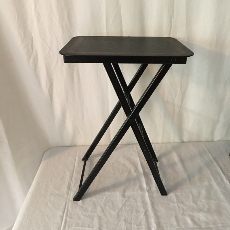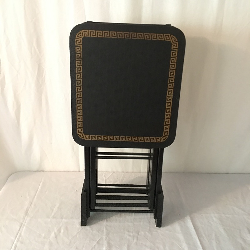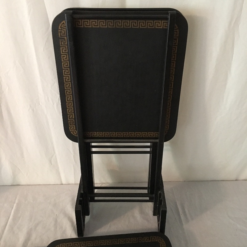 Four Artex folding tables with storage stand. A great way to have tables ready without taking up all your space with this art deco like black and gold tables. Tables measure 13.75” x 15.75” x 21.75”.