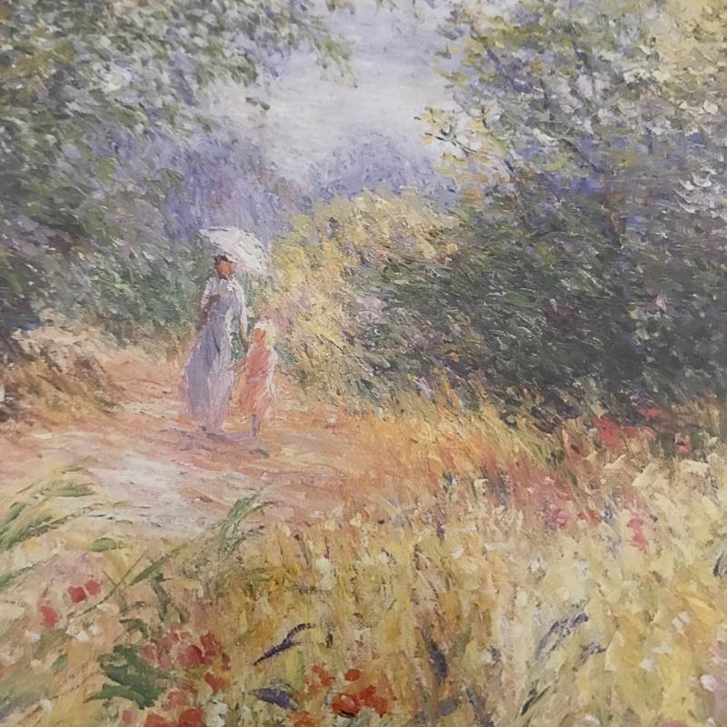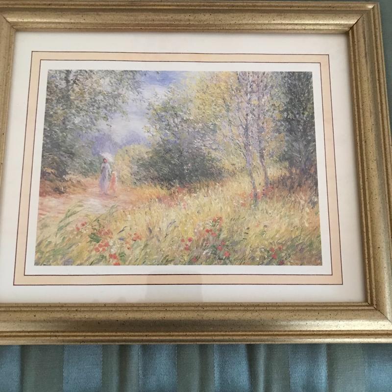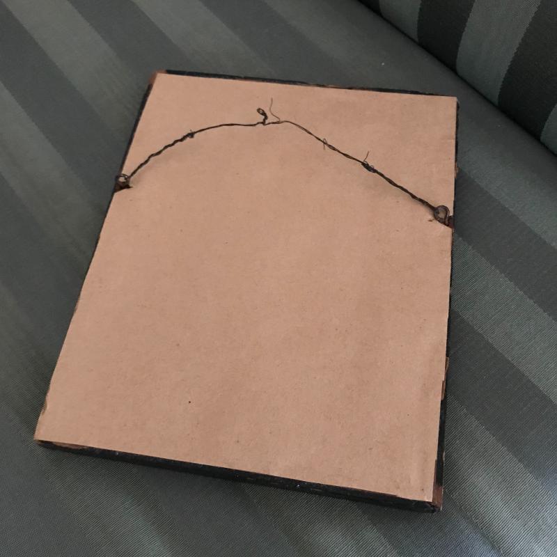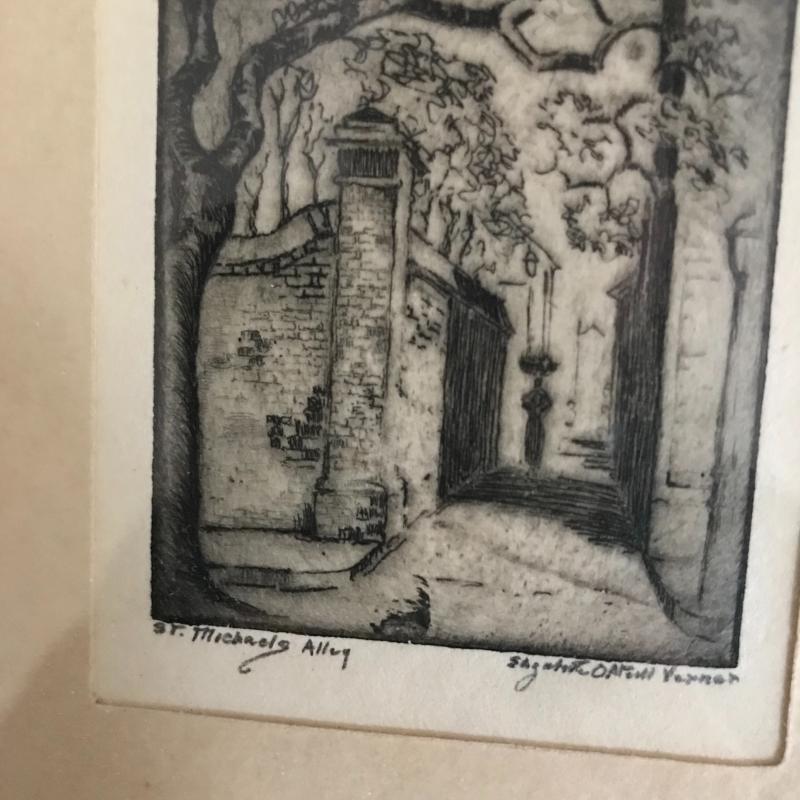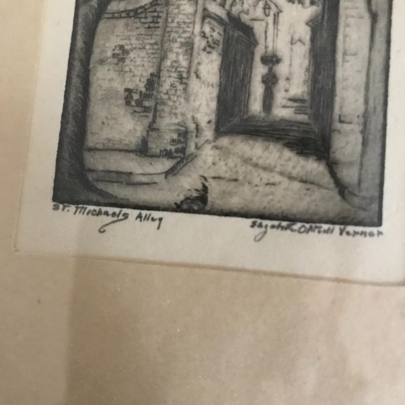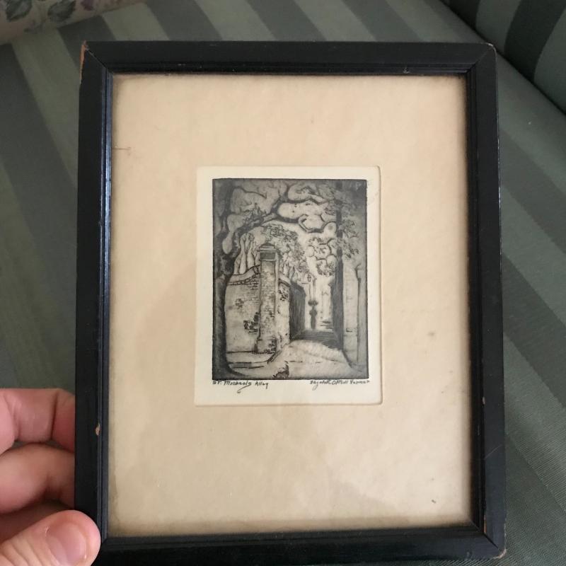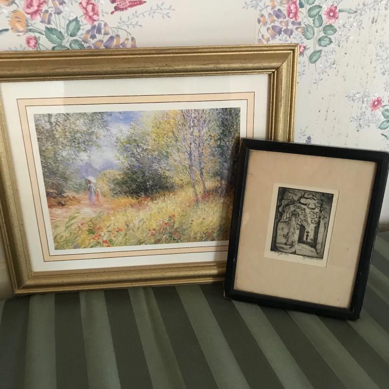 Framed mother and child print, 11.5” x 9.5”, and antique framed sketch (or block print?) signed by the artist (whose name is not clear), 6.5” x 5.25”.