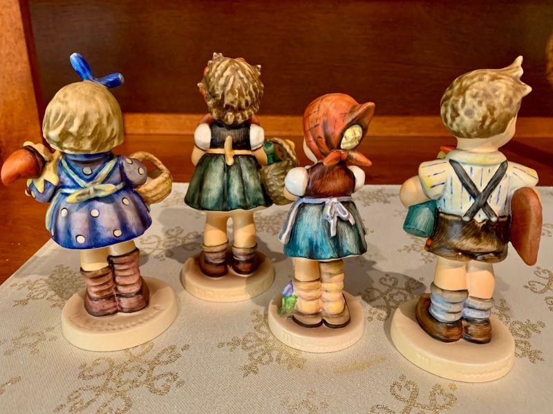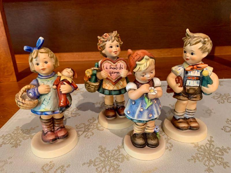 Goebel Collector's Club Special Edition. Group of 4 vintage Hummel figurines 6" tall. What Now, Girl with Heart Valentine, Daisys Don't Tell, Chocolates Wine Valentine Boy White bisque Collector's Club plaque