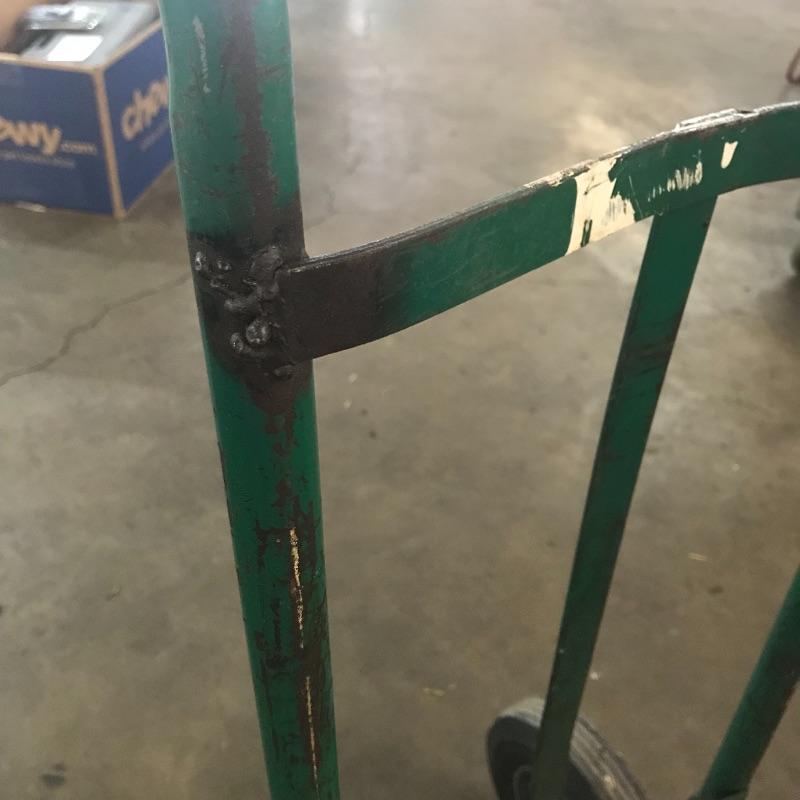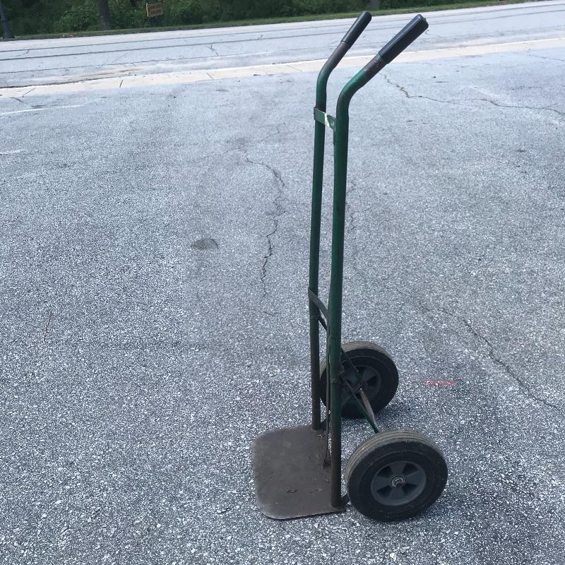 No pump? No problem! Nice hard wheeled metal hand truck will get the job done. Equipment stands about 18” x 46” and one railing appears to have been welded. Also, this hand truck may need some cleaning depending on your need, there is car grease and grime on the lift. See photos. No shipping.