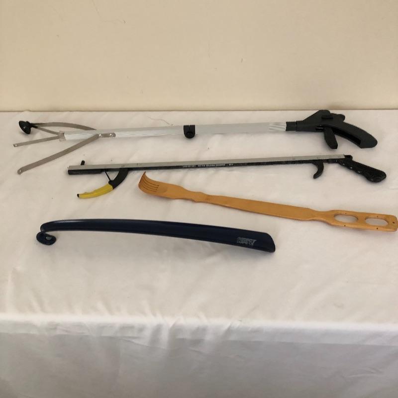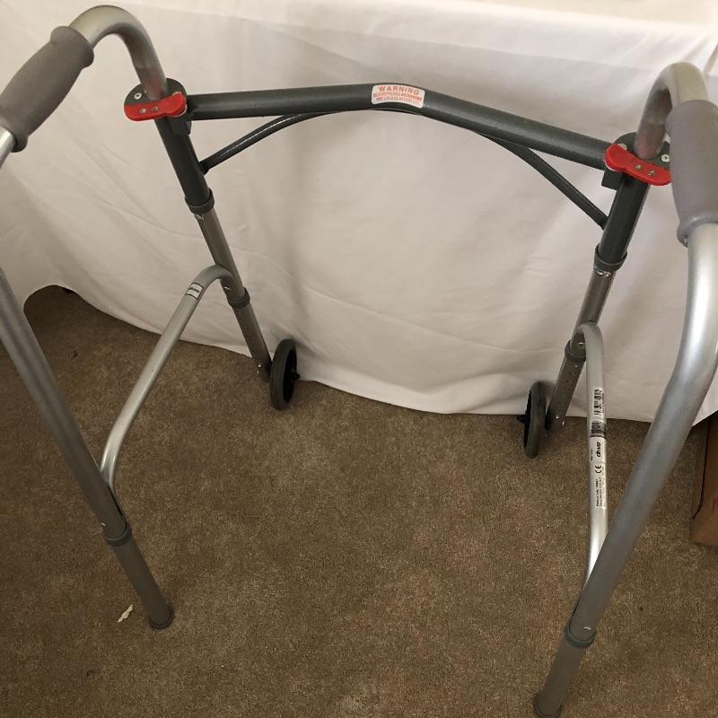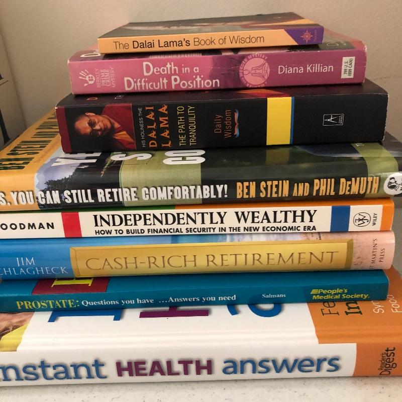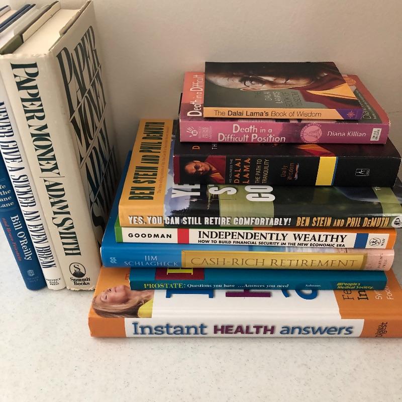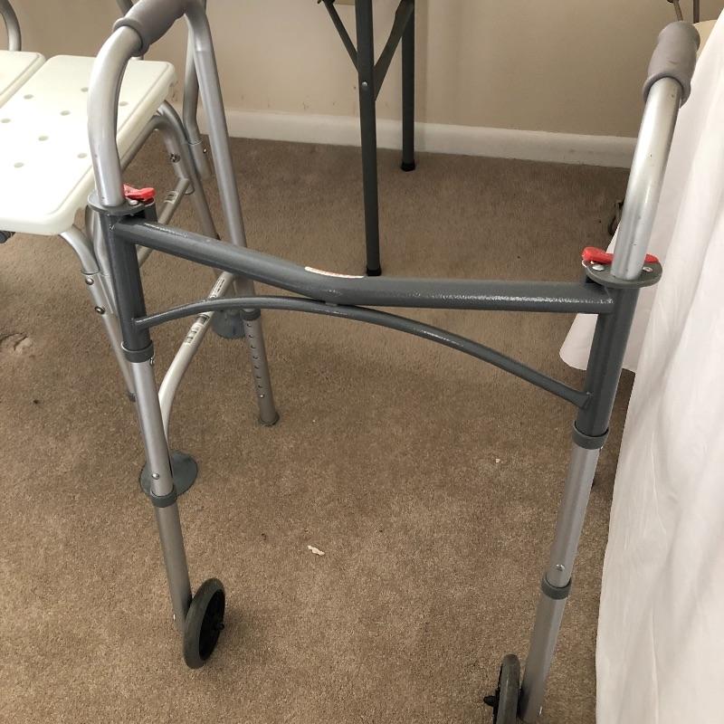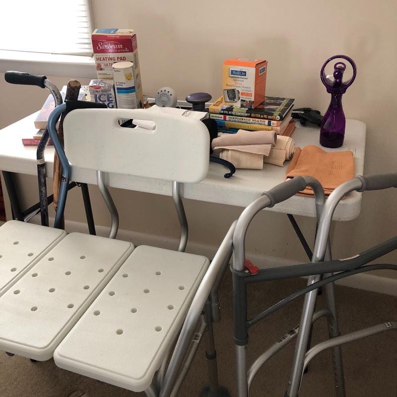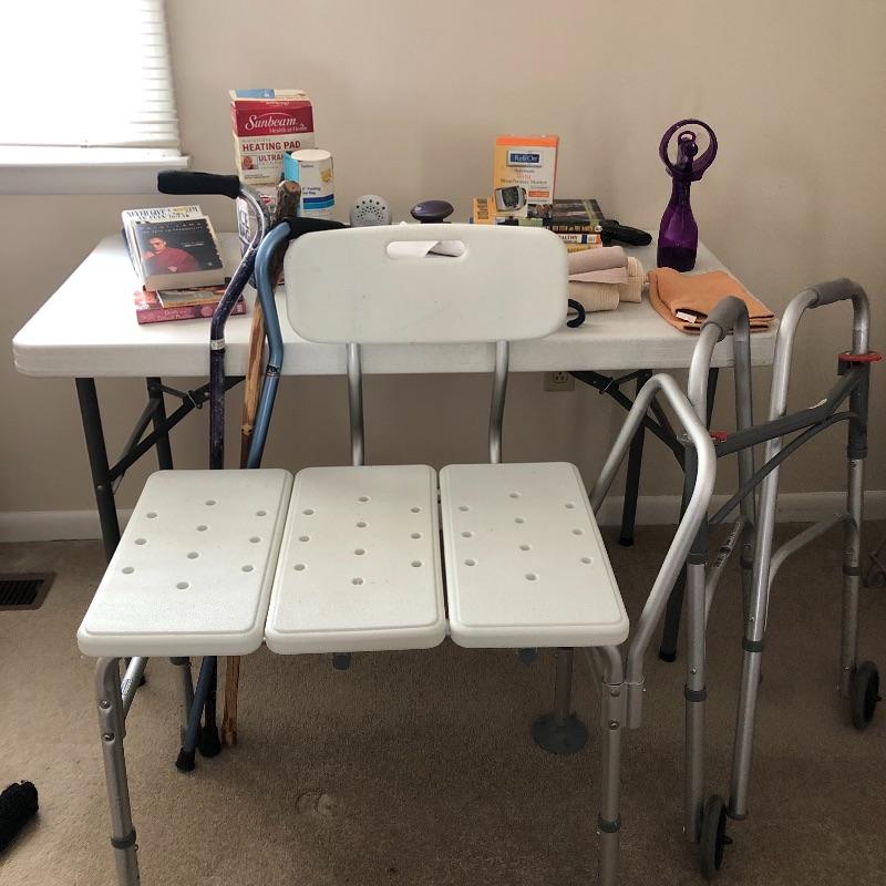 Maintain your health with this lot! This lot includes a folding walker, an adjustable shower bench, three walking sticks, a heating pad, two ice bags, a safety monitor, blood pressure monitor, numerous books on financial and health well being, elastic wrap bandages and more. Local pick up only.