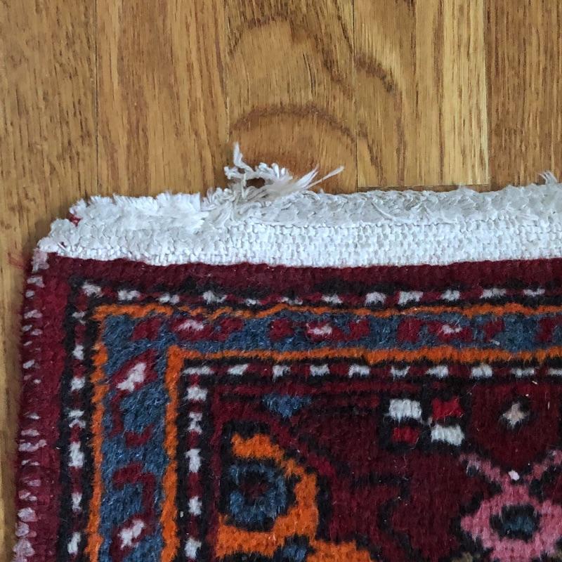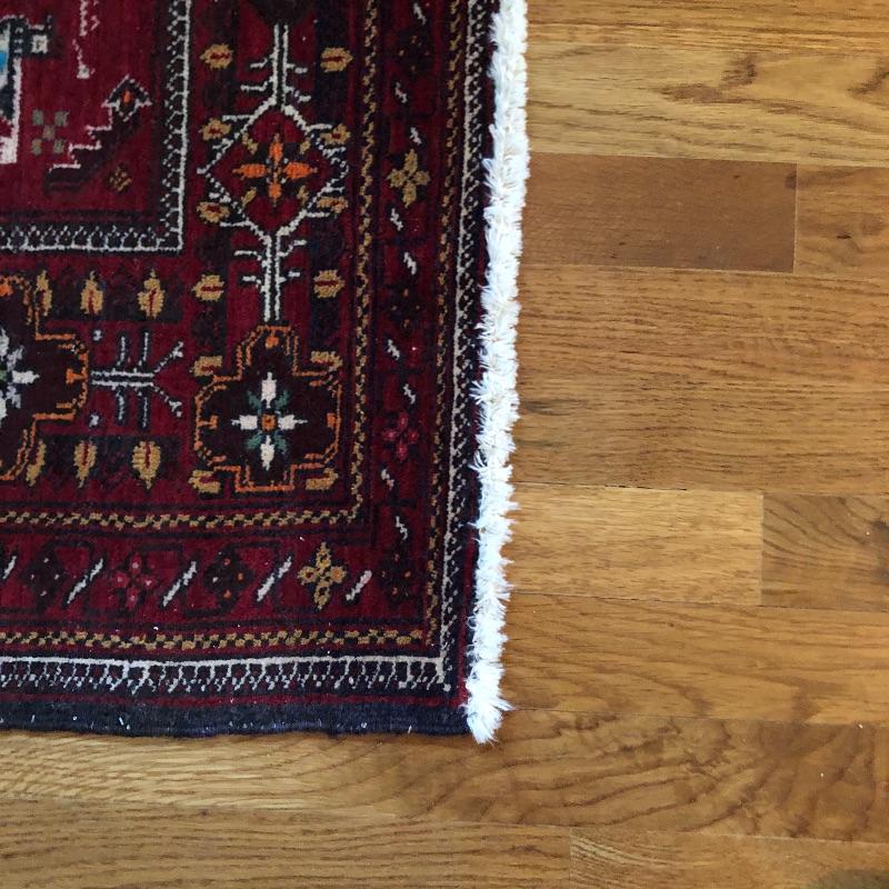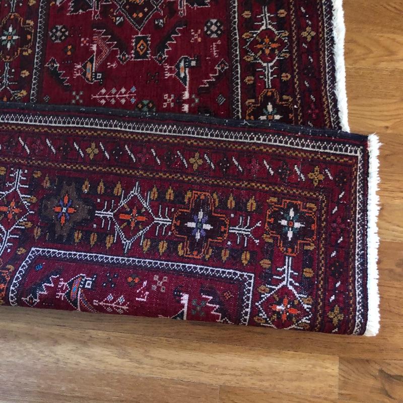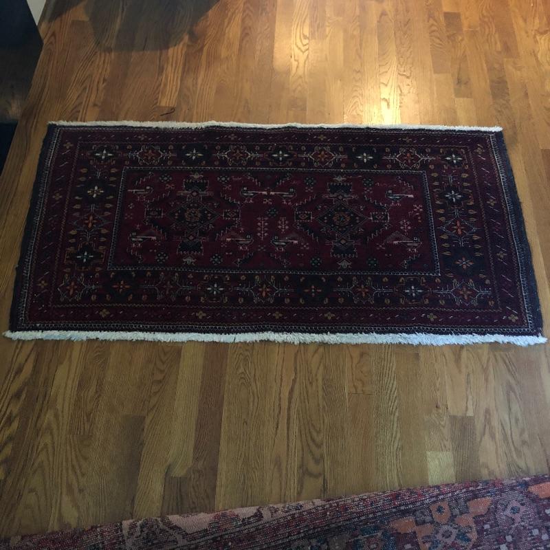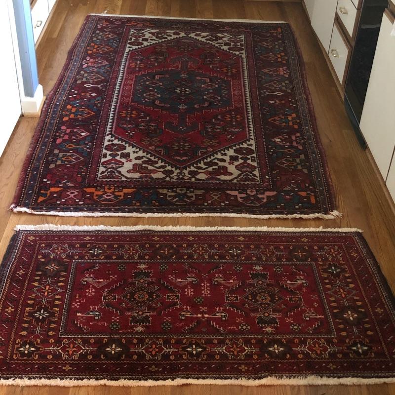 These two area rugs compliment each other well. The larger rug was made in Iran and is a beautiful dark red Oriental style rug that measures 54” x 85”; it has lost most of its fringe, see images. The smaller rug measures 29” x 53” and it’s fringe which also has mostly gone is on the long sides of the rug as opposed to the usual ends. It comes with a piece of non-slip piece.