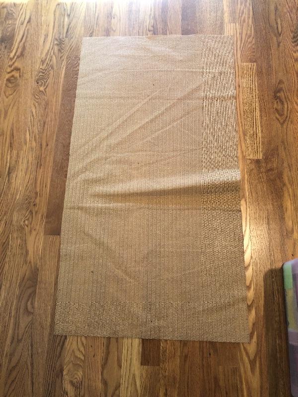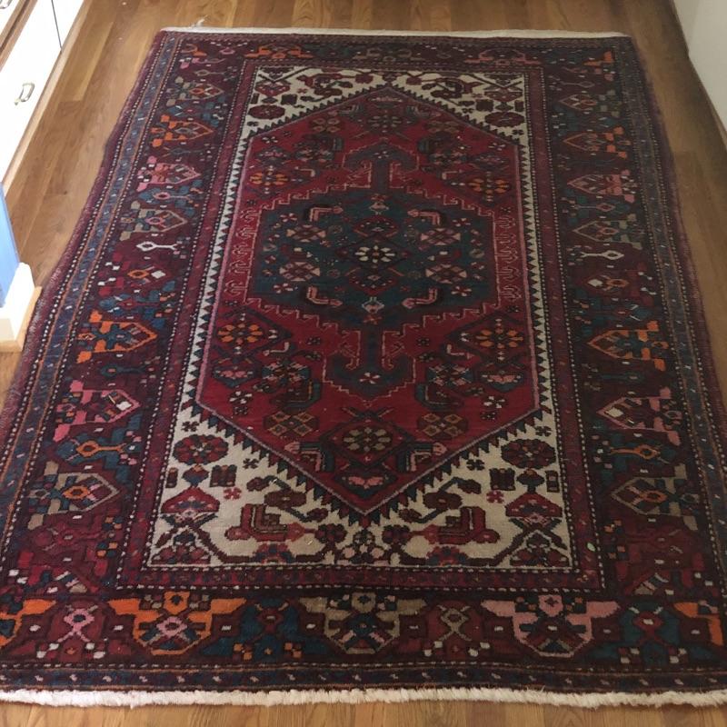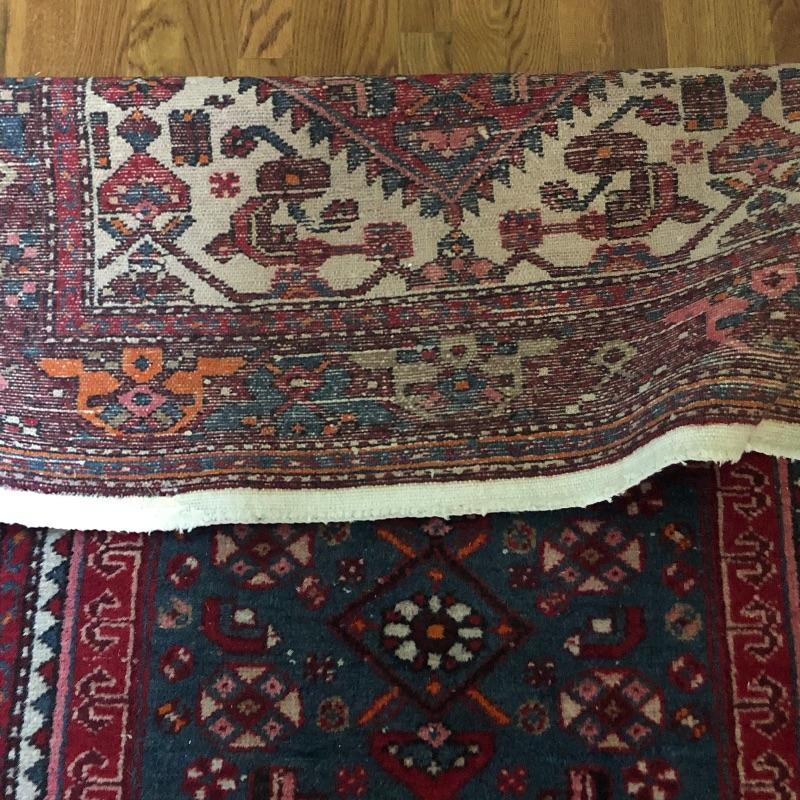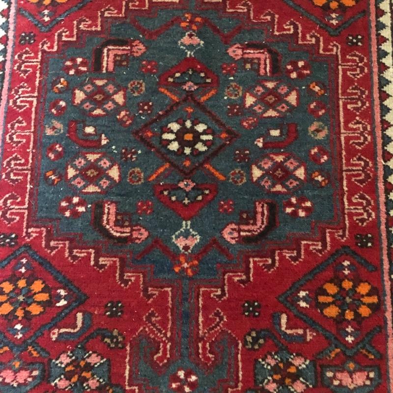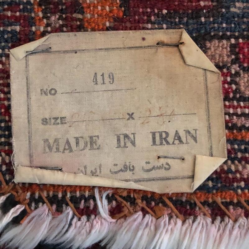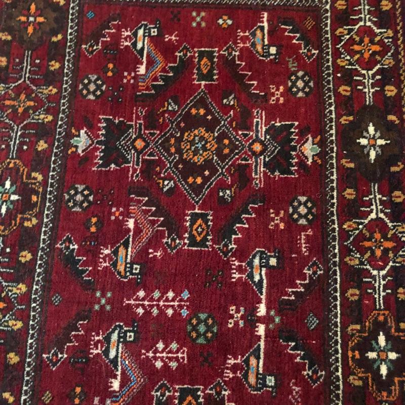 These two area rugs compliment each other well. The larger rug was made in Iran and is a beautiful dark red Oriental style rug that measures 54” x 85”; it has lost most of its fringe, see images. The smaller rug measures 29” x 53” and it’s fringe which also has mostly gone is on the long sides of the rug as opposed to the usual ends. It comes with a piece of non-slip piece.