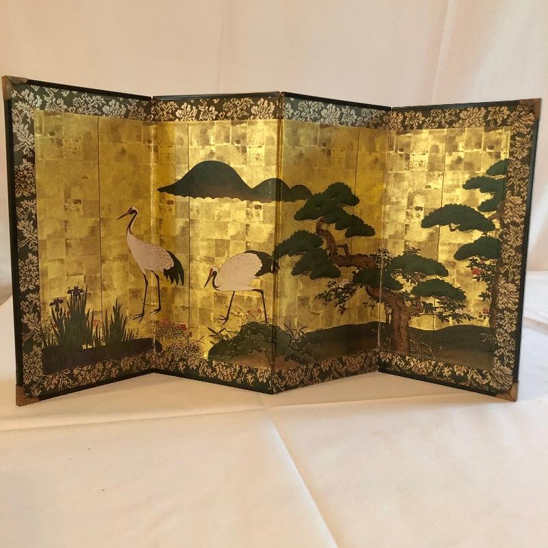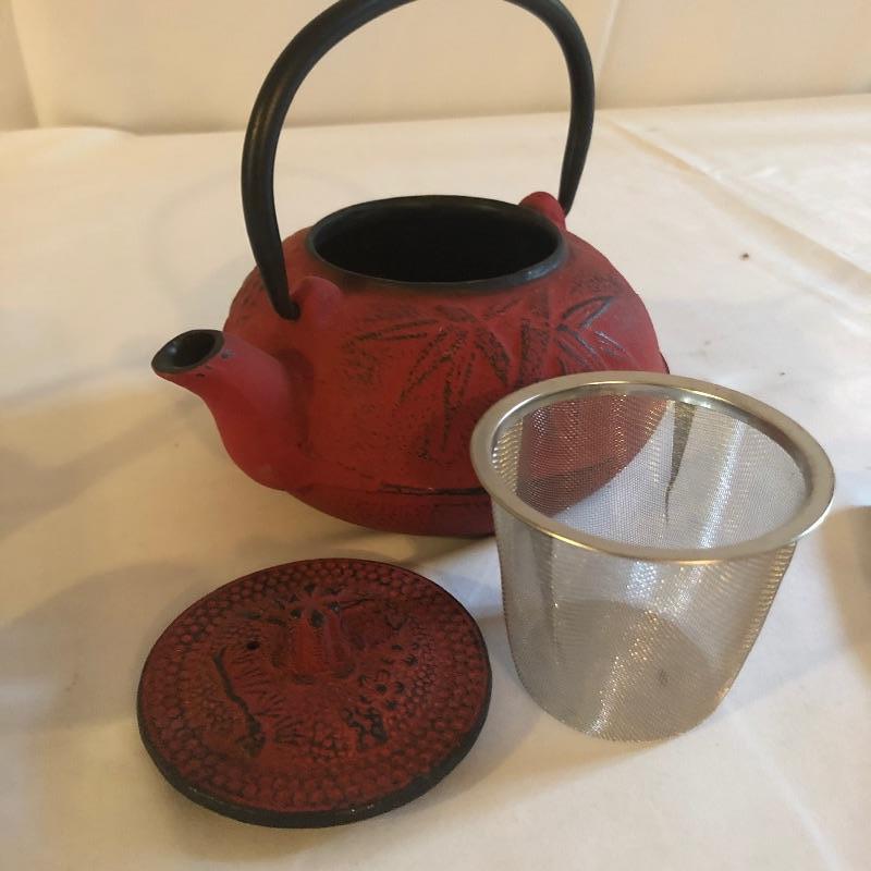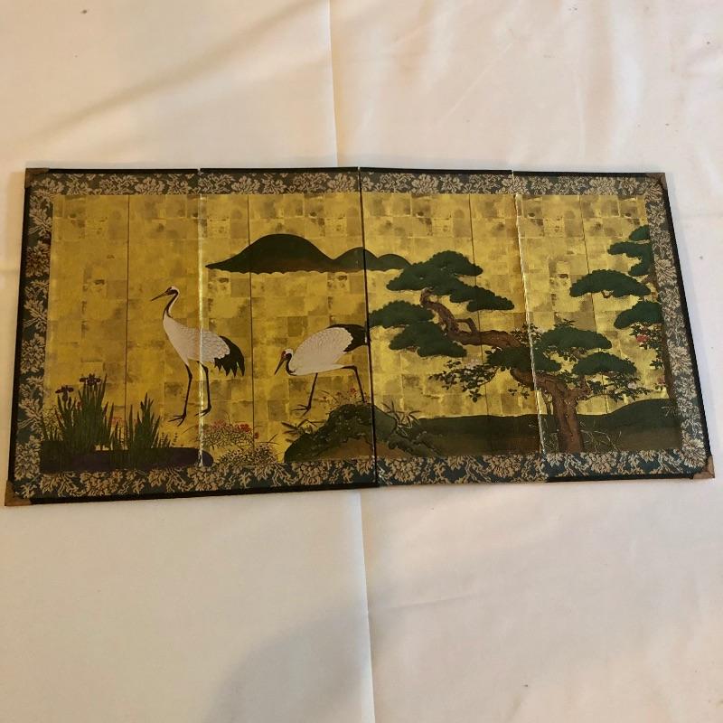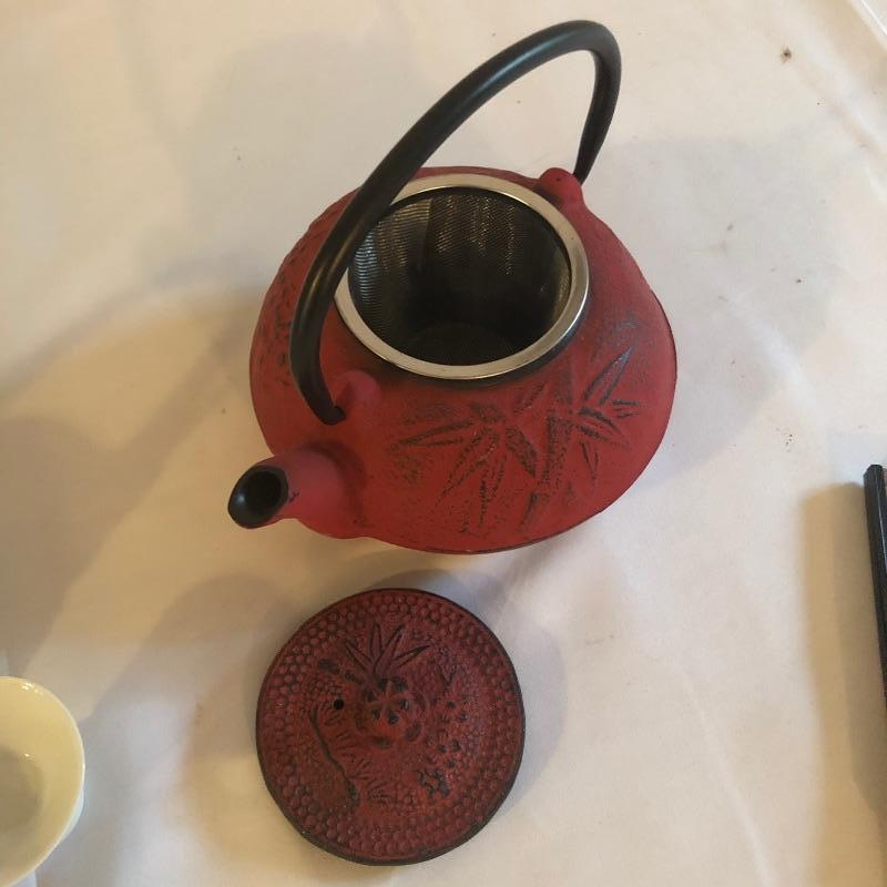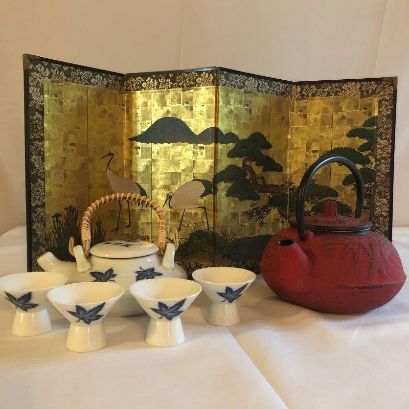 This lot contains some lovely Japanese items that includes a 5 piece tea set, an additional tea pot and a miniature folding screen. The vintage screen measures 18” x 9” and appears to be hand painted; it’s a delightful piece of art with two sand cranes on a gold painted background trimmed with a fabric edge. There are minor signs of aging that includes some sun bleaching on the back and a few worn areas on the front, the last few images show this. The smaller of the 2 teapots comes with 4 matching very small cups. The additional red teapot is cast iron and has a built in strainer.