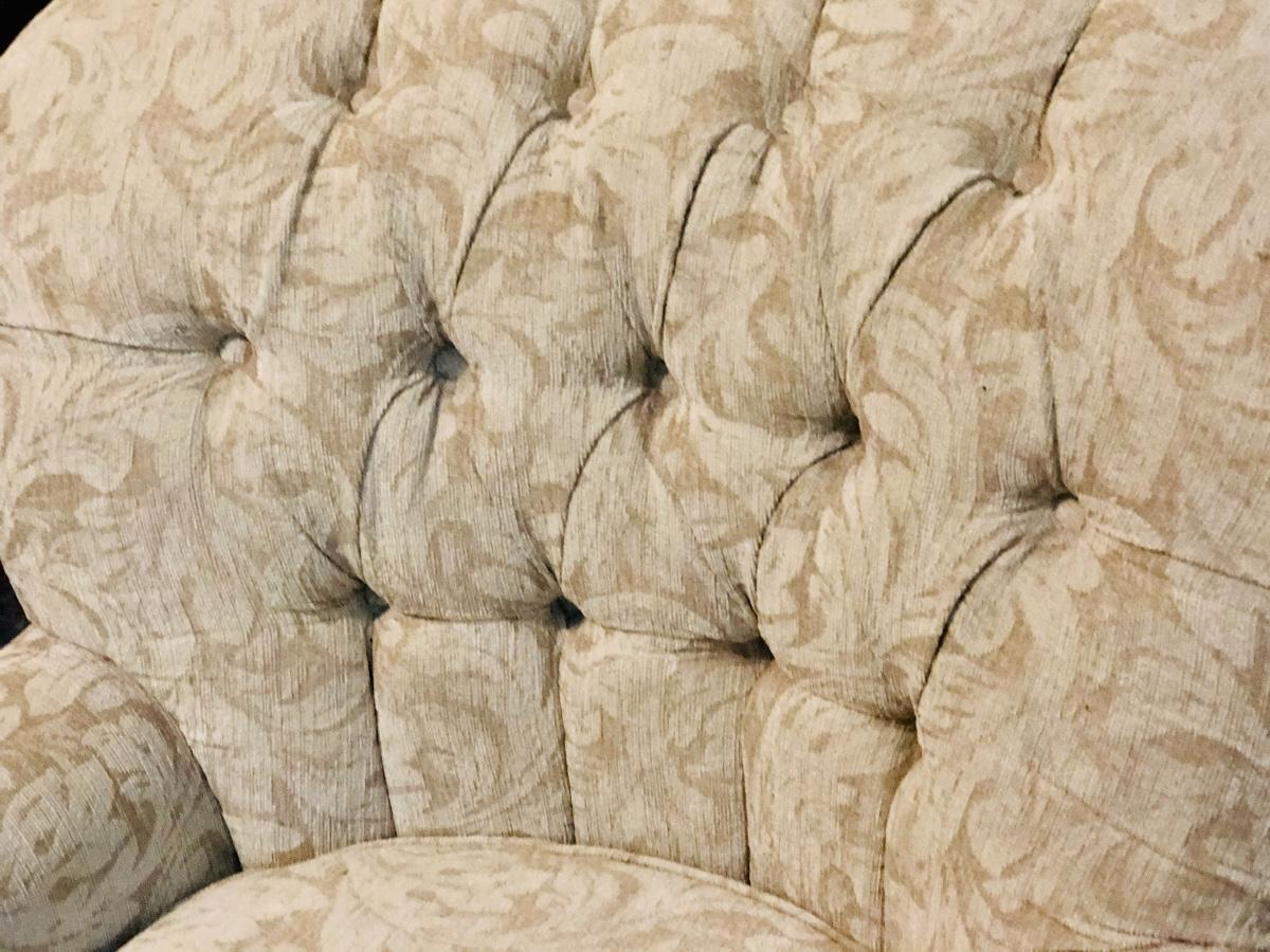 This bench made pair of chairs was made by LA manufacturer, Krause. Stain master treated chenille with a damask design. Tufted back is pretty & comfortable. Sold as a pair- a bargain! (Live near Rocklin? Ask us about our reasonable delivery fee.)