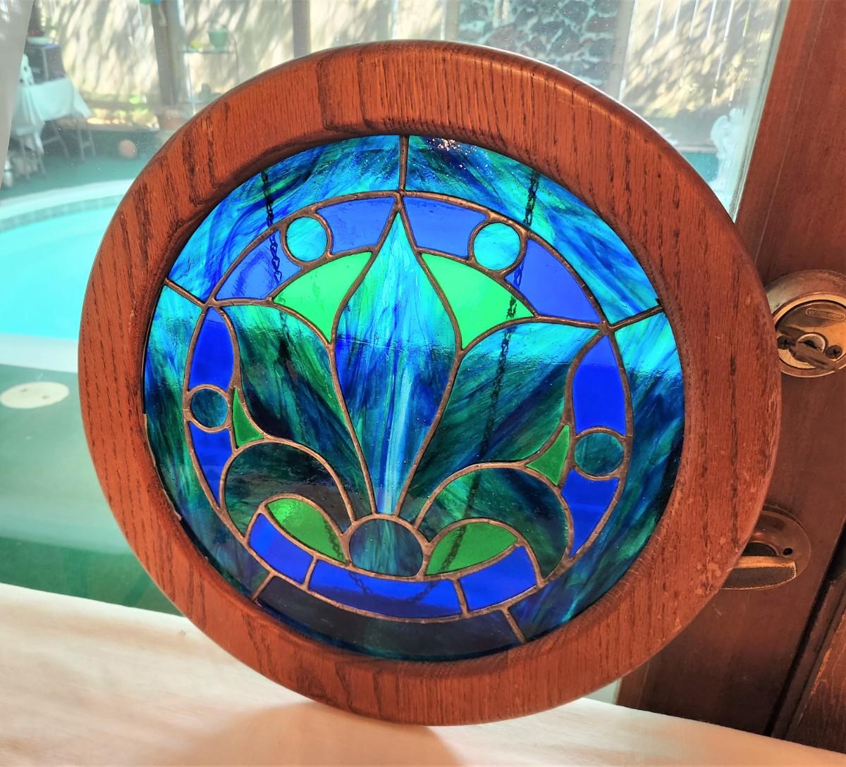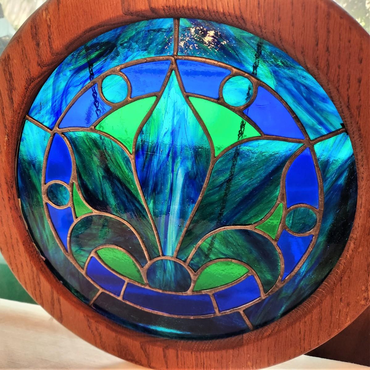 Oak frame with hanging chains - pretty leaded stained glass sun catcher featuring a stylized Fleur di Lis. 17" across - beautiful!