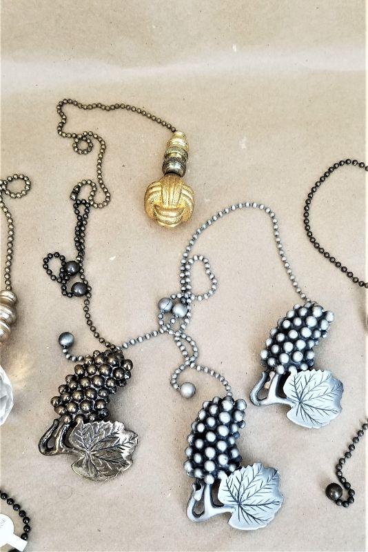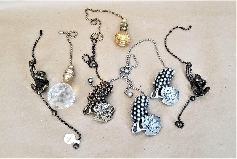Lot of 7 nice decorator light or ceiling fan pulls - two monkeys, three grape bunches, one faceted crystal, one gold-tones sphere. Each measures about 12.5 inches long. Price is for the whole group. All made of metal. At a lighting store, these average $12-15/each.