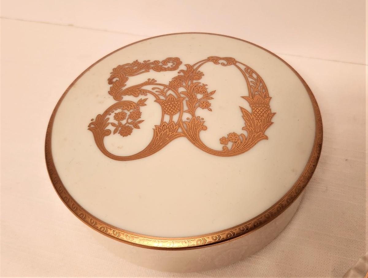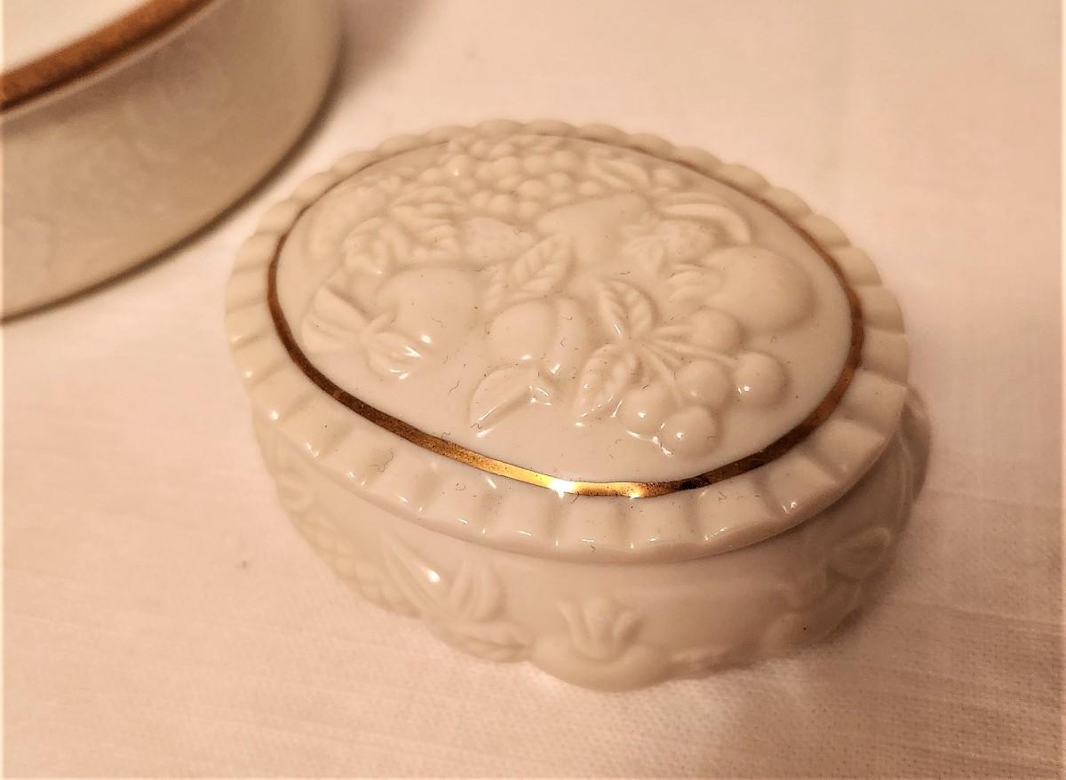 Large Mikasa 50th anniversary trinket box, 5.5" across - along with a Lenox 1998 floral porcelain box, 3" across. Both in good condition.
